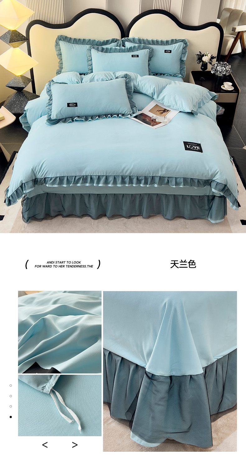 (总)找底底家纺 2024新款水洗真丝床裙款夏被四件套床品套件,宝石蓝,深韵灰,水绿色,深紫色,素颜兰,豆沙色,晴空白