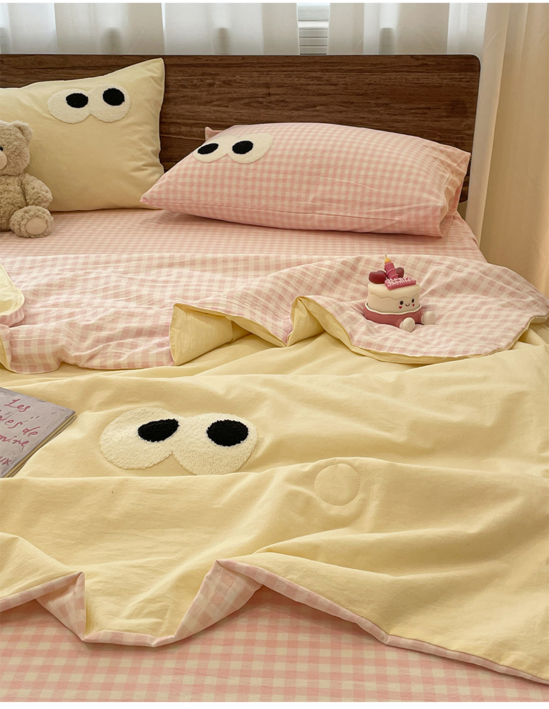 桃心家居 2025新款云柔水洗棉毛巾绣大豆单夏被夏被四件套 水洗棉-大眼睛夏被奶黄粉小格