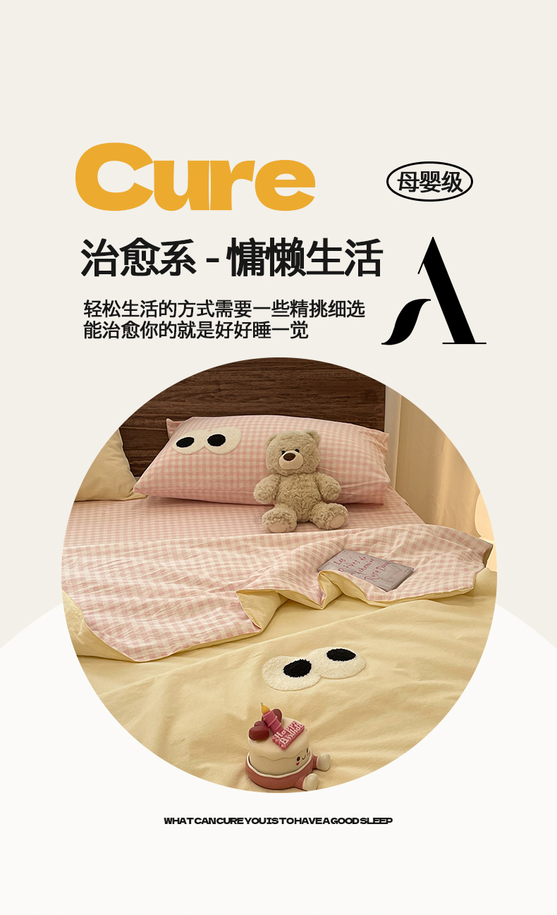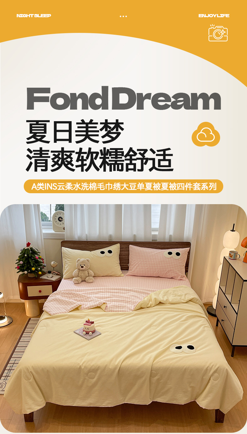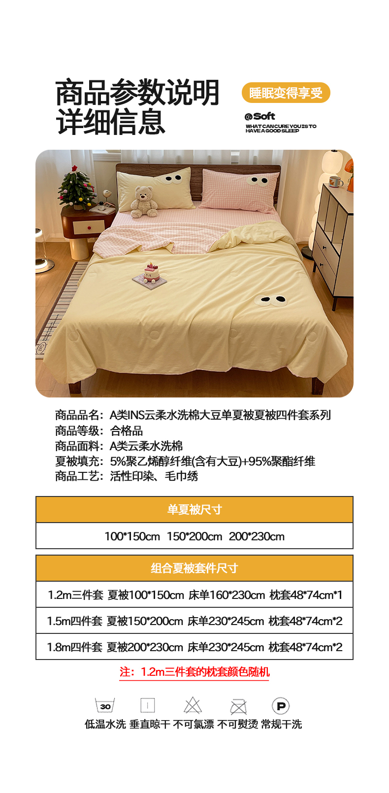 • 91家纺网 家纺一手货源 找家纺 桃心家居 2025新款云柔水洗棉毛巾绣大豆单夏被夏被四件套 水洗棉-大眼睛夏被奶黄粉小格
