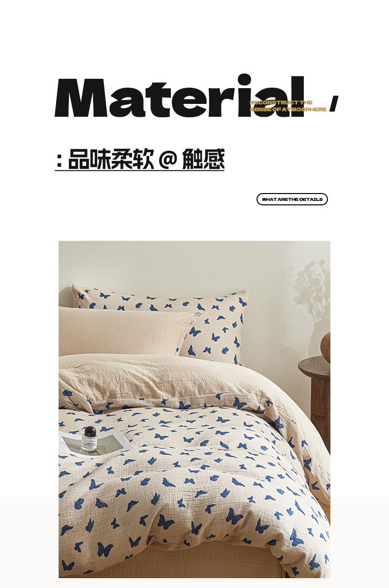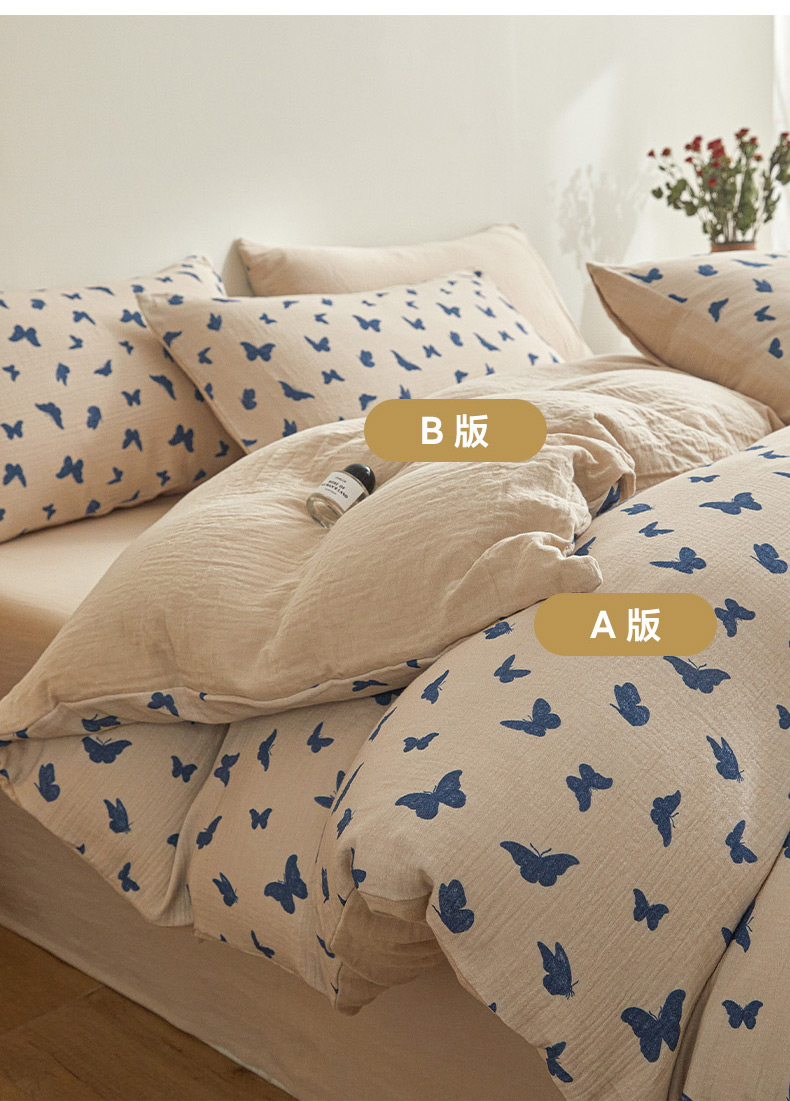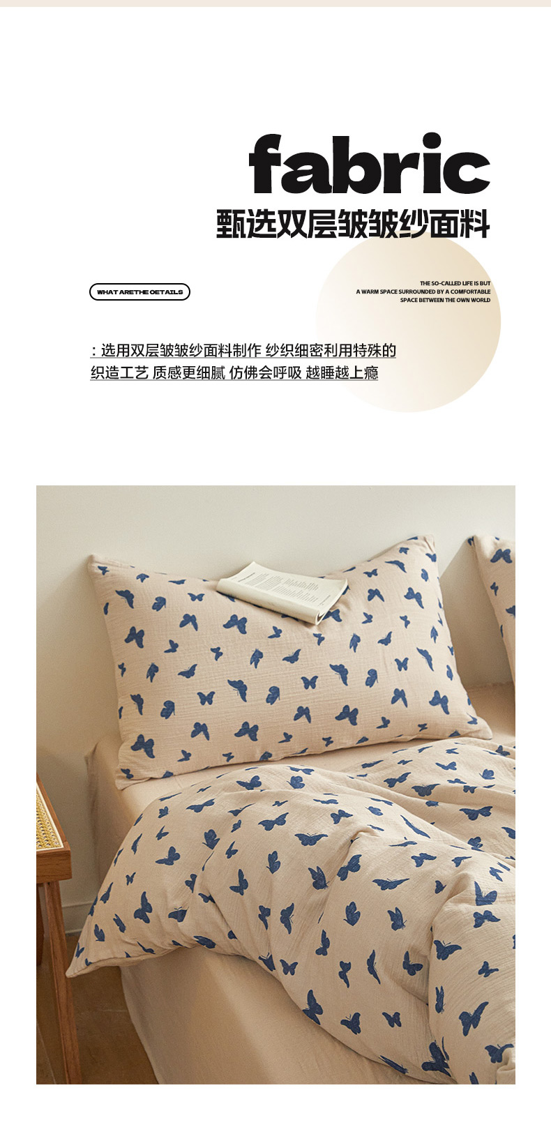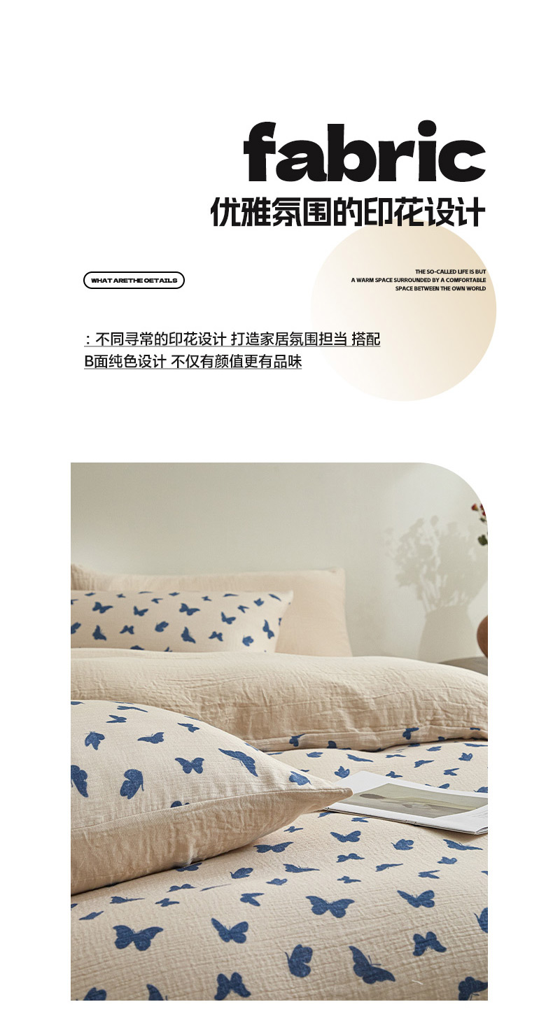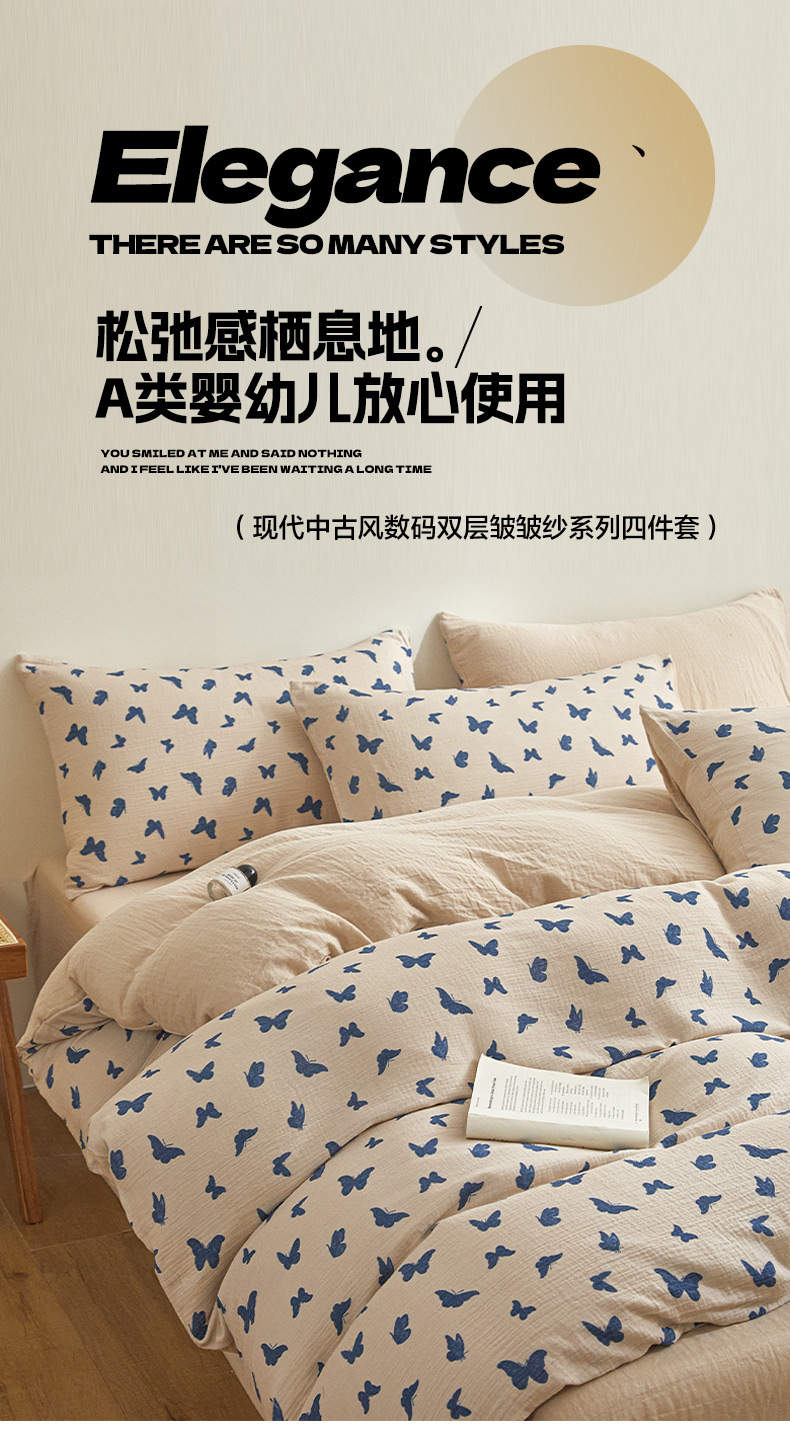 卡巴伦家纺 2025新款全棉双层皱皱纱现代中古风数码四件套 蝴蝶剪影-蓝