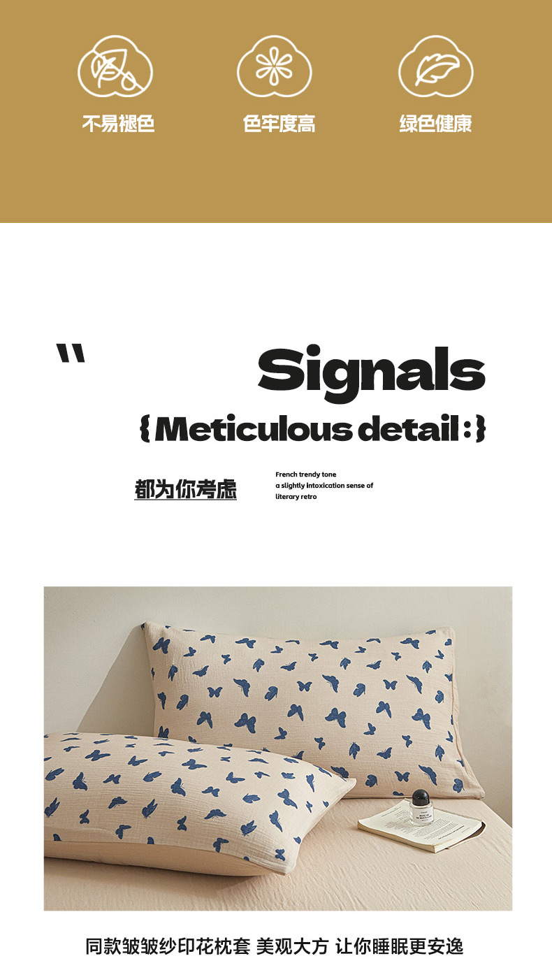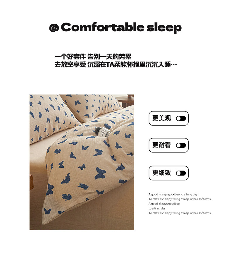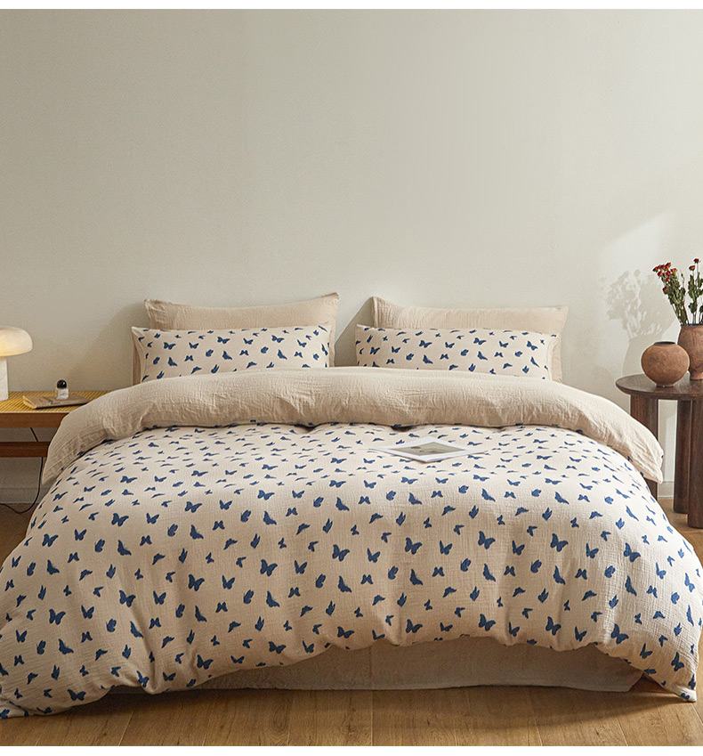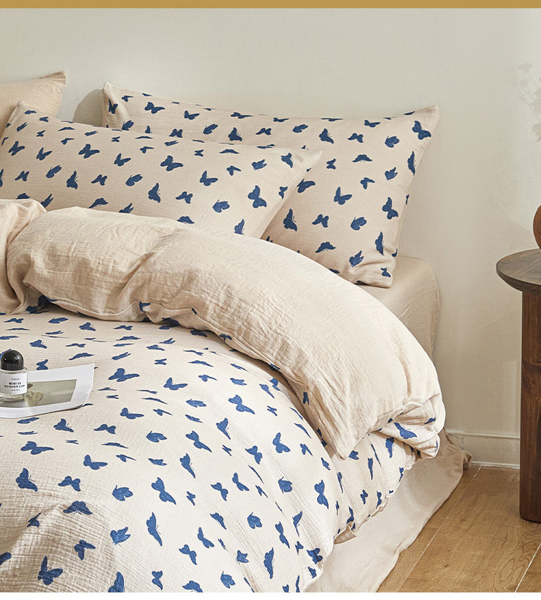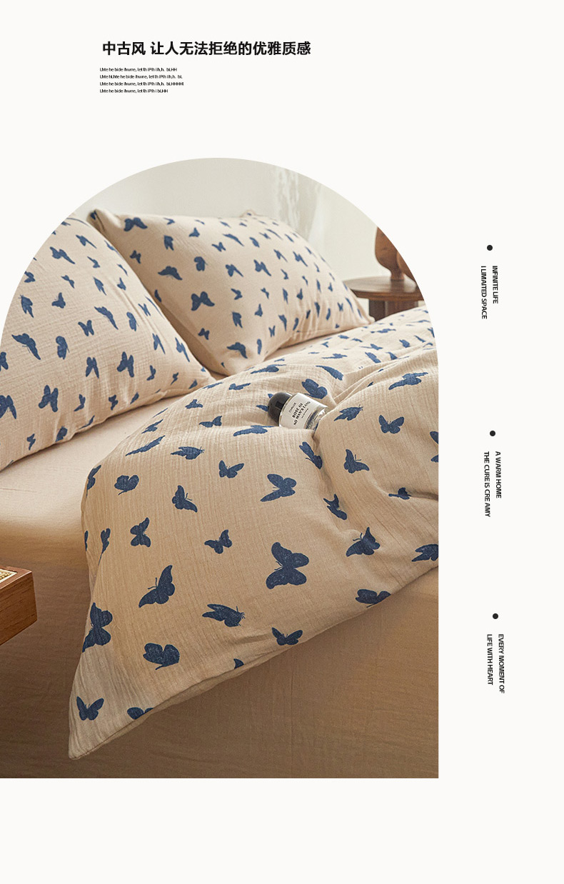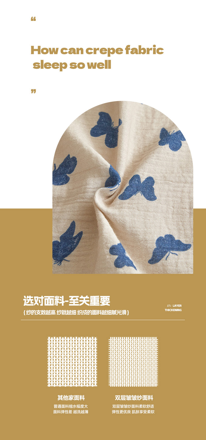 卡巴伦家纺 2025新款全棉双层皱皱纱现代中古风数码四件套 蝴蝶剪影-蓝