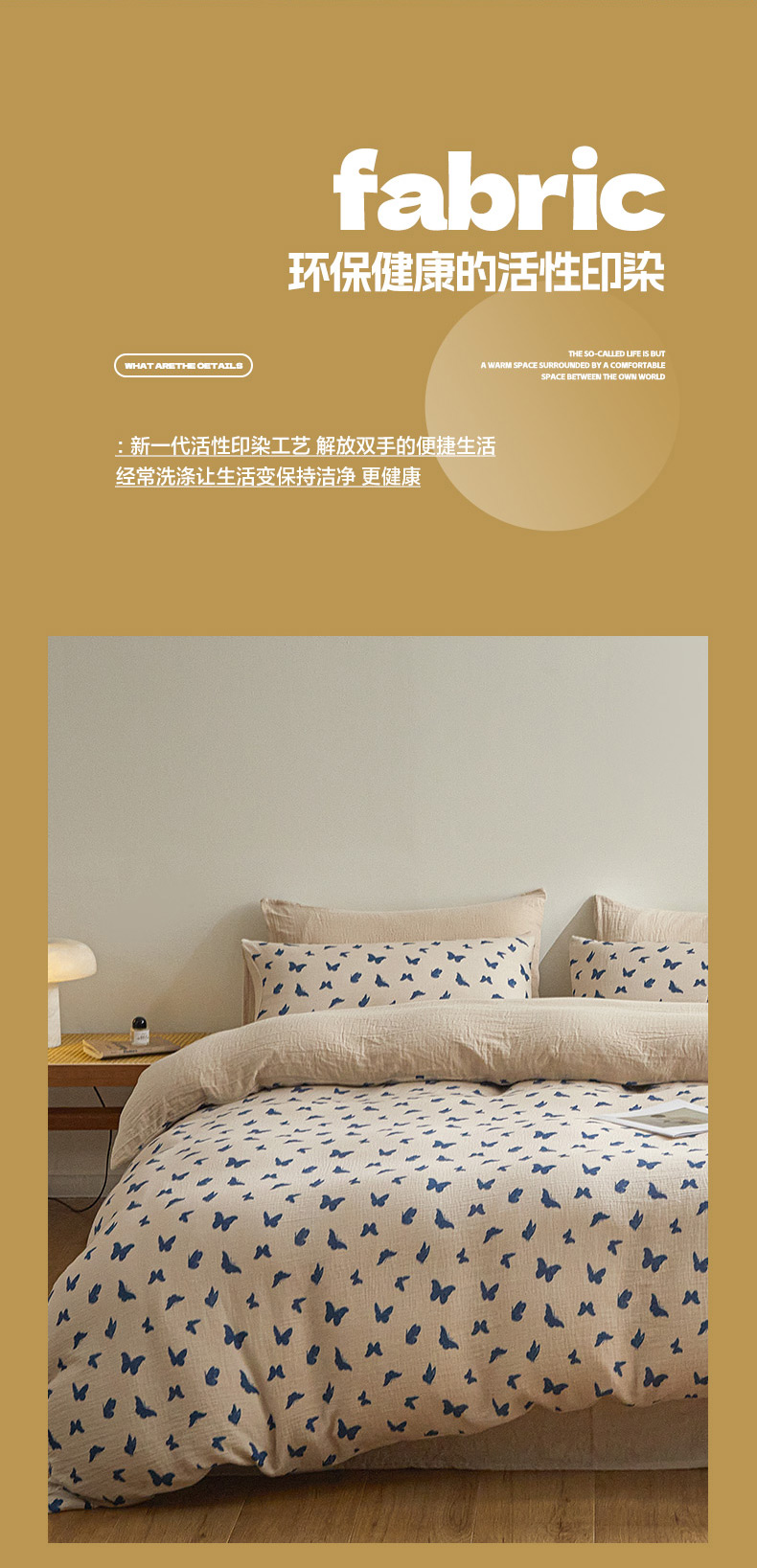 商品名称:卡巴伦家纺 2025新款全棉双层皱皱纱现代中古风数码四件套 蝴蝶剪影-蓝