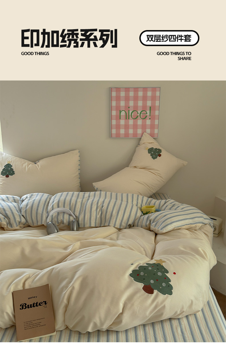 当前位置: 91家纺网 > 商品网购 > 床品套件 > 四件套 > 双层纱四件套 > 莱登卡奴 2025新款A类全棉双层纱印加绣呆萌系列四件套 呆萌圣诞树