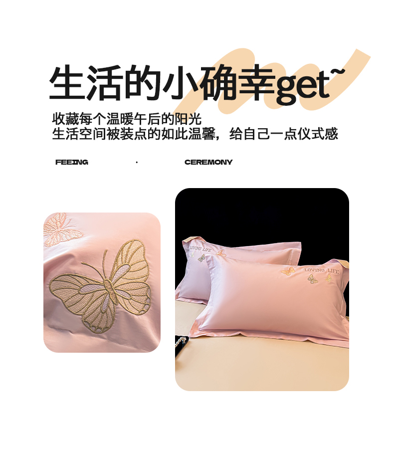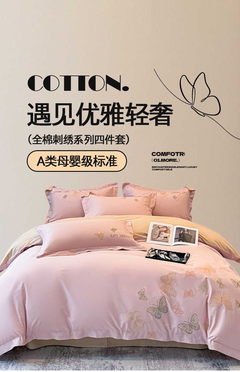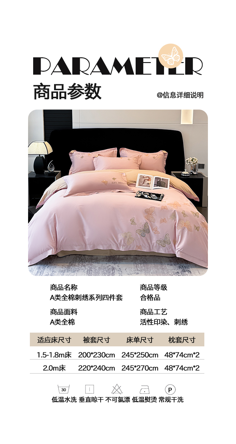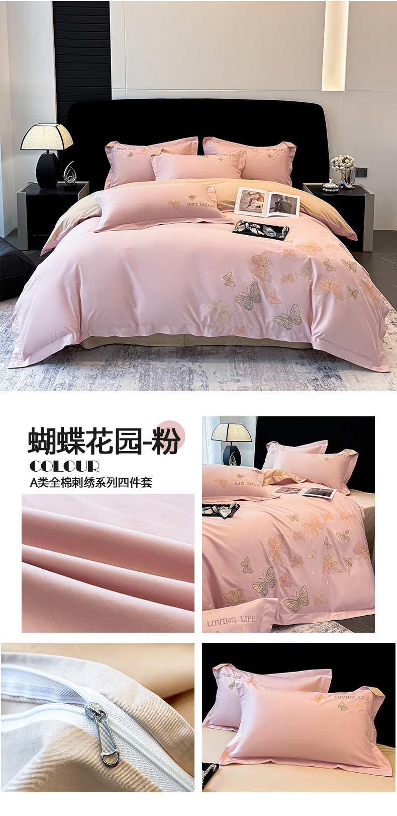 商品名称:典曼家纺 2025新款 A类高精密40支13374喷气绣花四件套 【带礼盒】 蝴蝶花园-粉