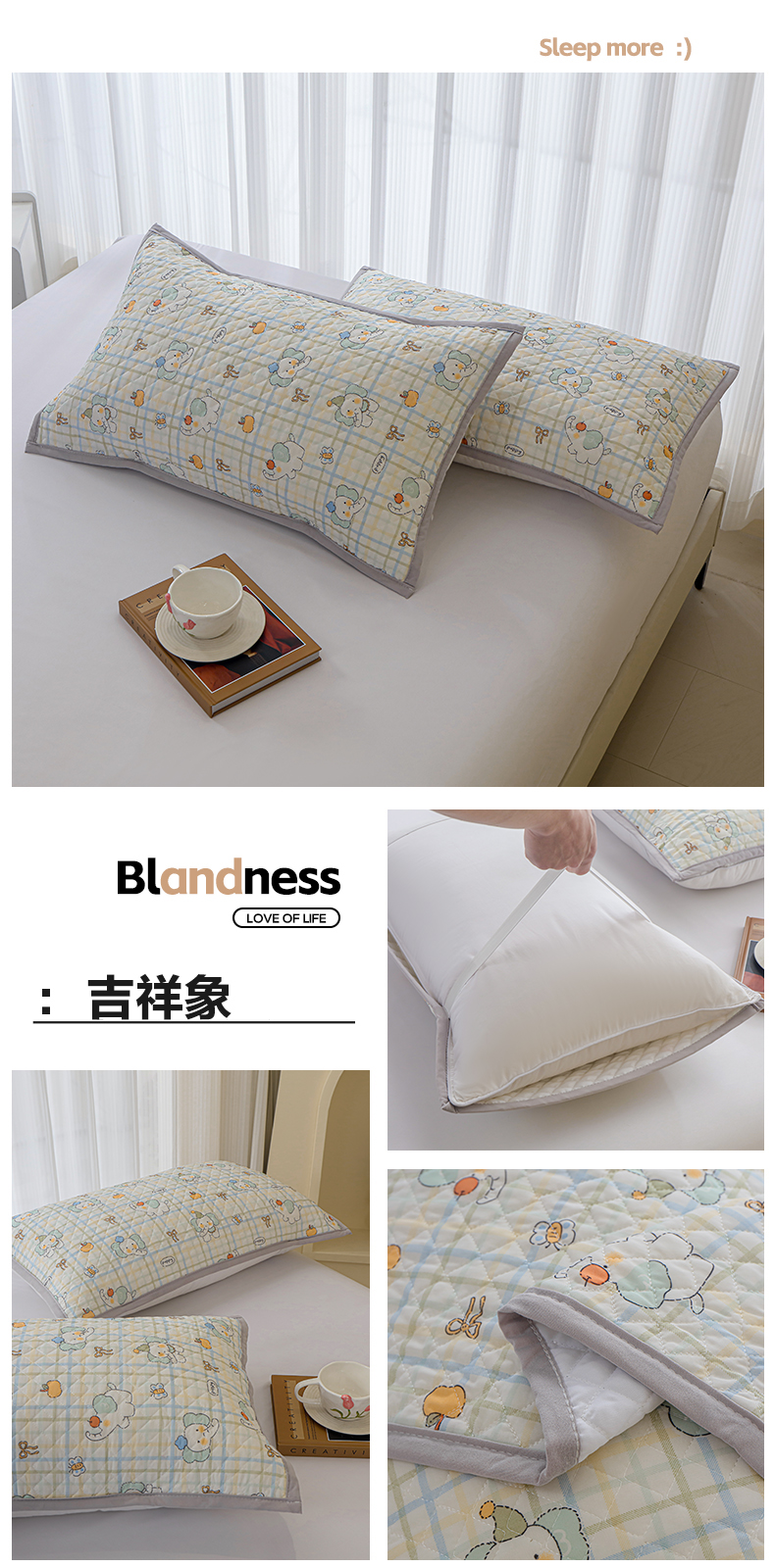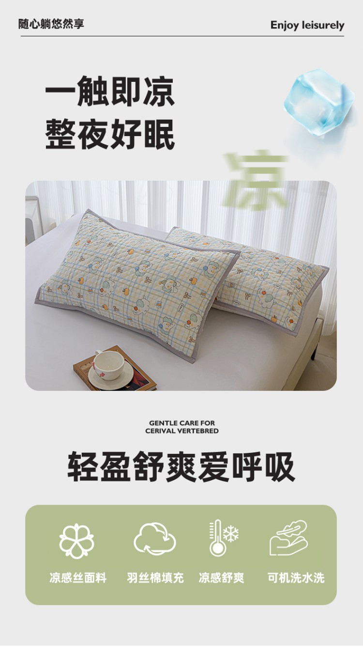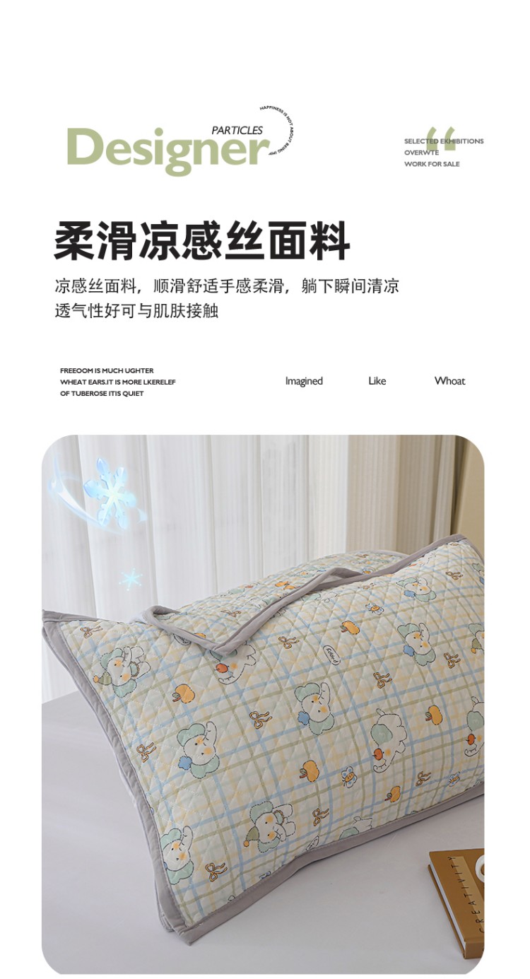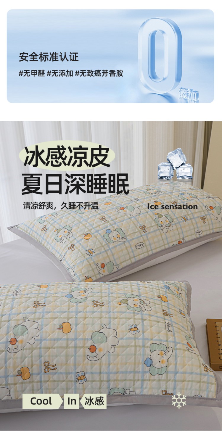 商品名称:美宜家 2025新款夏季凉感丝绗缝绑带枕巾隔脏吸汗冰丝枕巾 吉祥象 一对