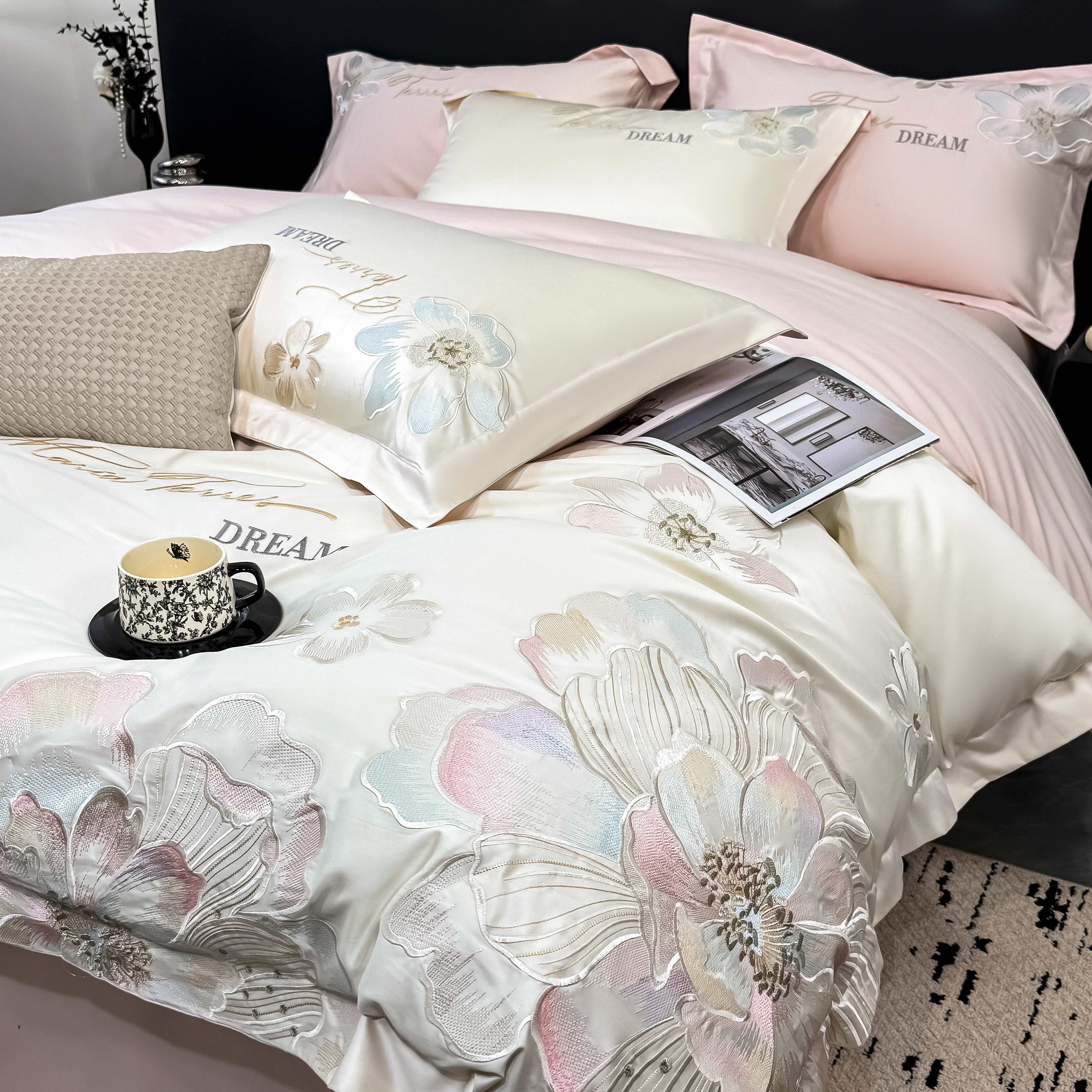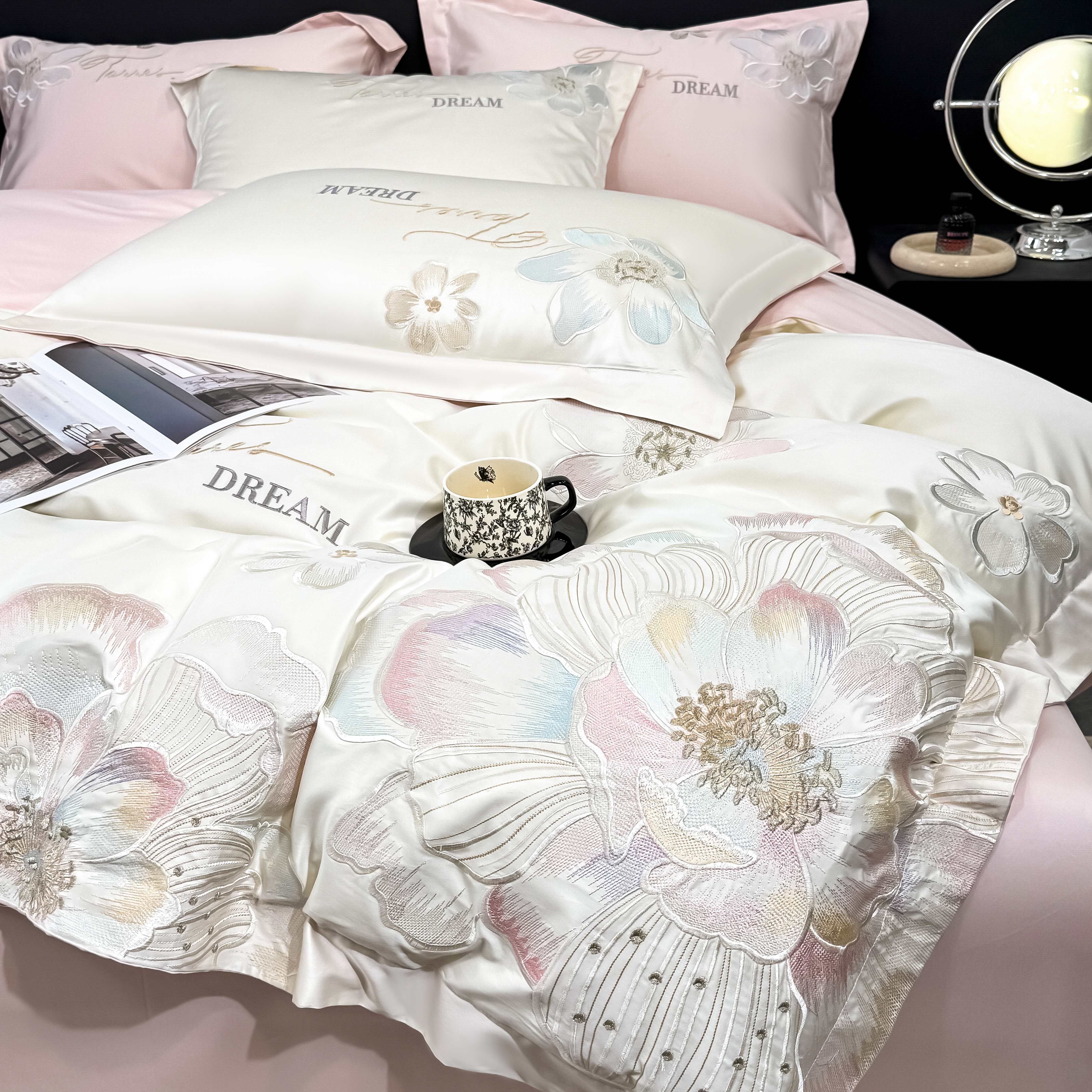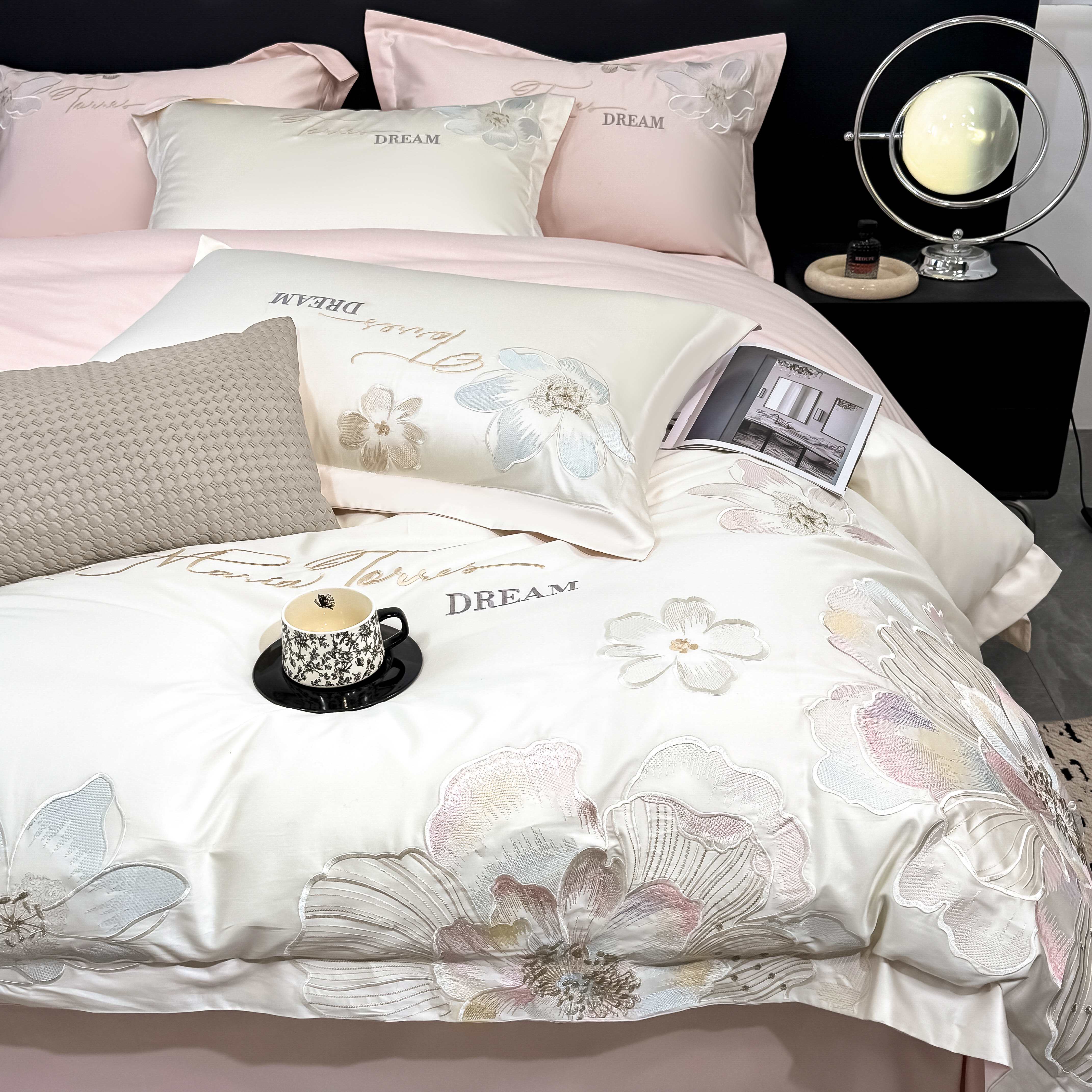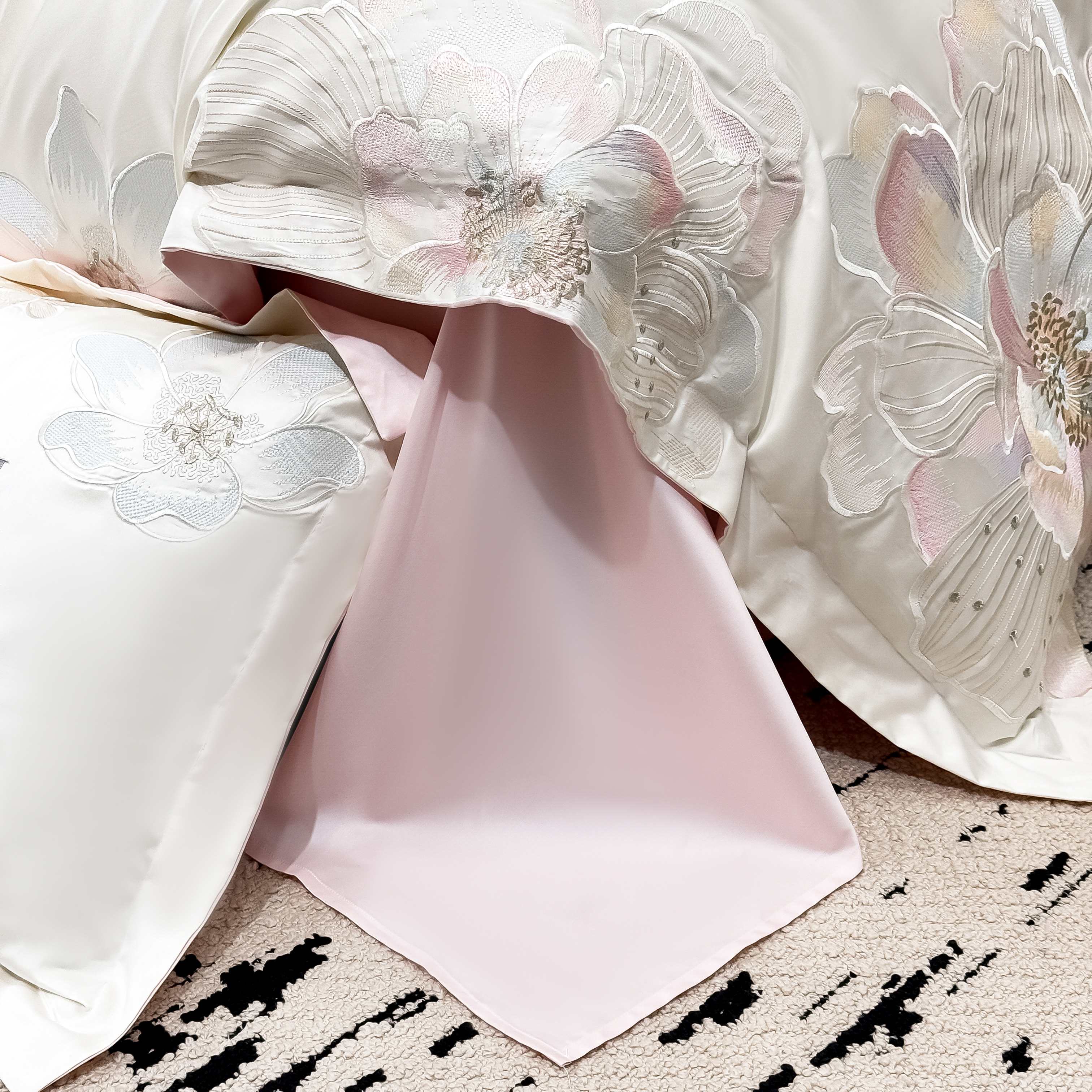 水云缦 2025新款春夏新款全棉贡缎纯棉刺绣四件套 繁华系列 繁花-白拼粉