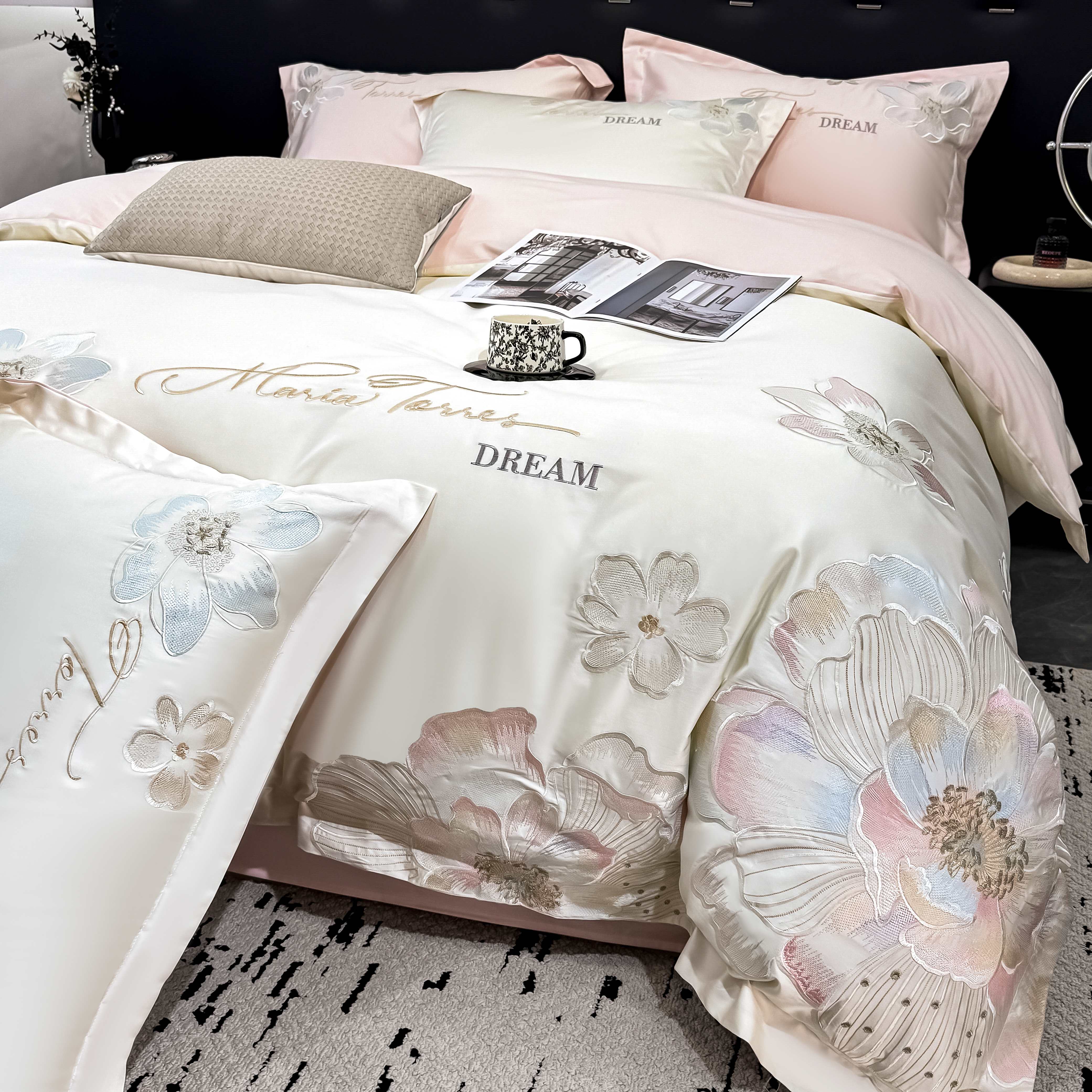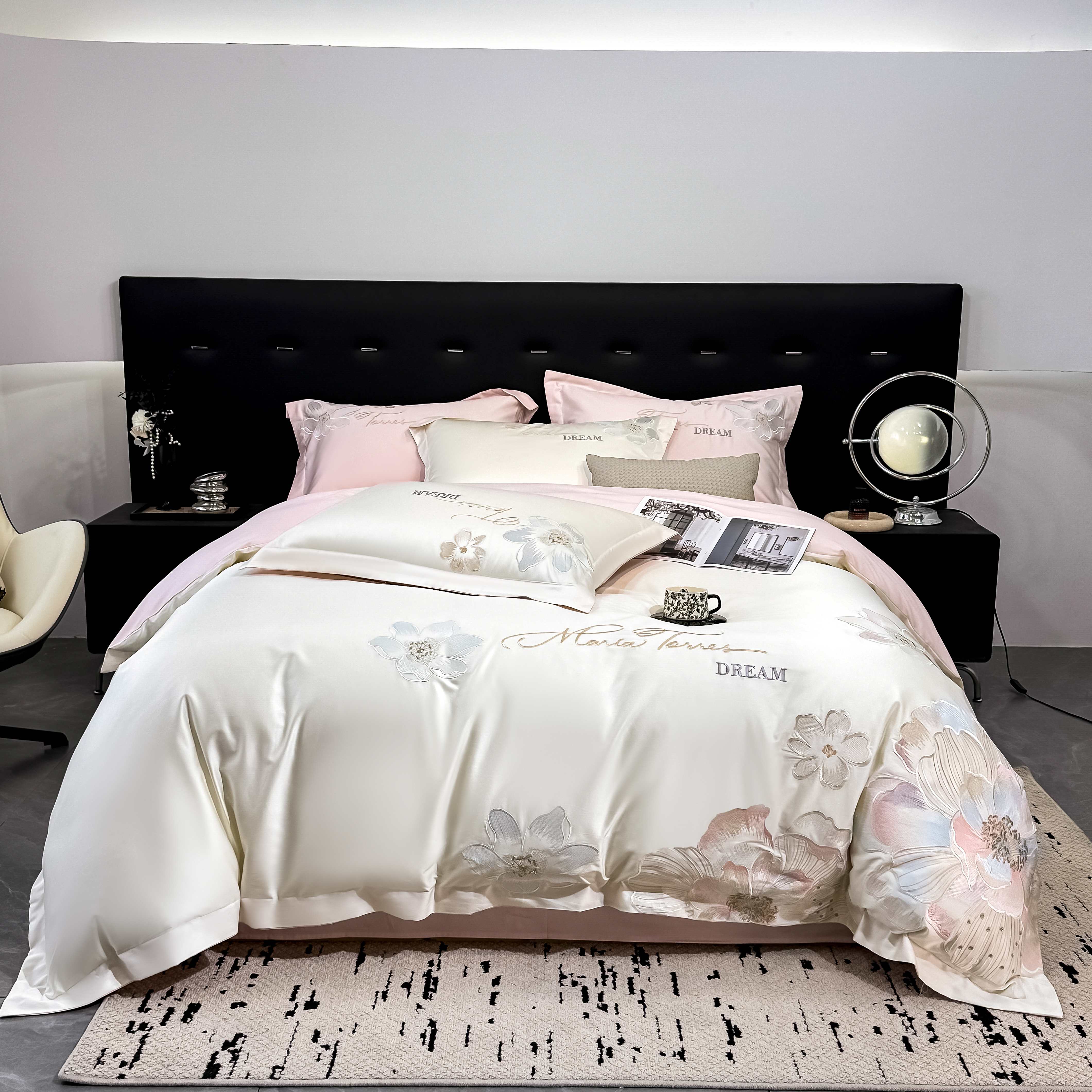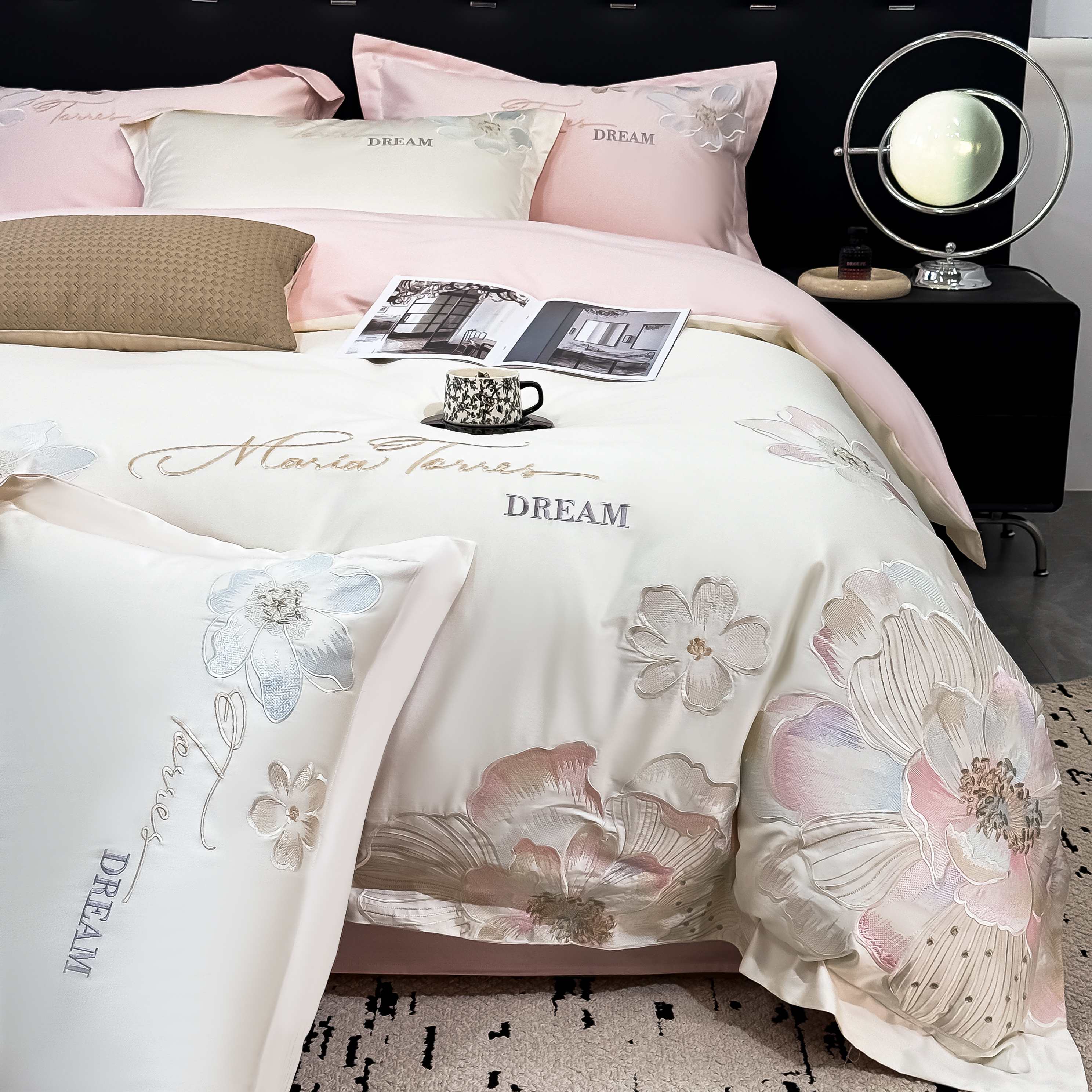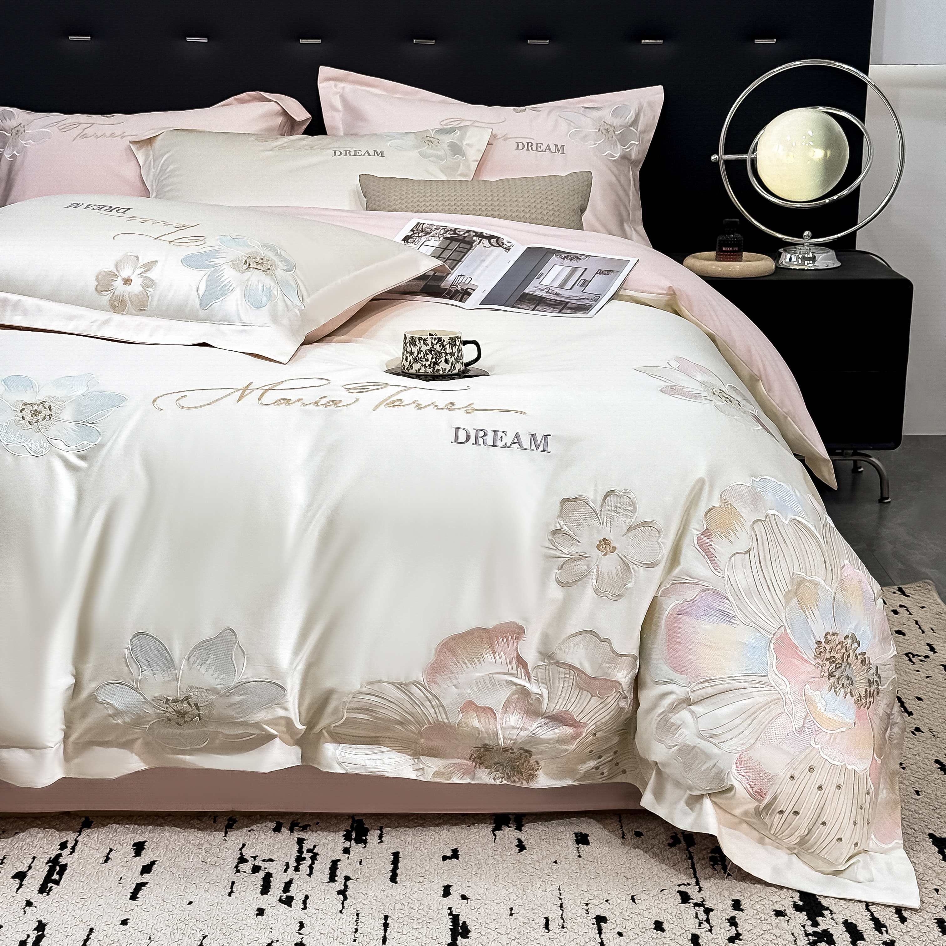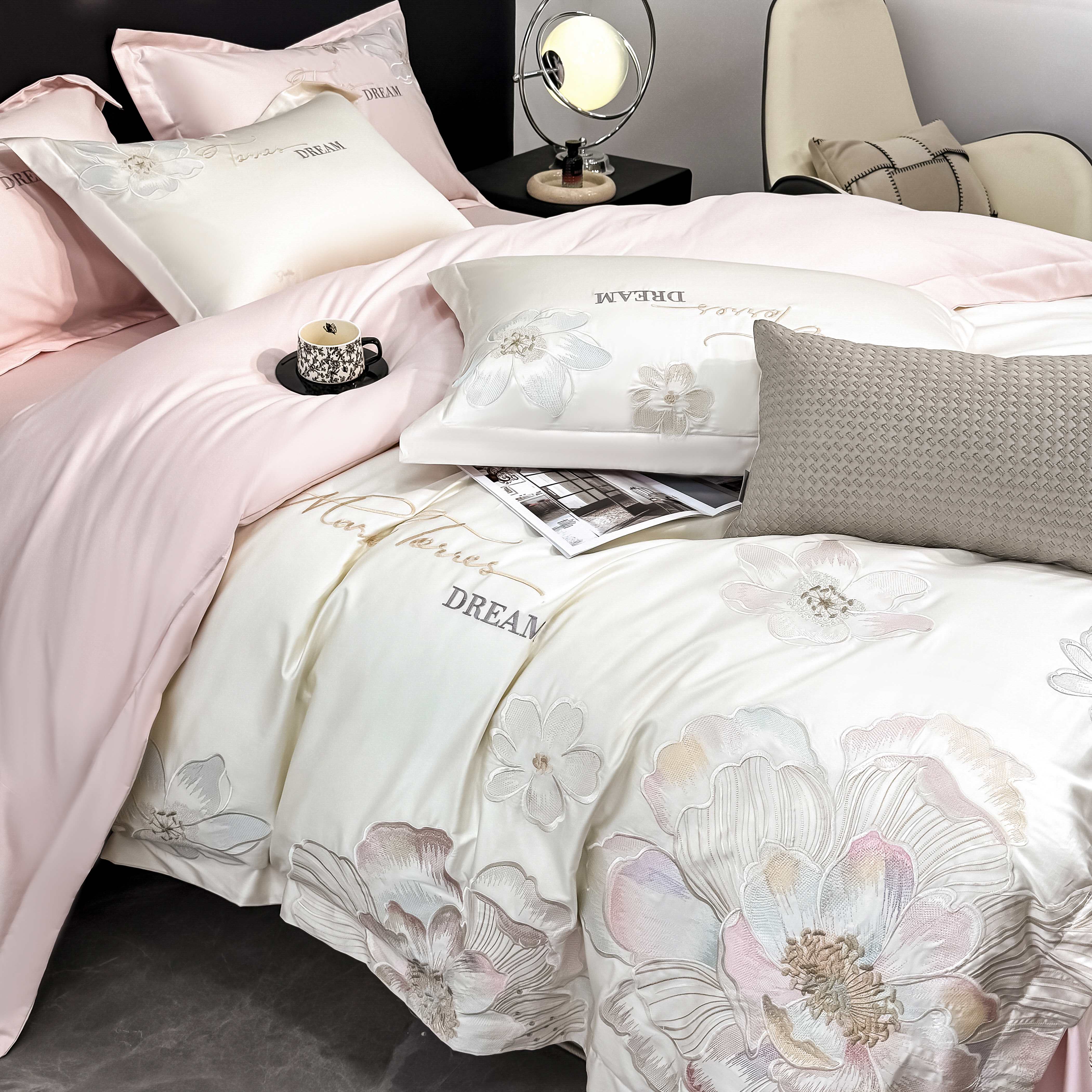 水云缦 2025新款春夏新款全棉贡缎纯棉刺绣四件套 繁华系列 繁花-白拼粉