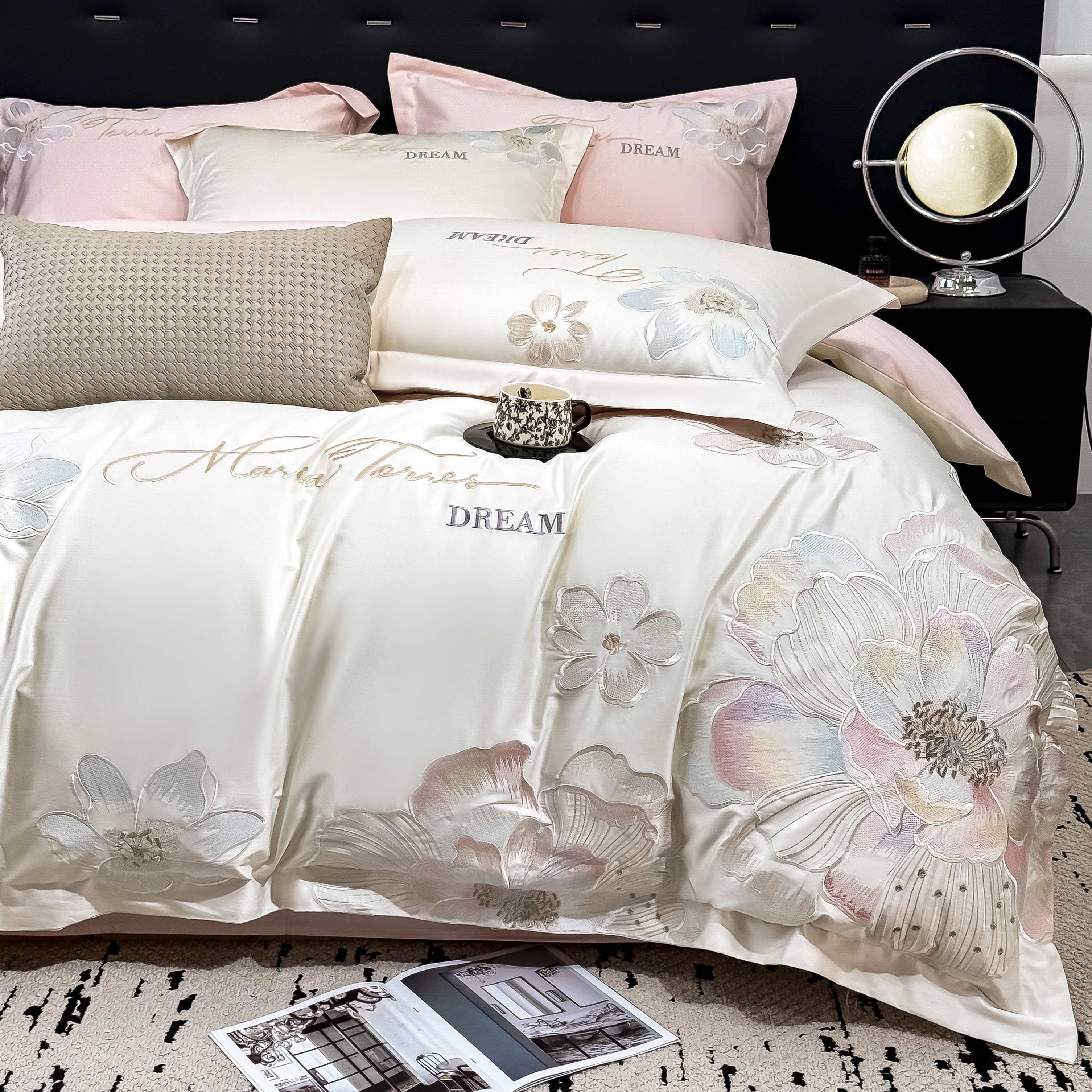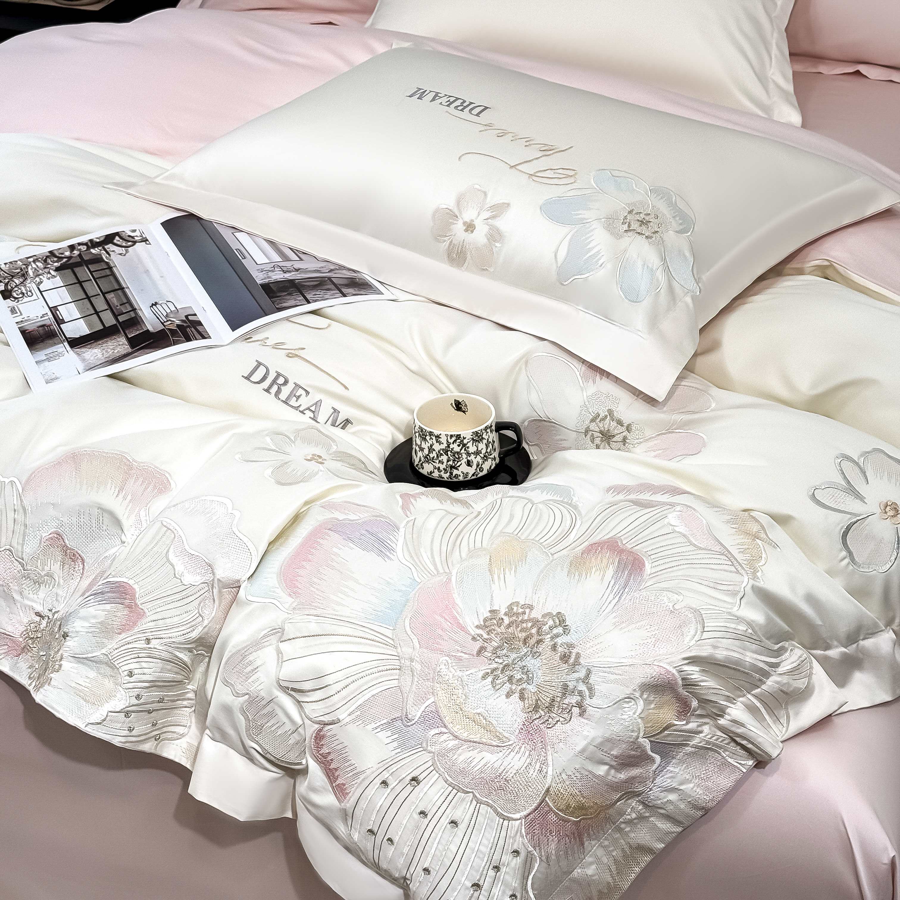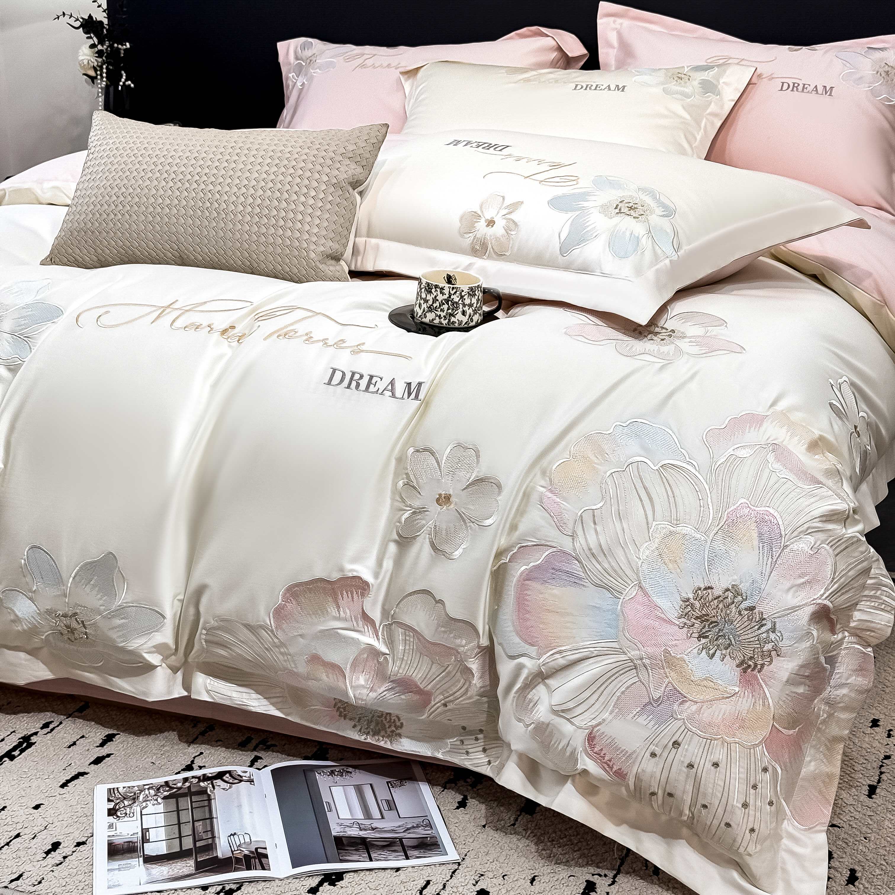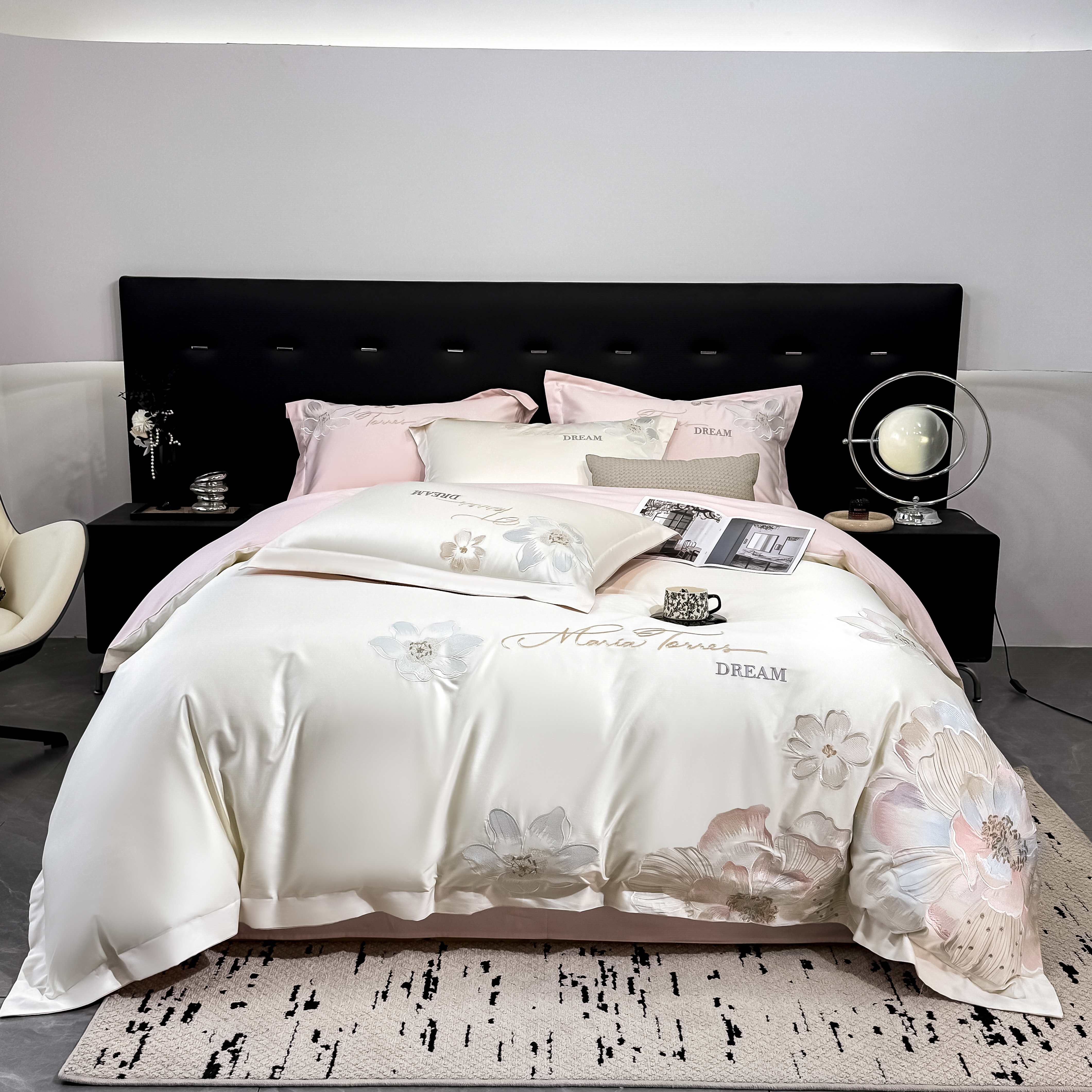 水云缦 2025新款春夏新款全棉贡缎纯棉刺绣四件套 繁华系列 繁花-白拼粉