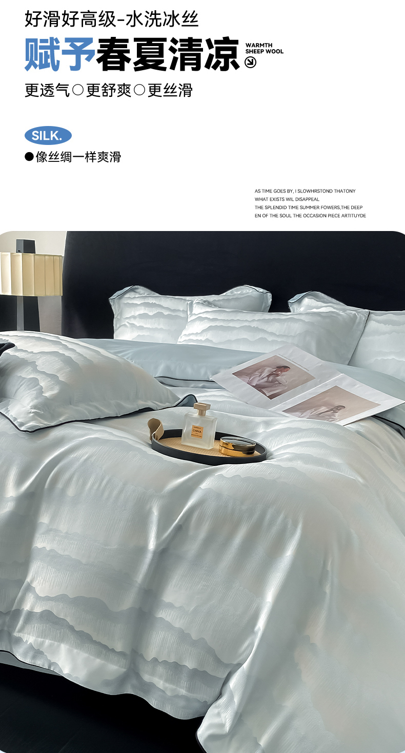 爱彼家纺 2025夏季新款高端水洗冰丝提花四件套 知夏碧海蓝