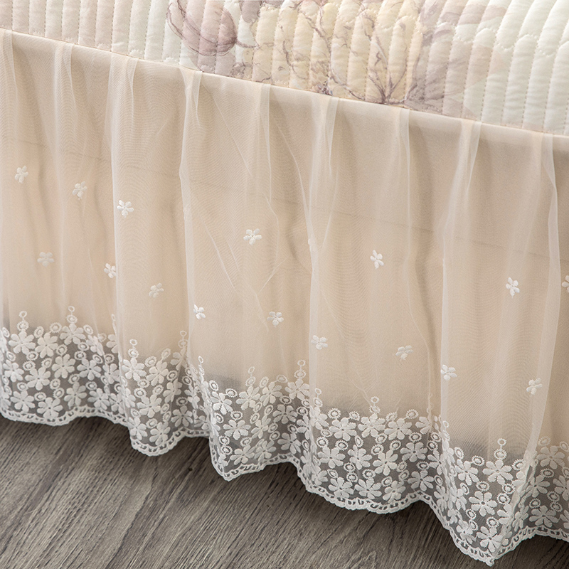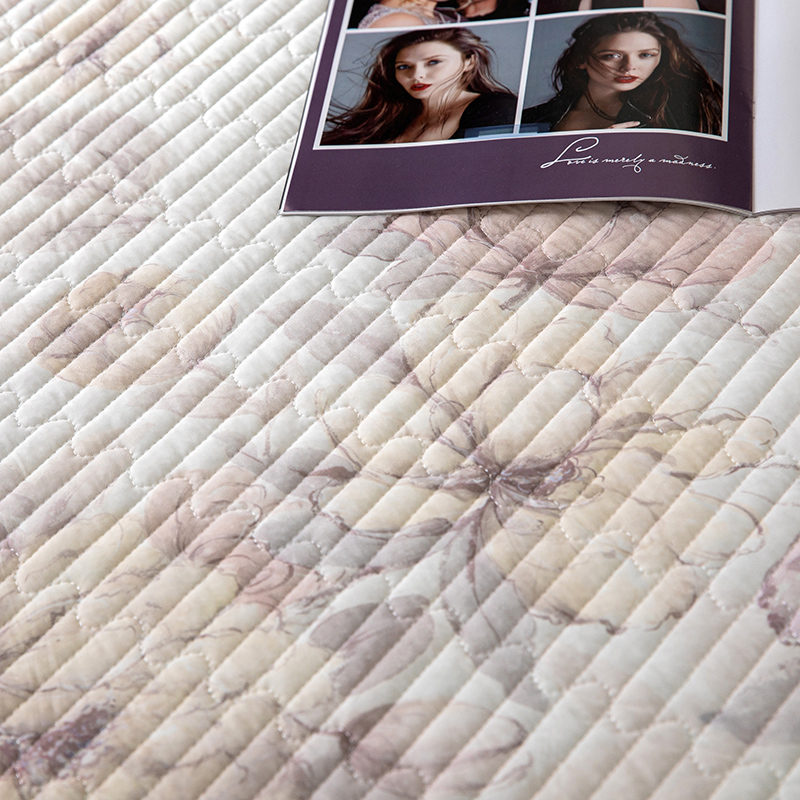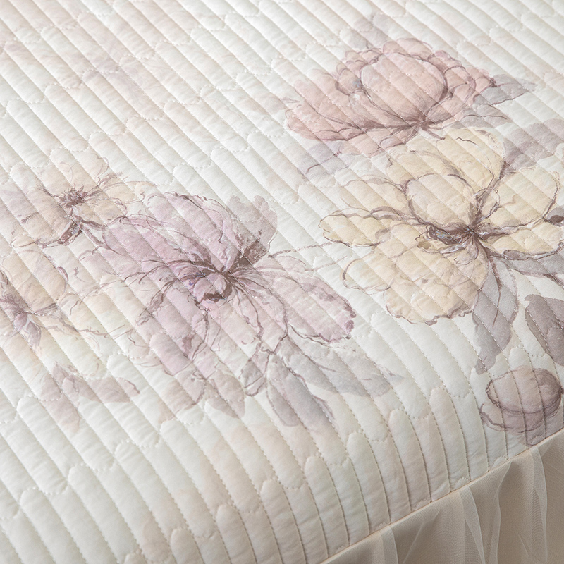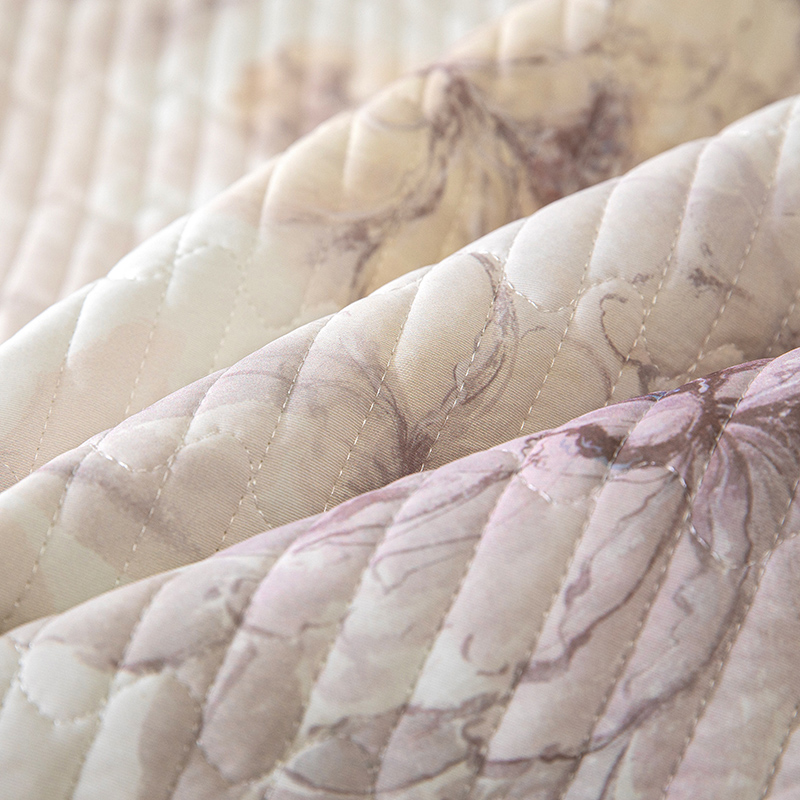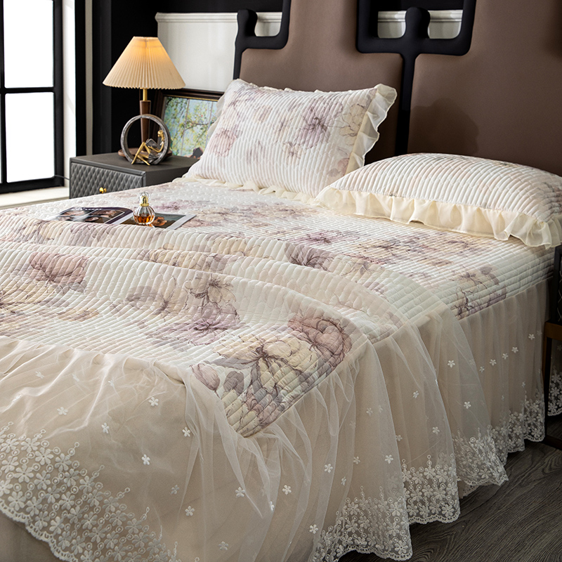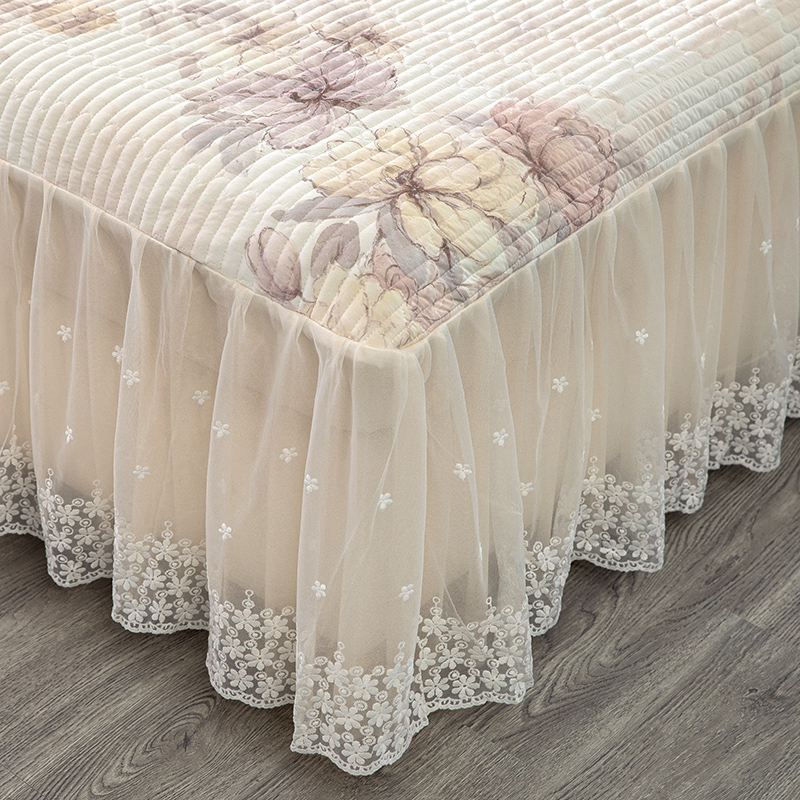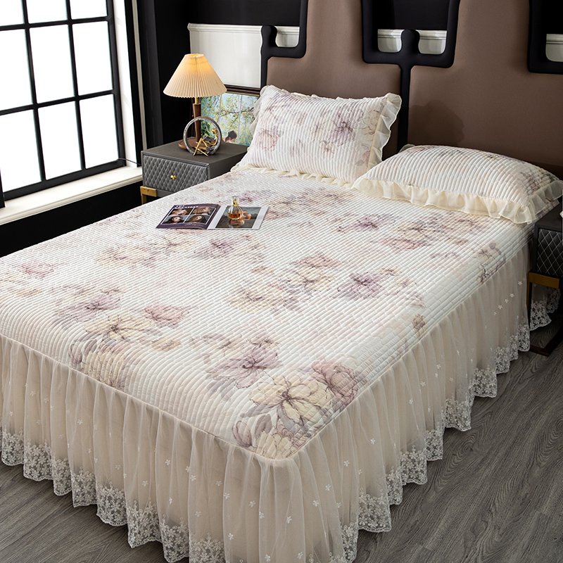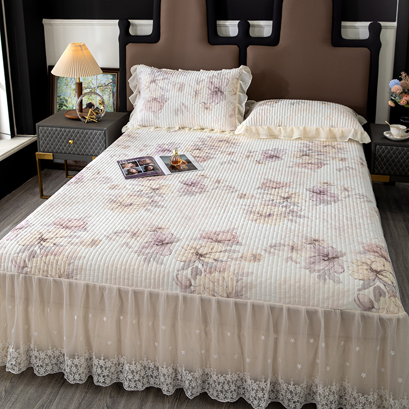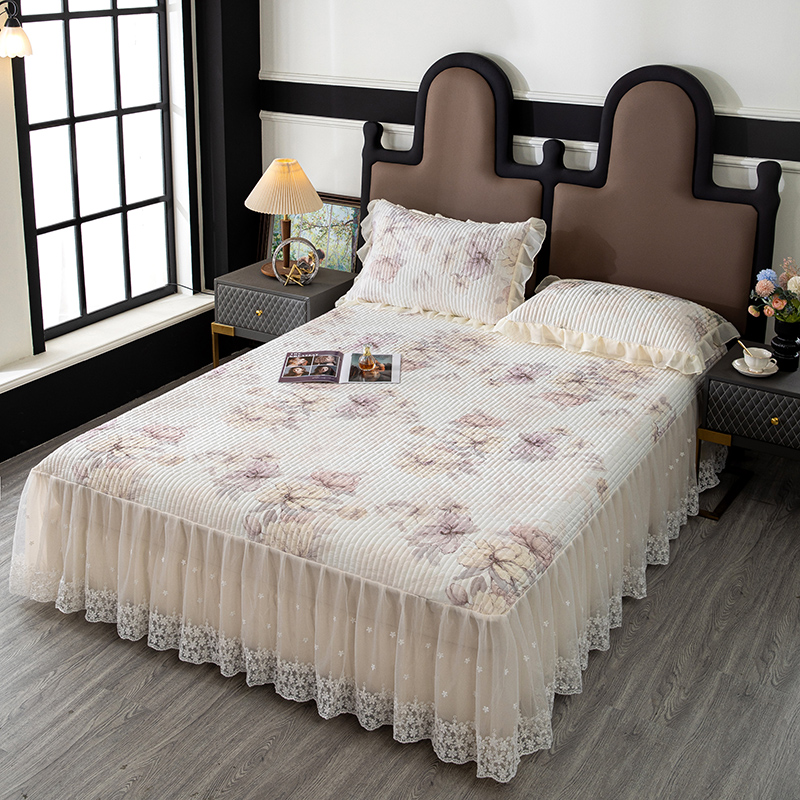 商品名称:木兰花2025新款高密凉感丝印花夹棉床裙款凉席三件套 卡梅尔-咖