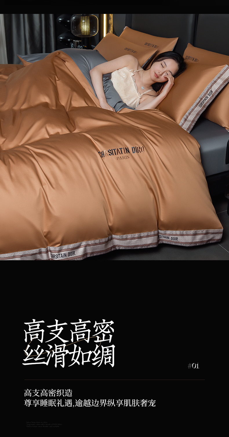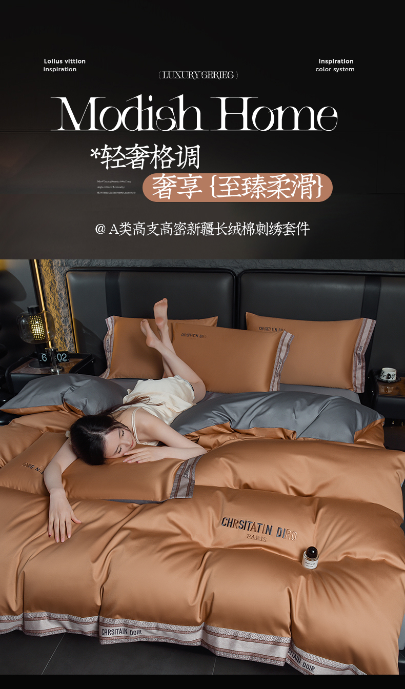 商品名称:瑞驰家纺 2025新款长绒棉纯棉绣花四件套-莱桉系列 莱桉-棕橙