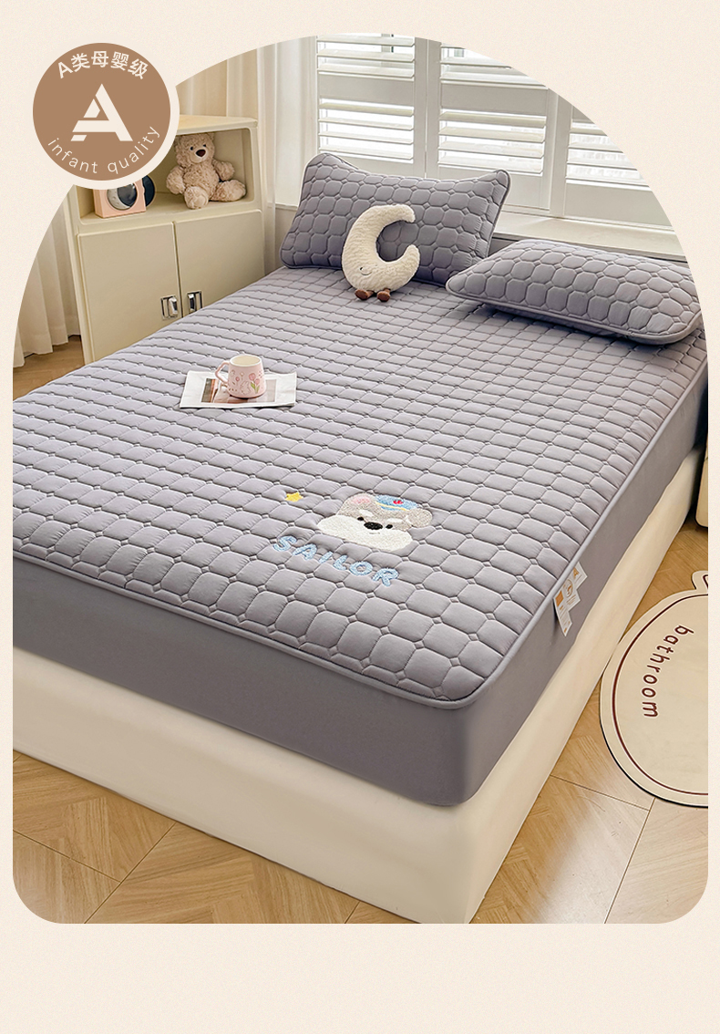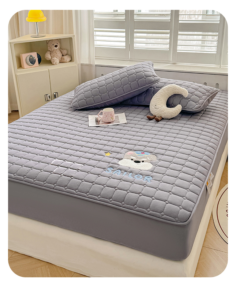 雯豆家纺 2025新品刺绣款毛巾绣夹棉床笠三件套纯色素色床护垫保护套 叮当狗-深空灰