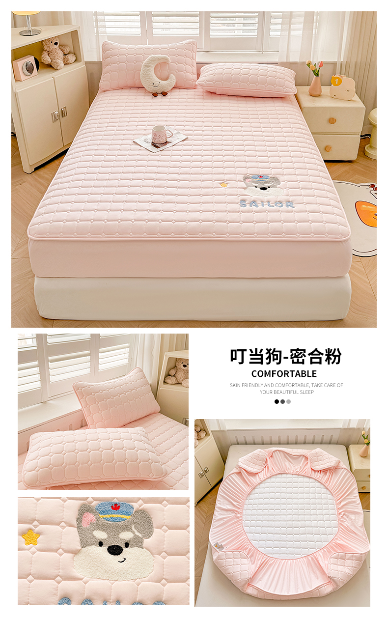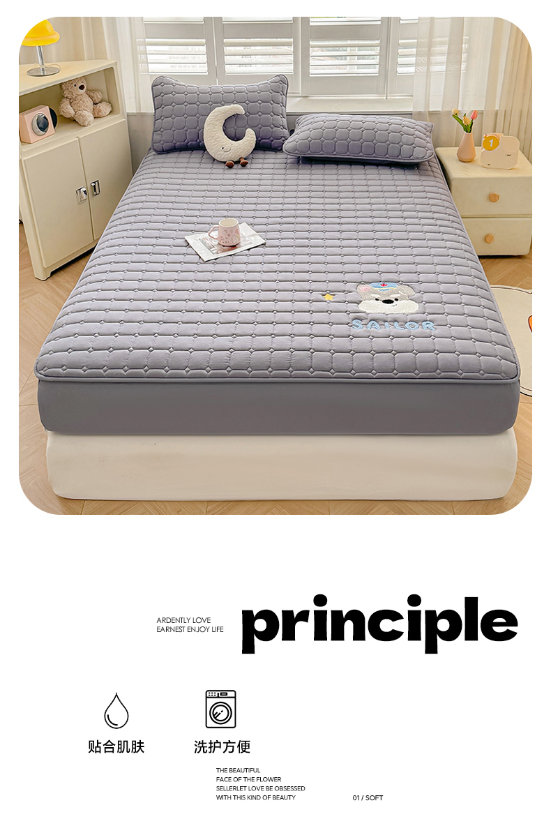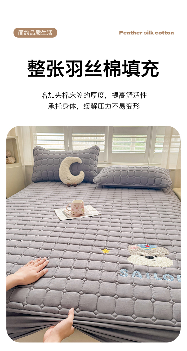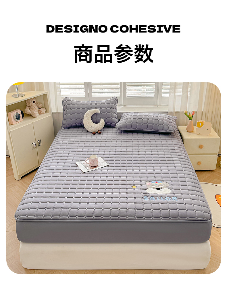 • 91家纺网 家纺一手货源 找家纺 雯豆家纺 2025新品刺绣款毛巾绣夹棉床笠三件套纯色素色床护垫保护套 叮当狗-深空灰