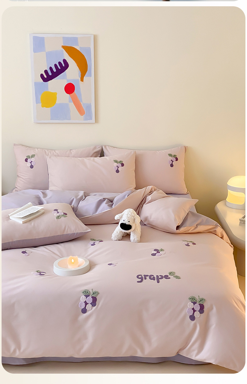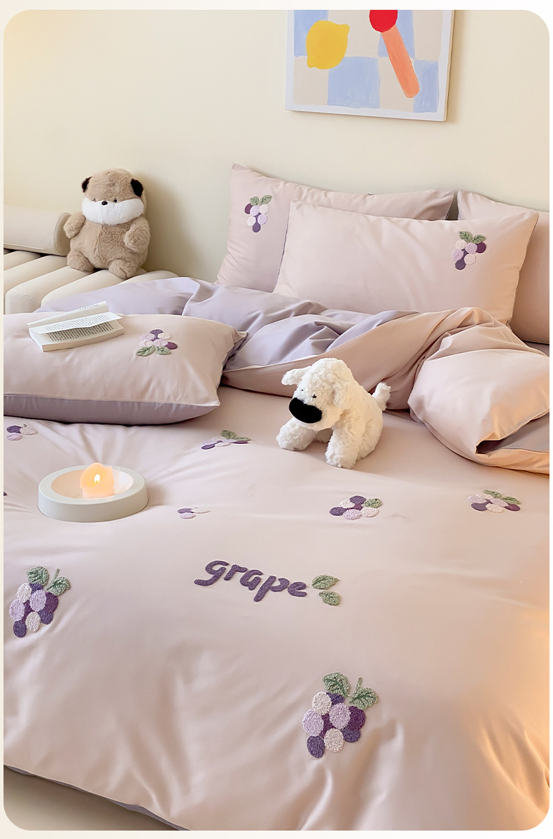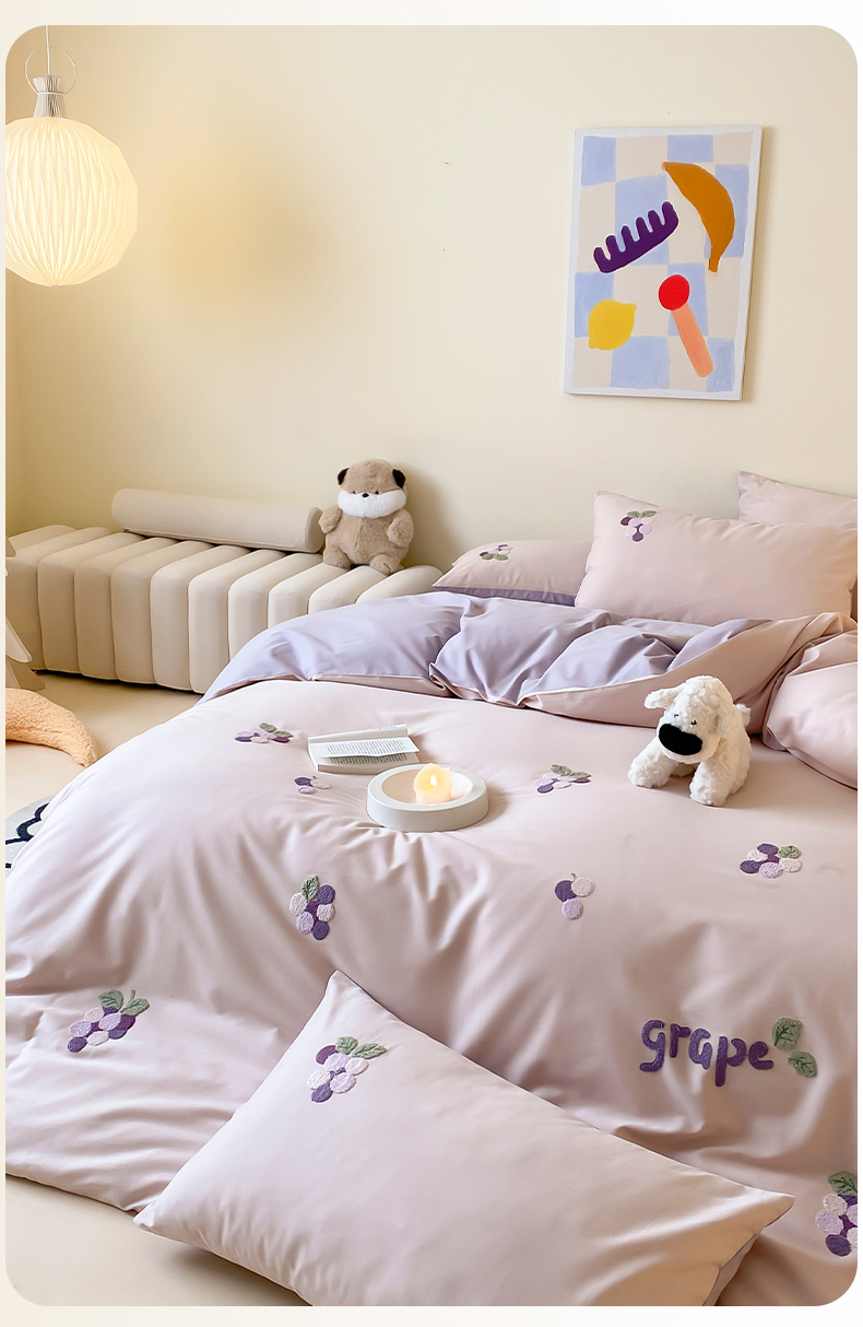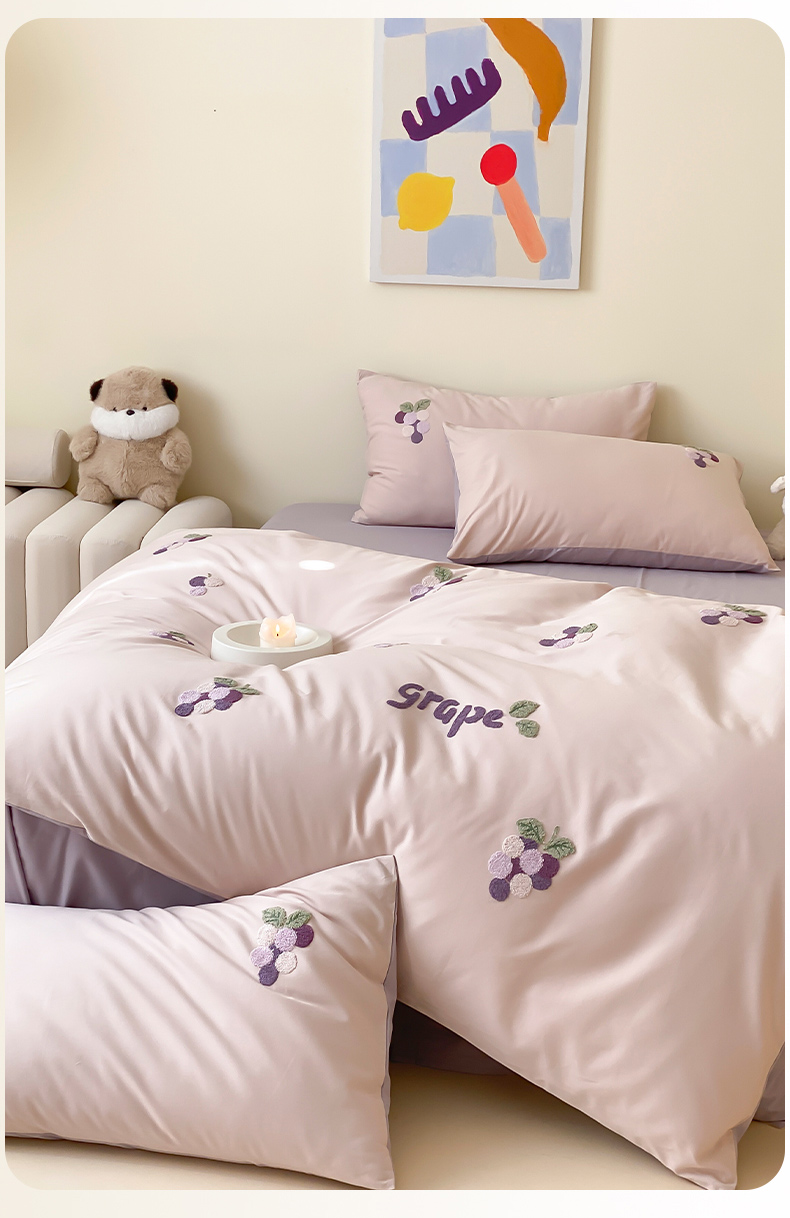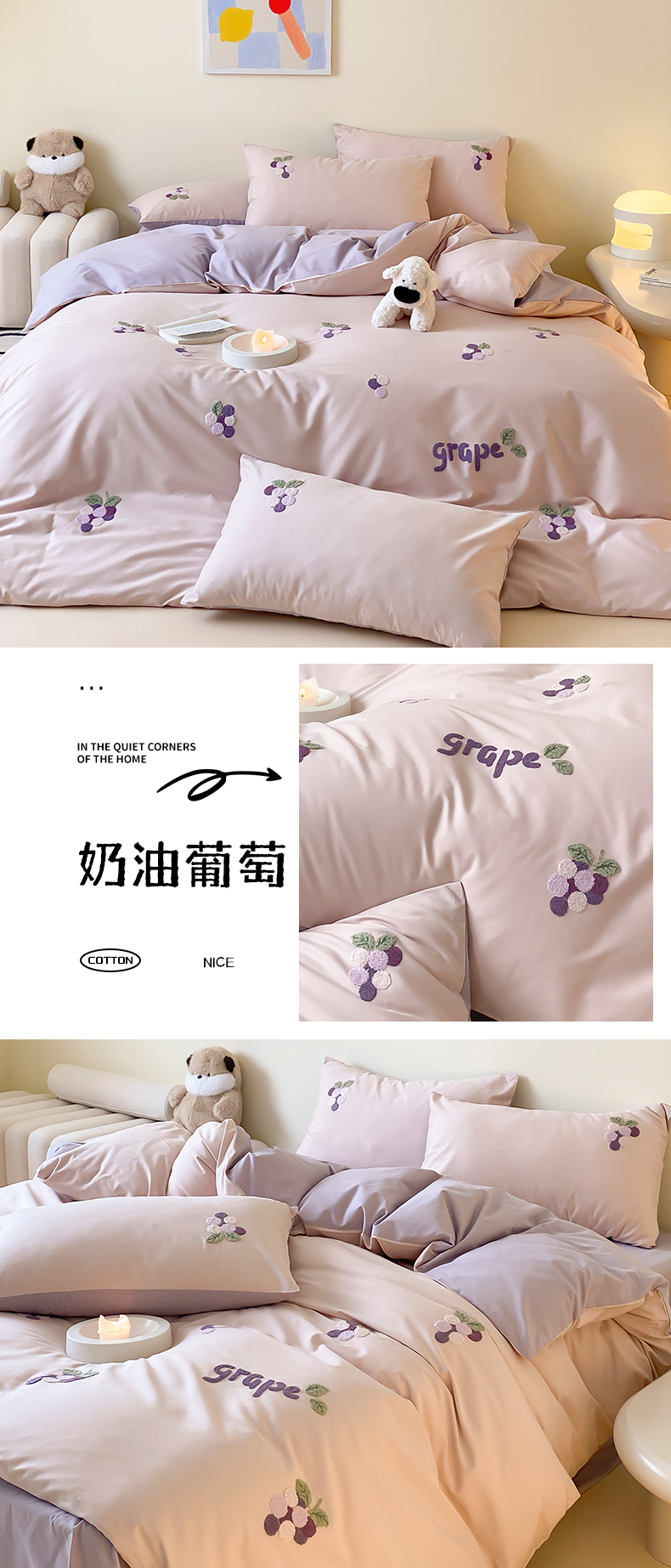 商品名称:云栖2025全棉刺绣纯色纯棉长绒棉四件套-乐萌系列 奶油葡萄