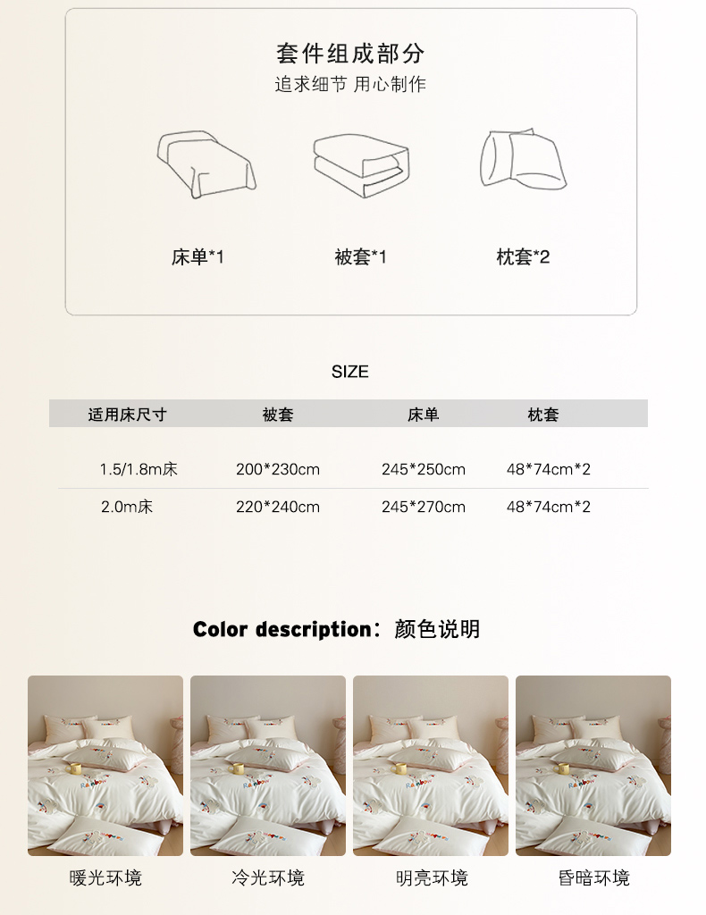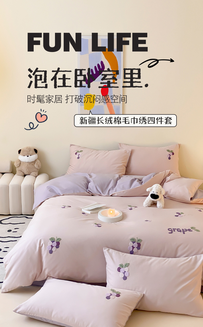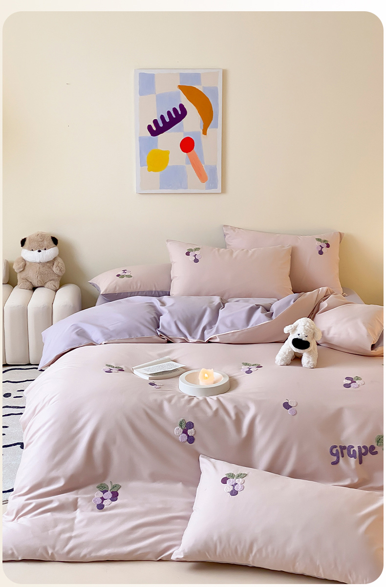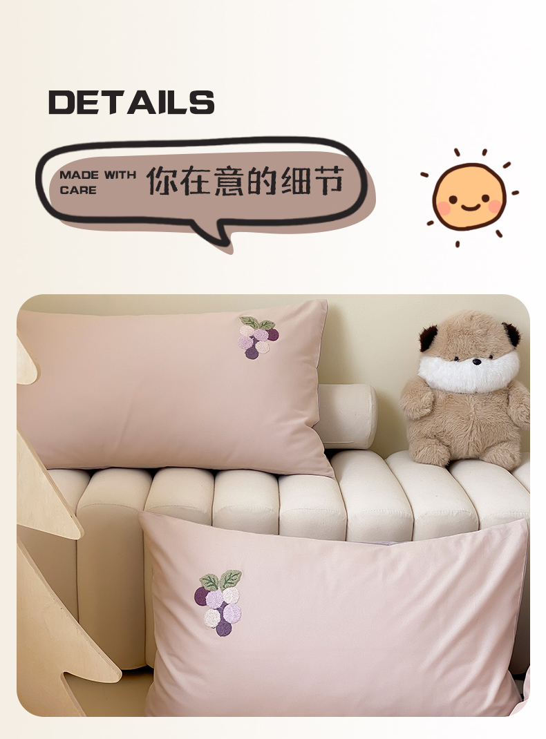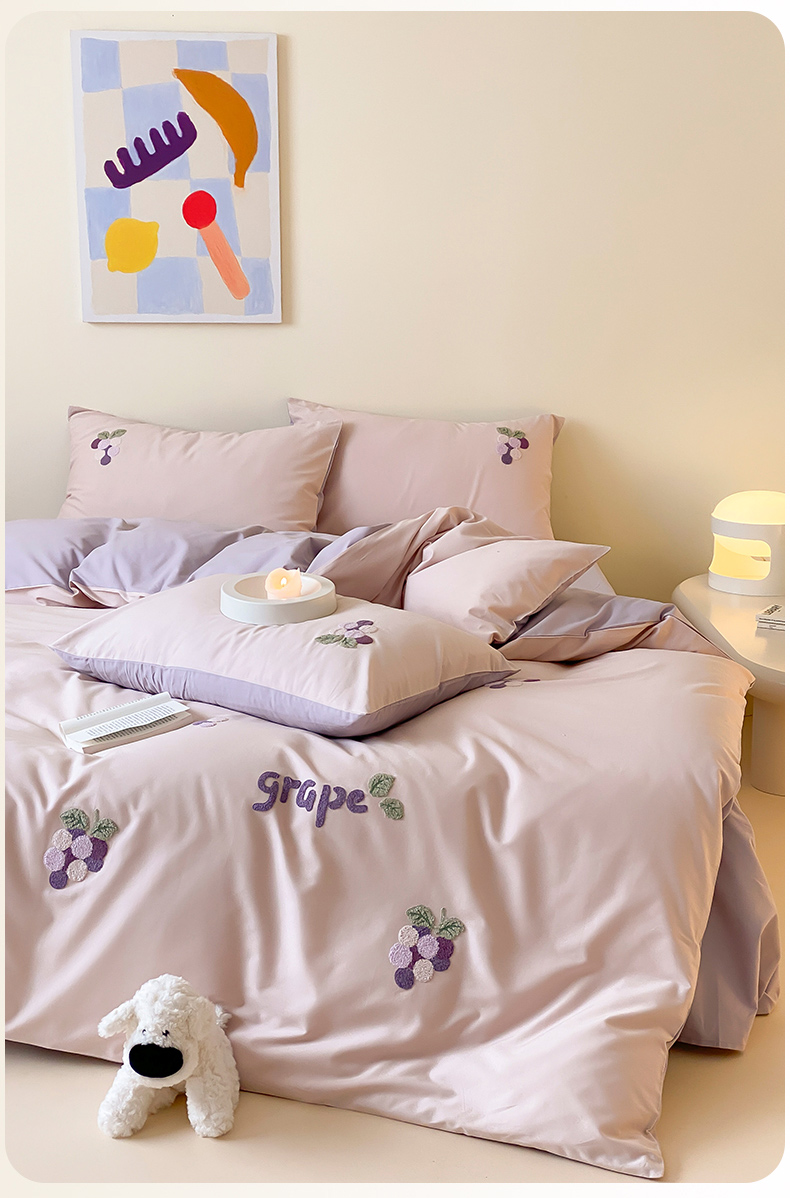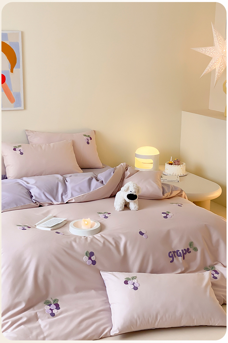 商品名称:云栖2025全棉刺绣纯色纯棉长绒棉四件套-乐萌系列 奶油葡萄