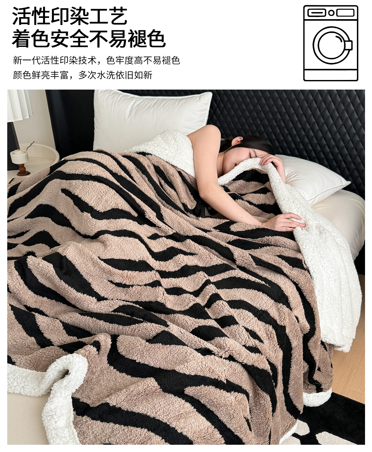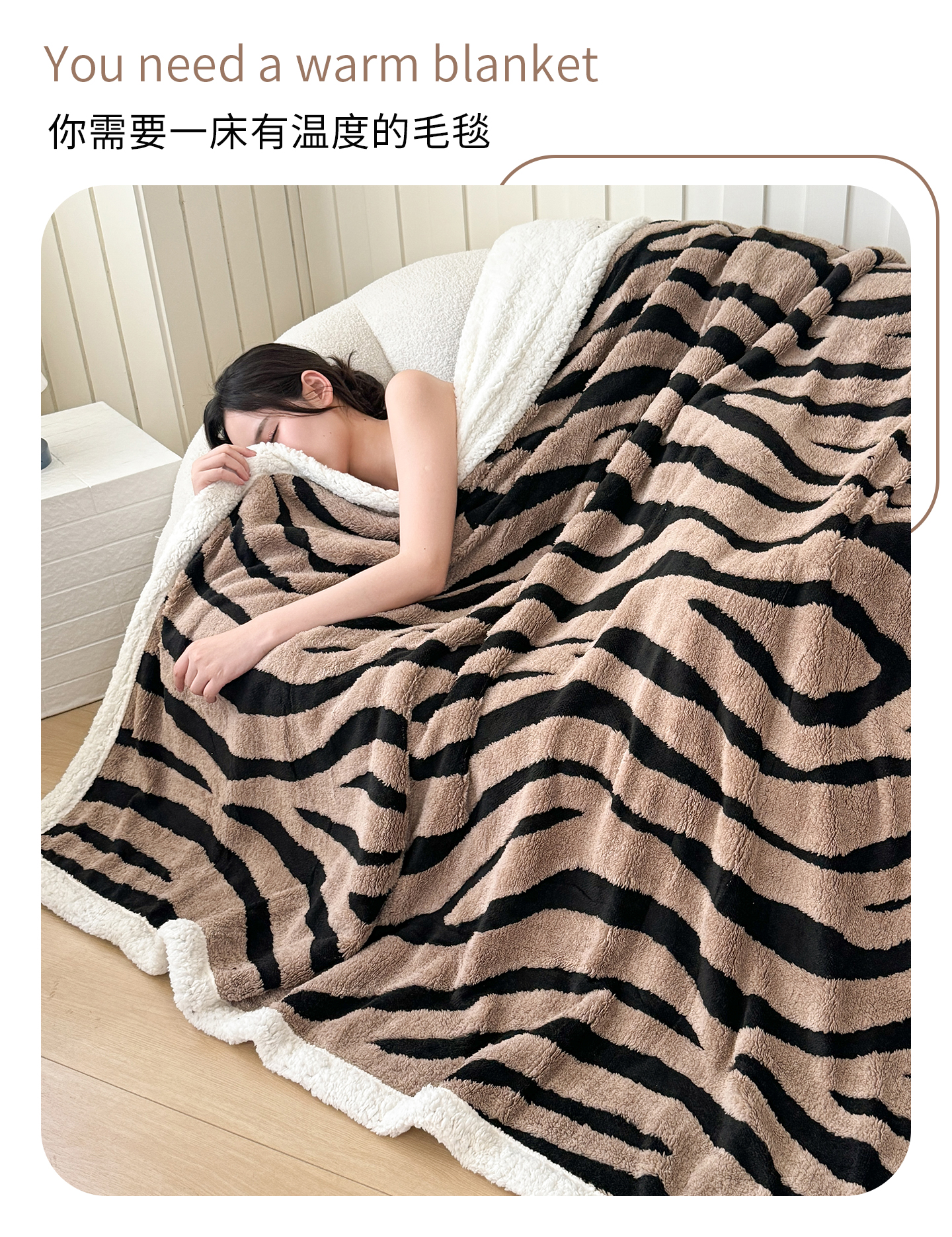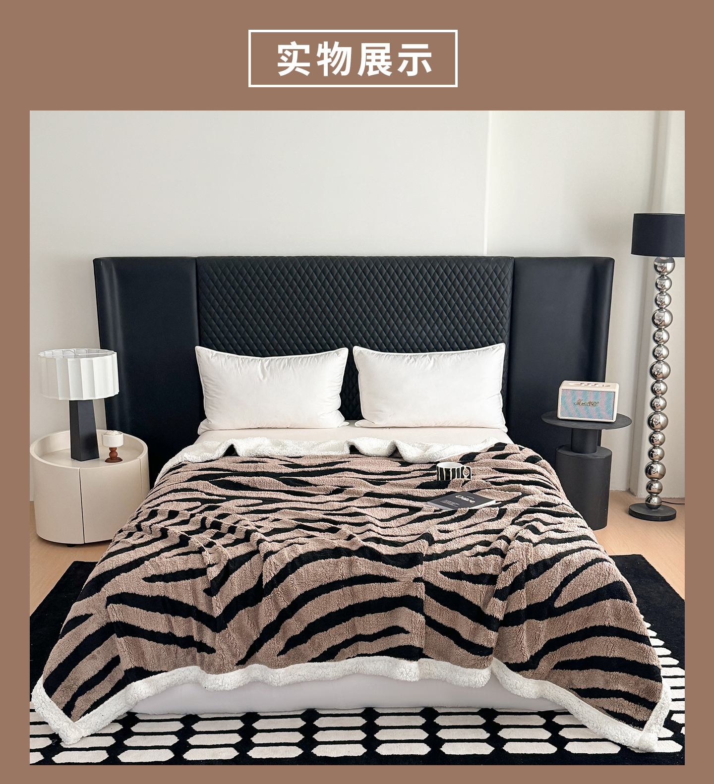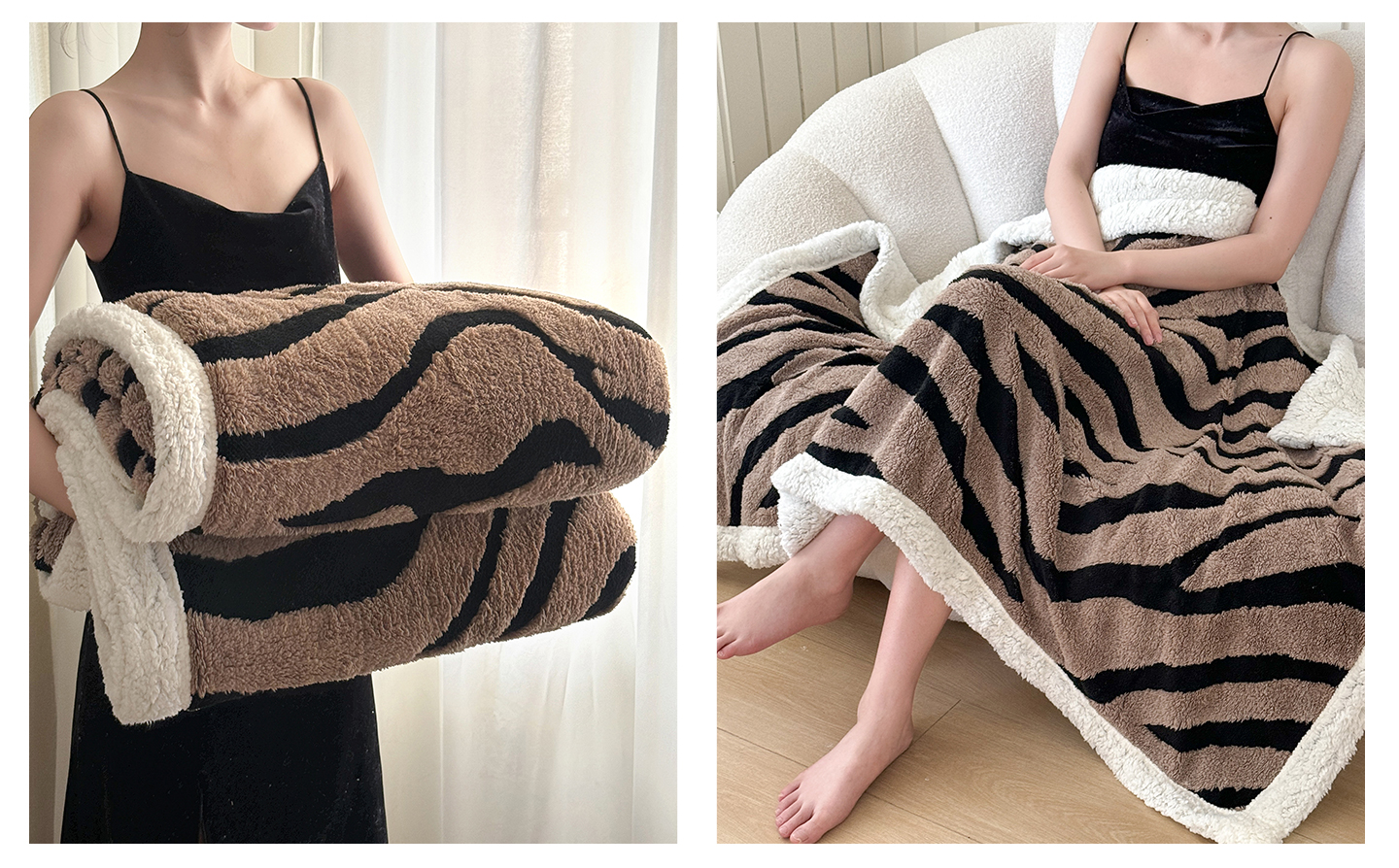 商品名称:丹本家纺 2025新款双层阳离子斑马纹提花塔芙绒羊羔绒跨境双层毛毯盖毯毯子 驼斑马纹