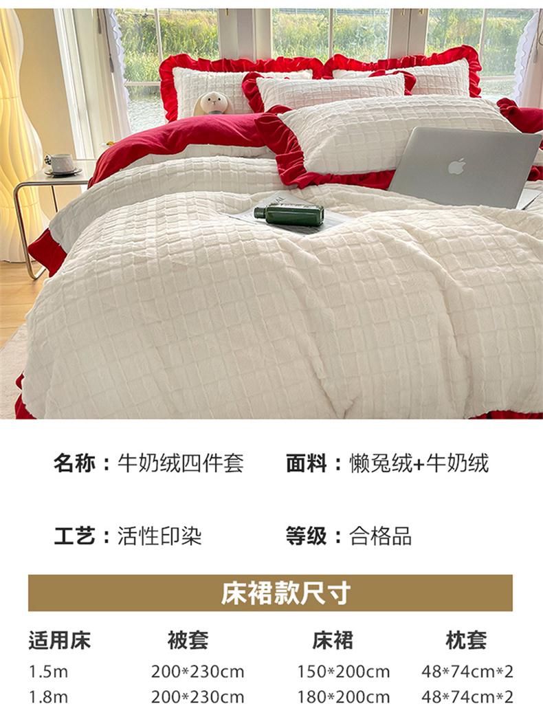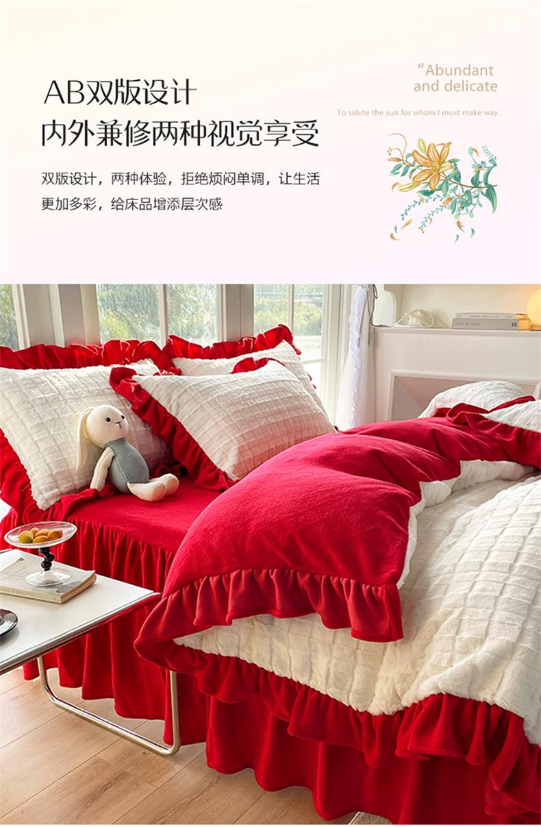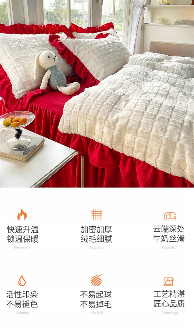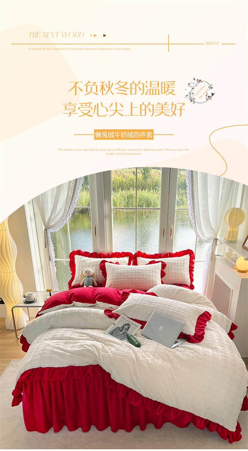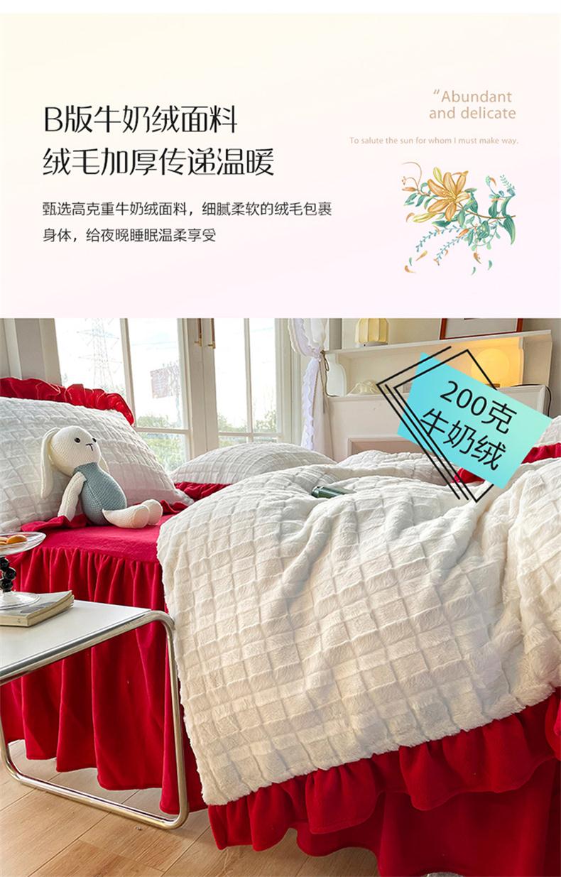 商品名称:睡美人 2025新款韩版方块兔绒牛奶绒床裙公主款四件套 方块兔绒-大红色