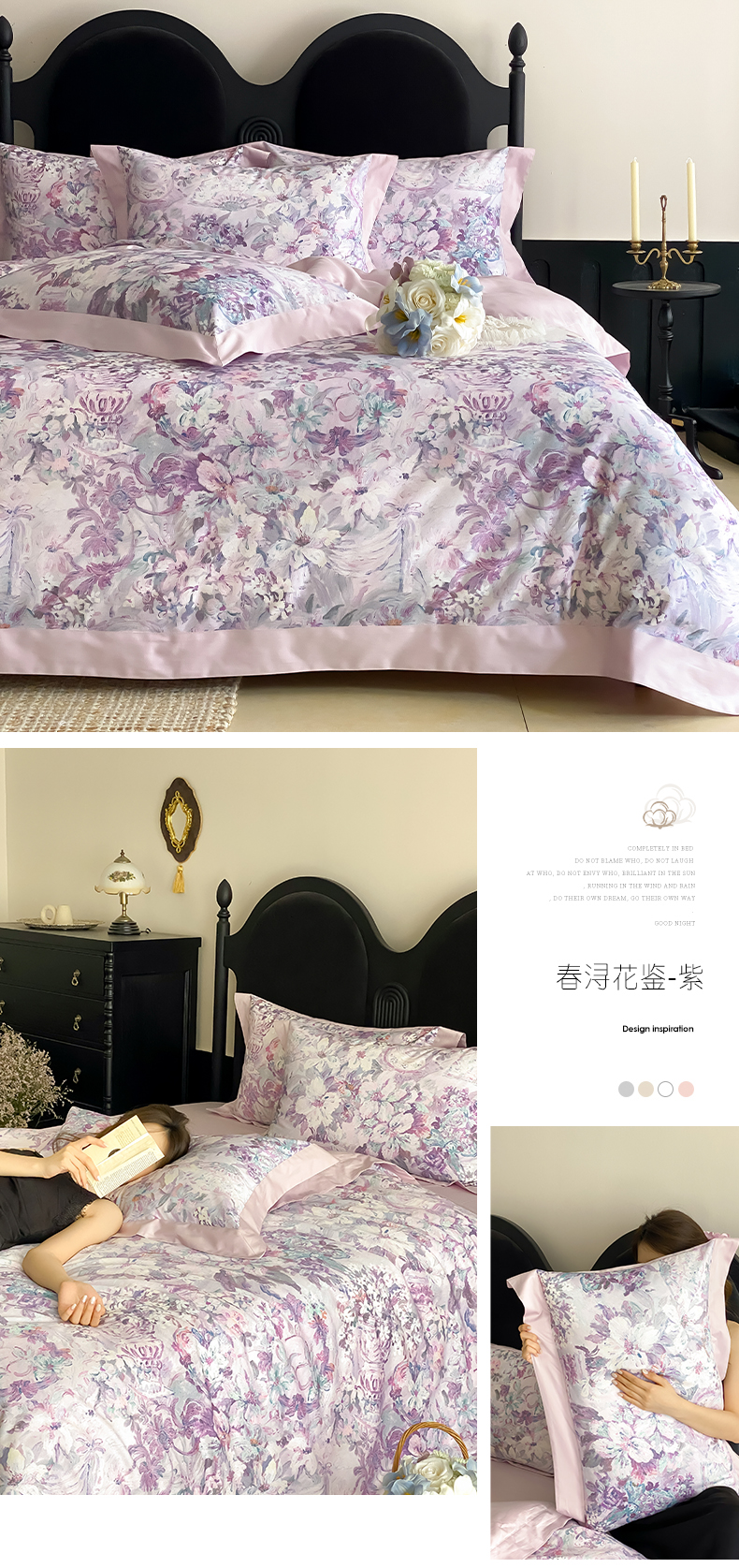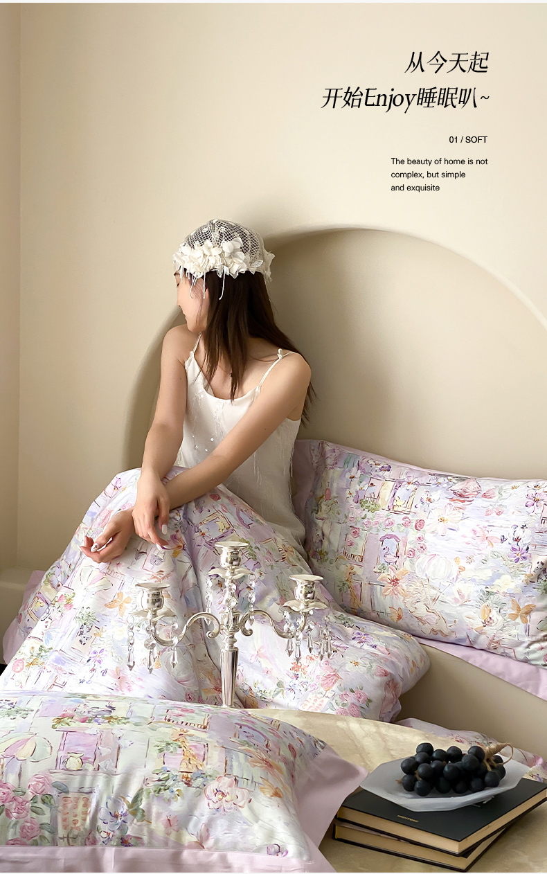 商品名称:云栖家居 2025全棉纯棉长绒棉纯棉A类50支数码印花系列四件套-春园 魔幻甜心-紫