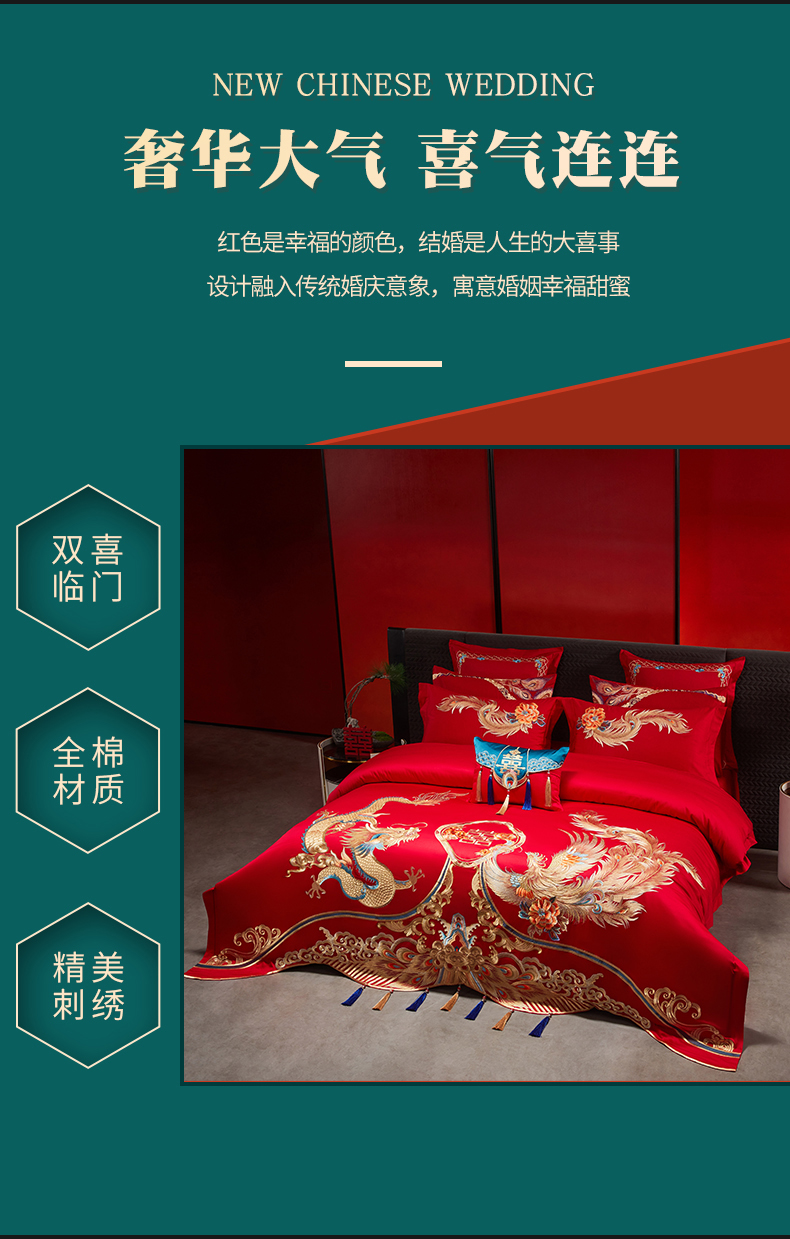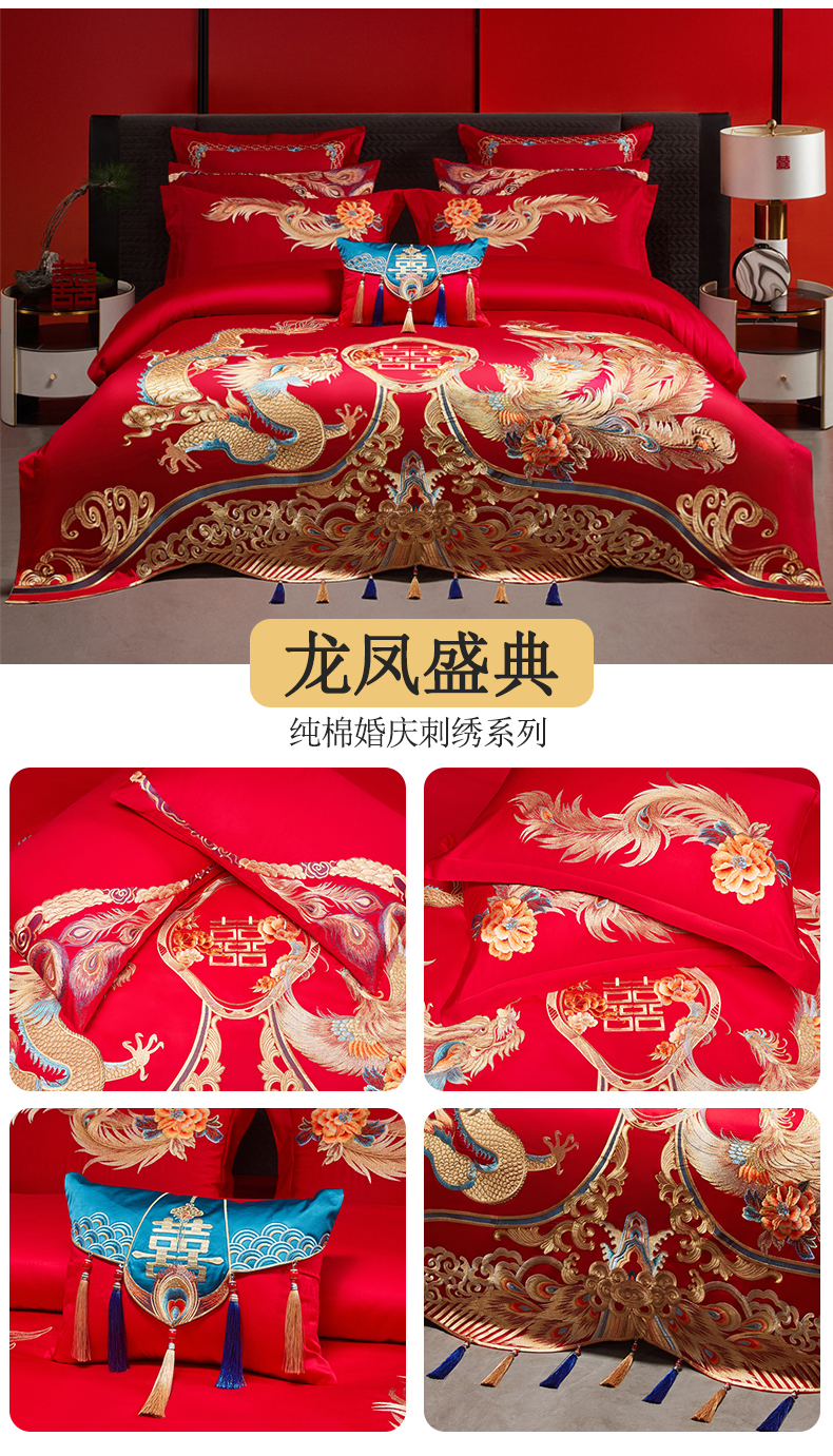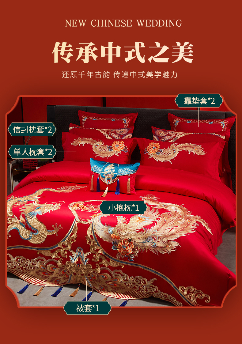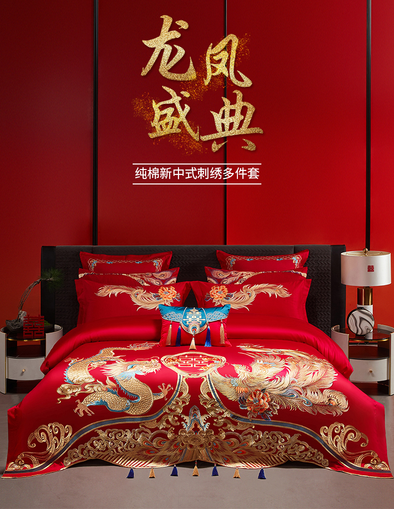 当前位置: 91家纺网 > 商品网购 > 床品套件 > 四件套 > 婚庆四件套 > 红番天婚庆 (控价)2025新款全棉新中式刺绣款婚庆四件套多件套 龙凤盛典-金