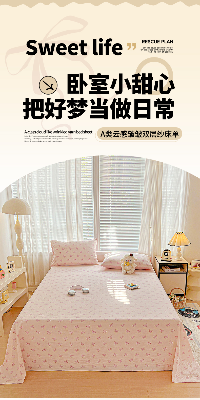 • 91家纺网 家纺一手货源 找家纺 格真 2025新款A类云感木棉皱皱双层纱床单单床单床单单品床单三件套 嫣然