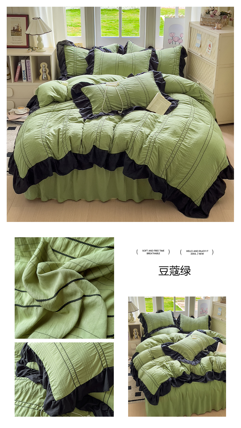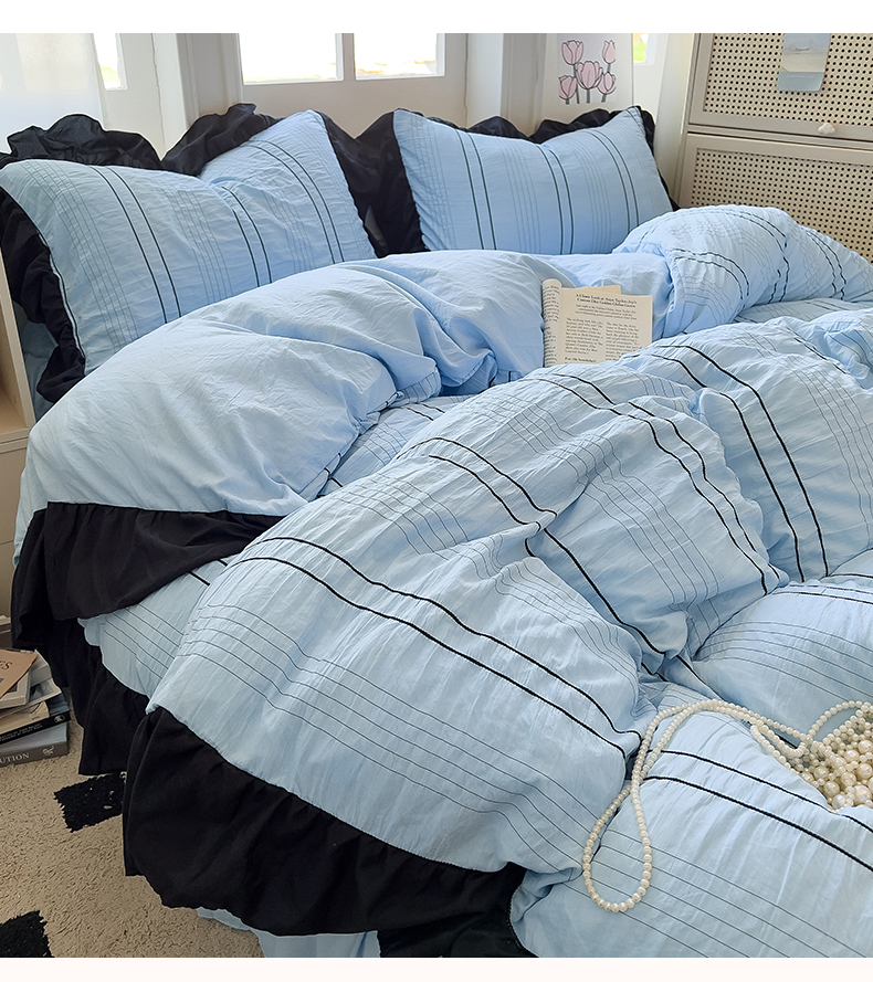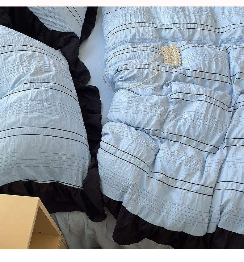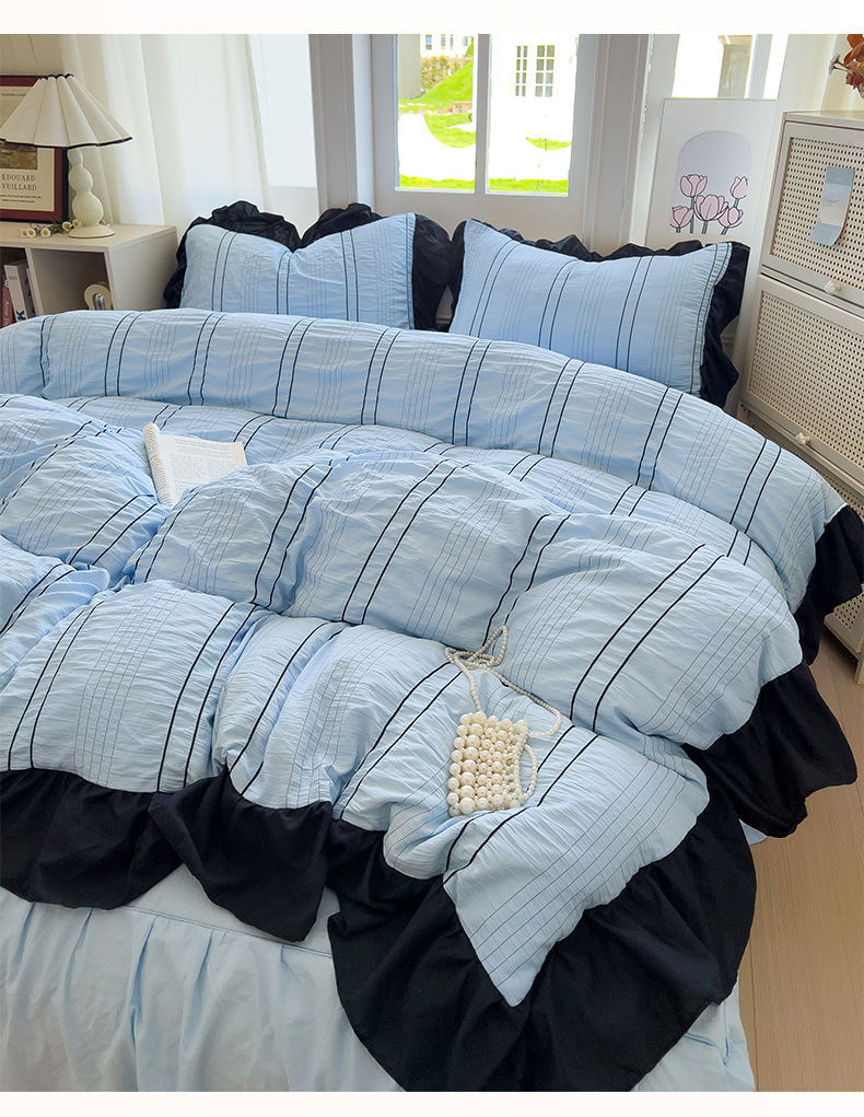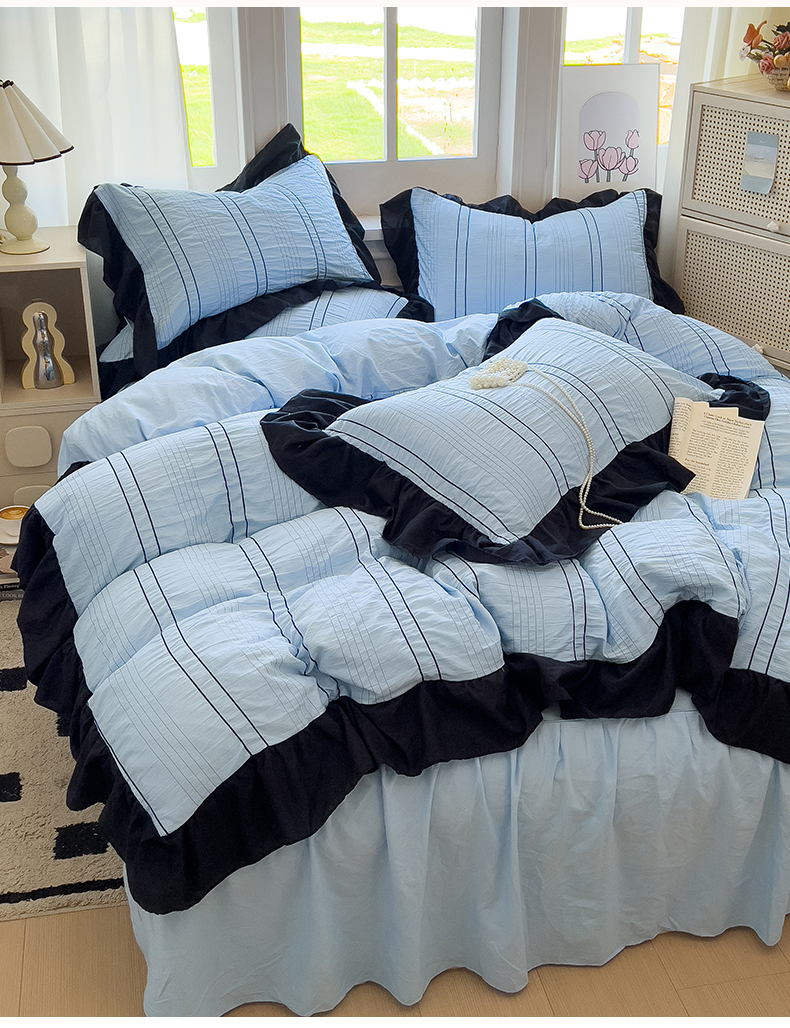 当前位置: 91家纺网 > 商品网购 > 床品套件 > 四件套 > 化纤普通四件套 > 优卡迪家纺馆 2025新款色织泡泡纱花边四件套 海盐蓝