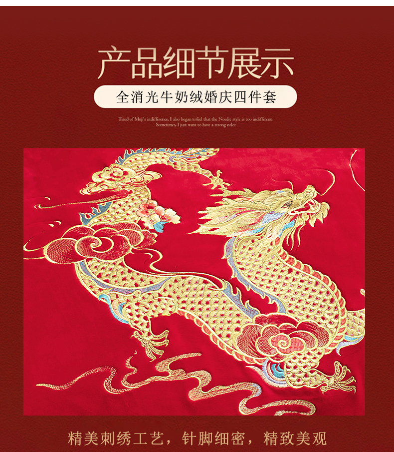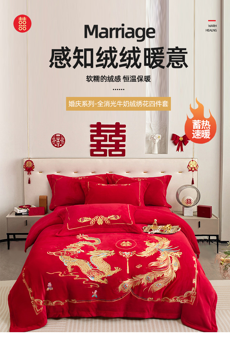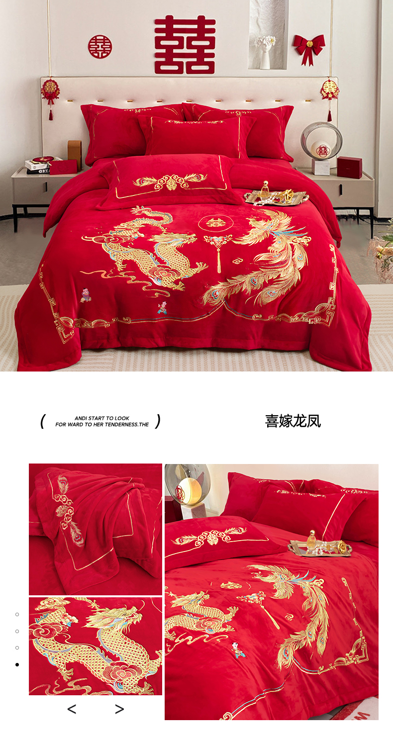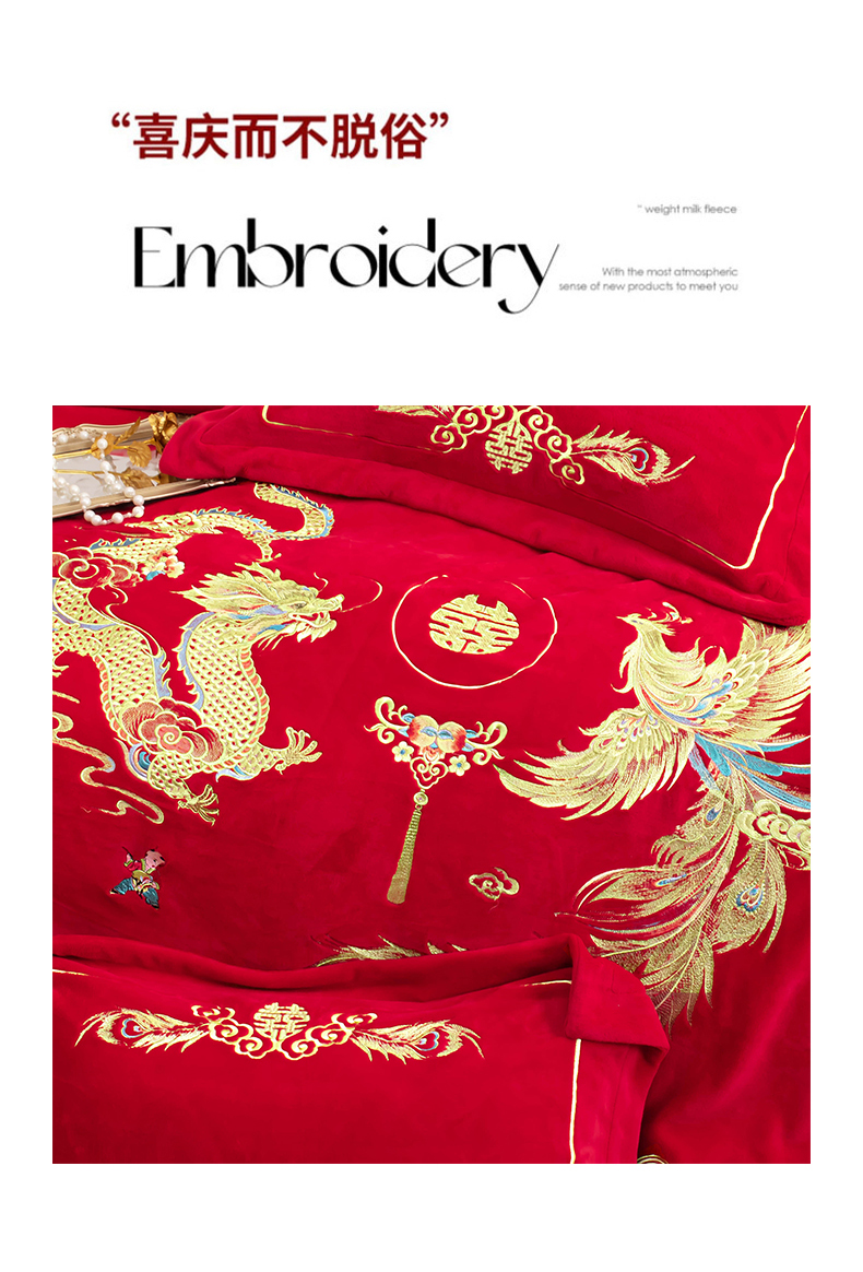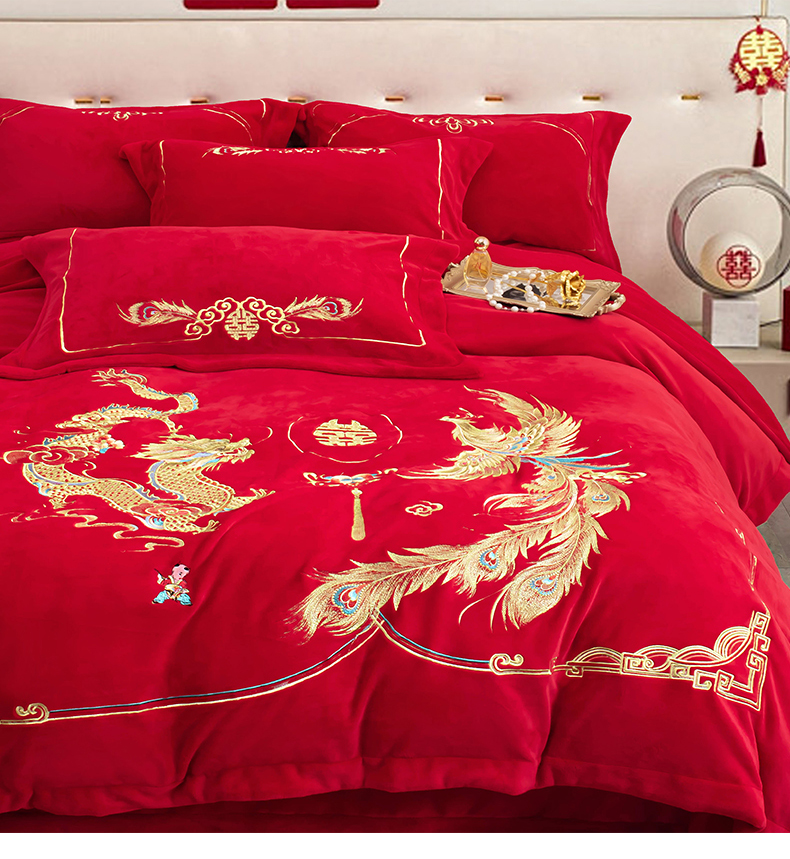 商品名称:千禧家纺 2025新款加厚高克重全消光牛奶绒刺绣婚庆四件套 喜嫁龙凤
