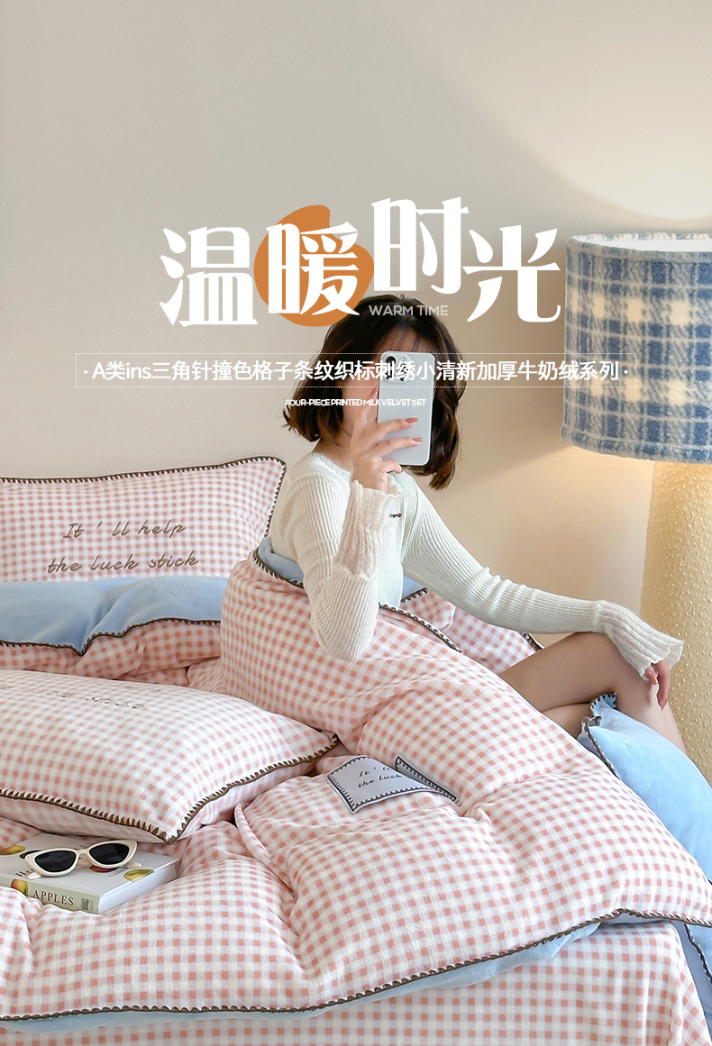 桃子家居 2025新款A类ins三角针撞色格子条纹织标高级刺绣小清新加厚牛奶绒系列四件套 绒三角针-茉莉海盐