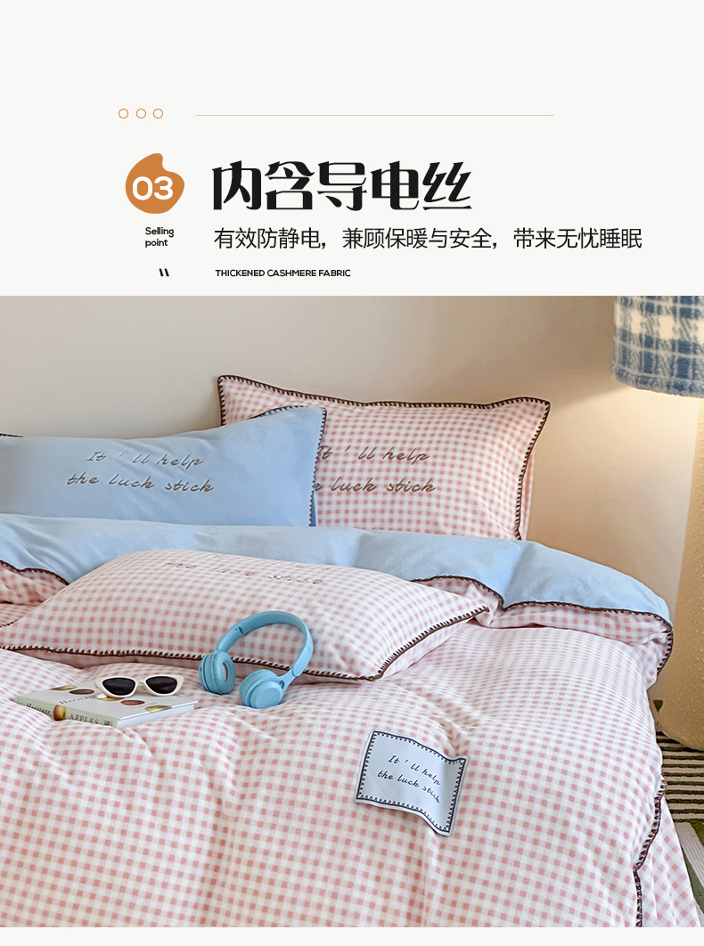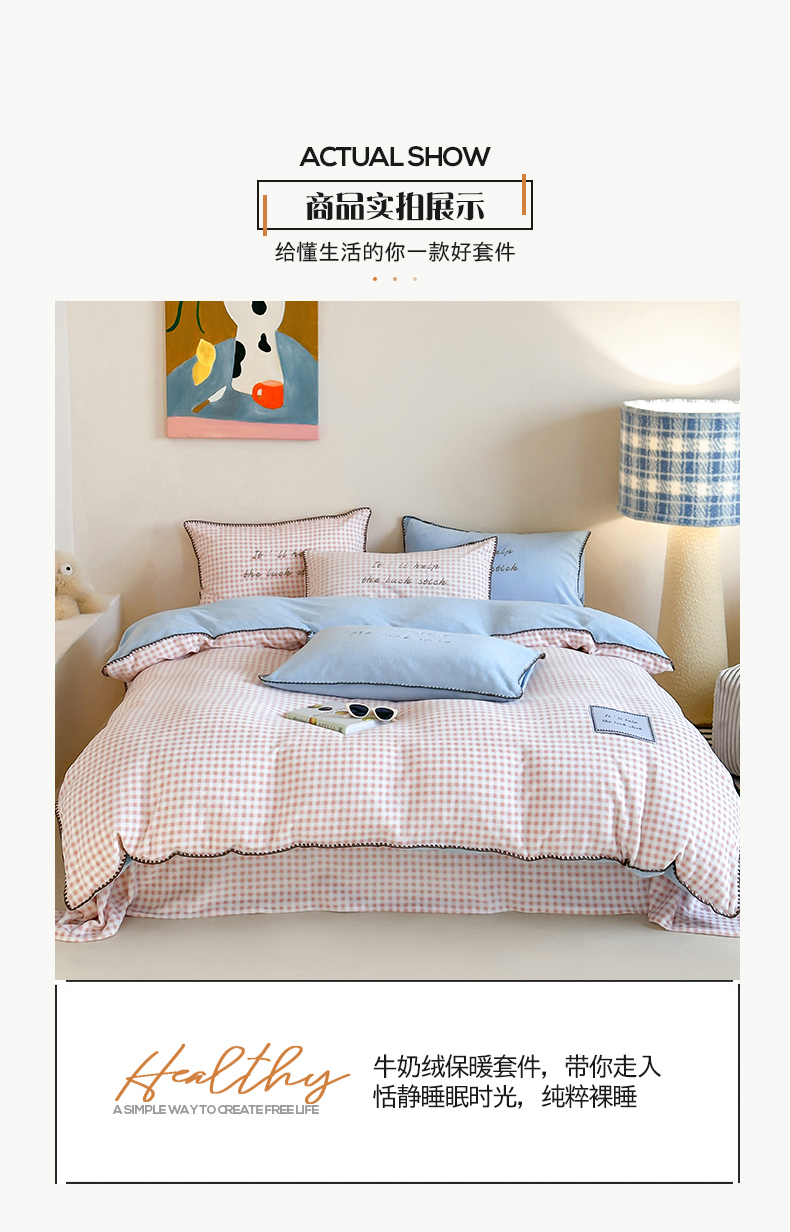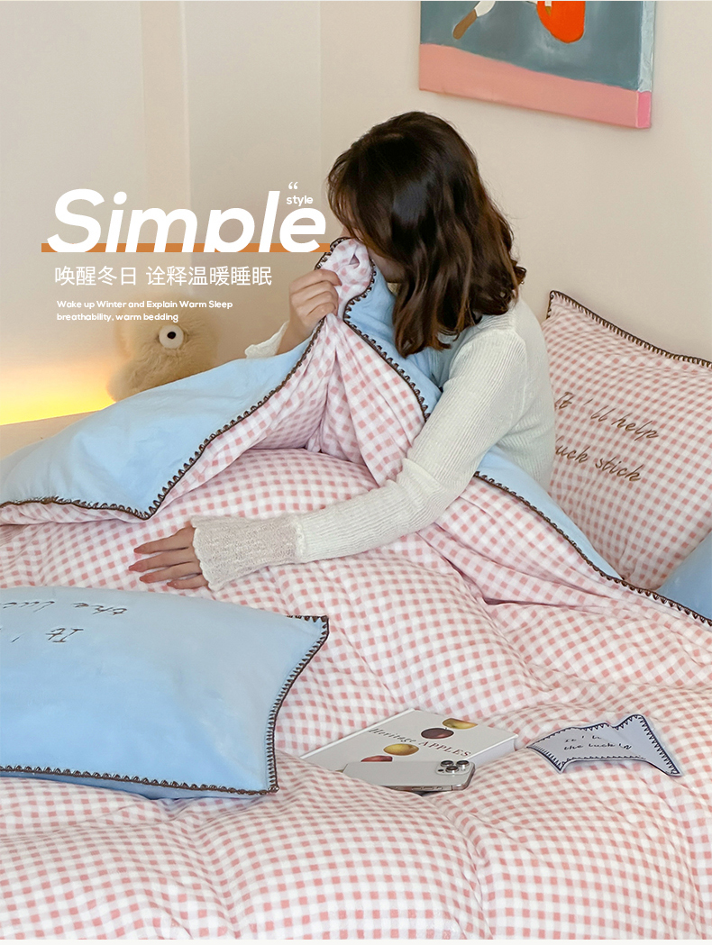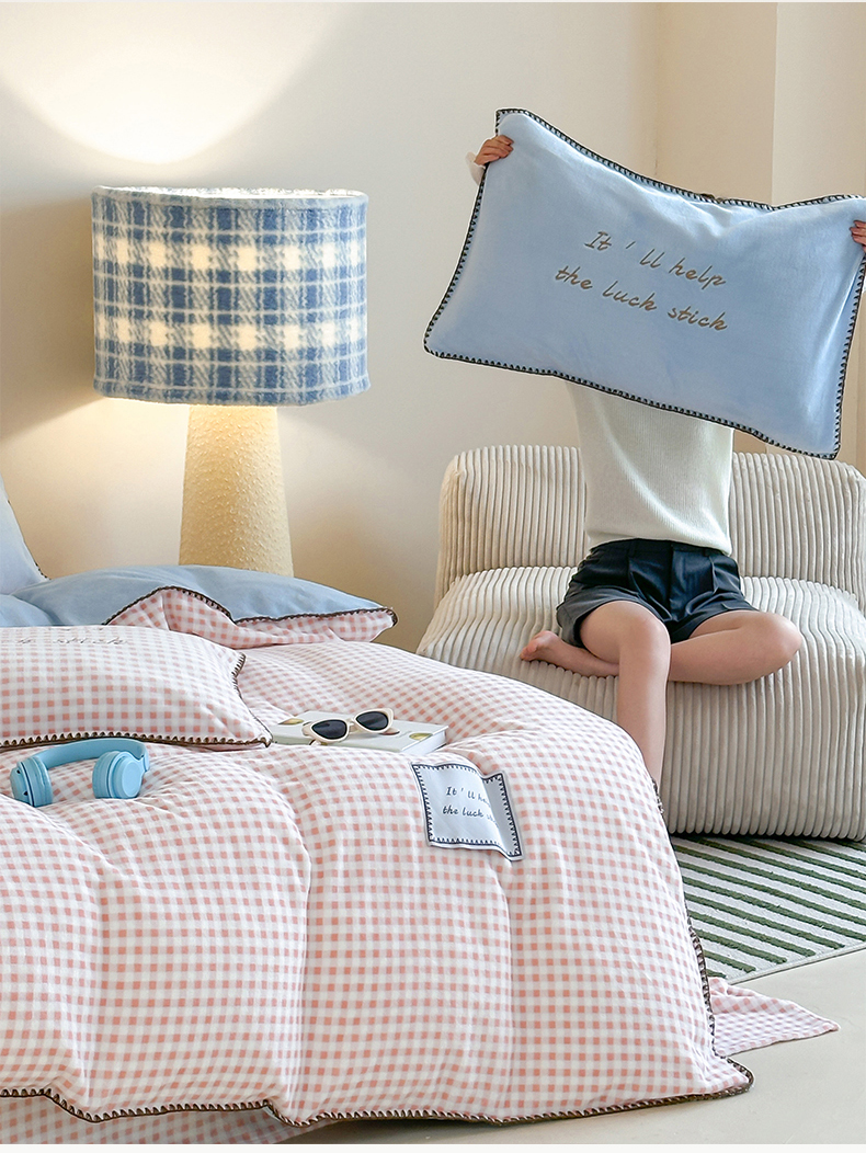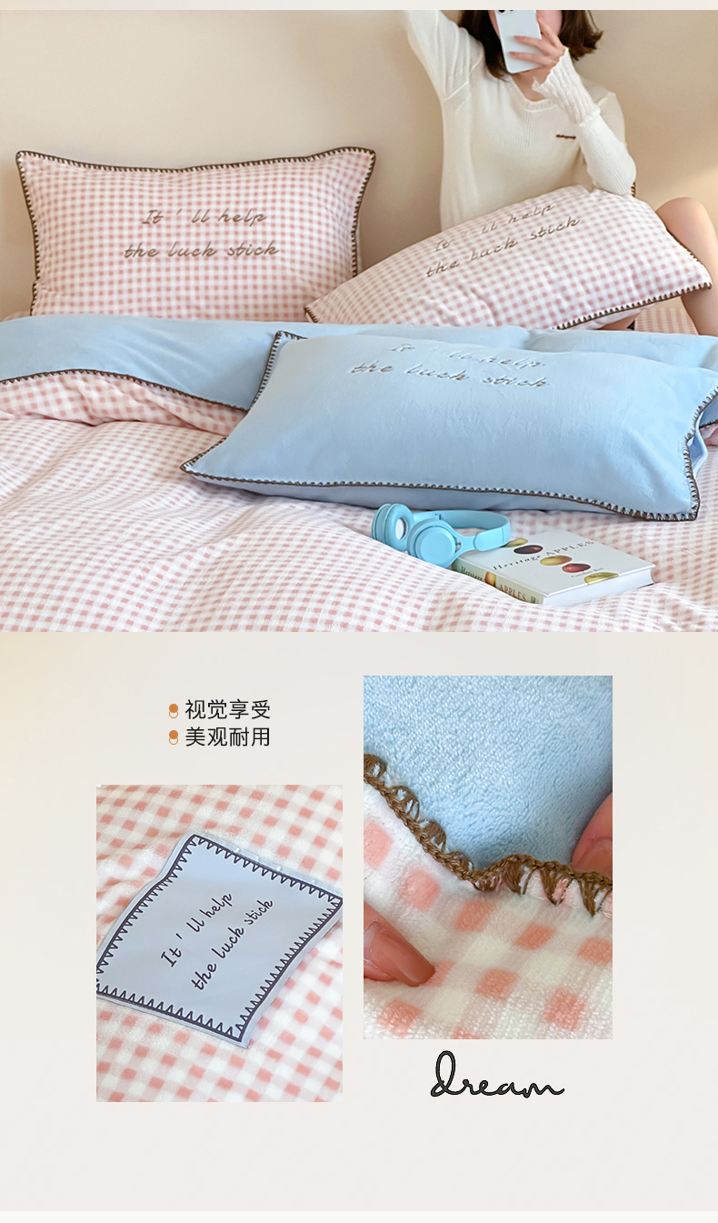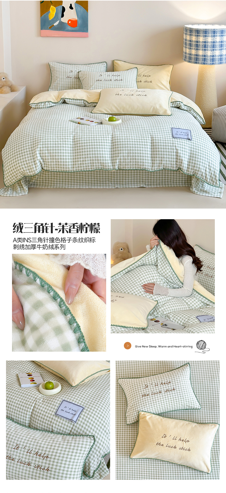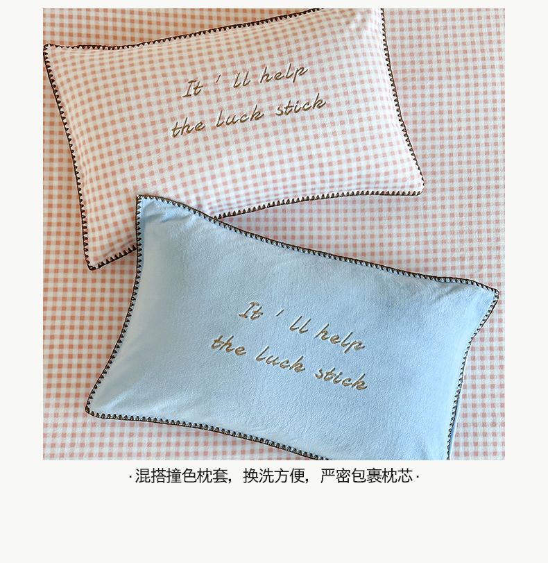 商品名称:桃子家居 2025新款A类ins三角针撞色格子条纹织标高级刺绣小清新加厚牛奶绒系列四件套 绒三角针-茉莉海盐