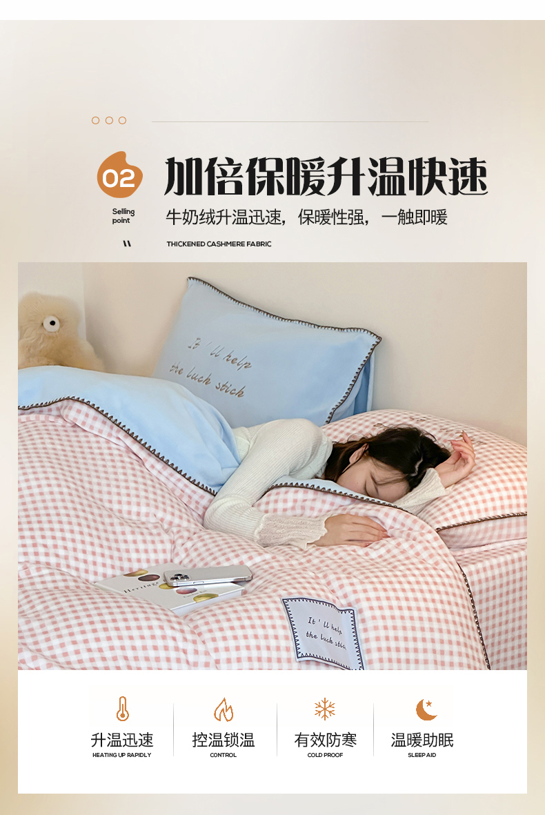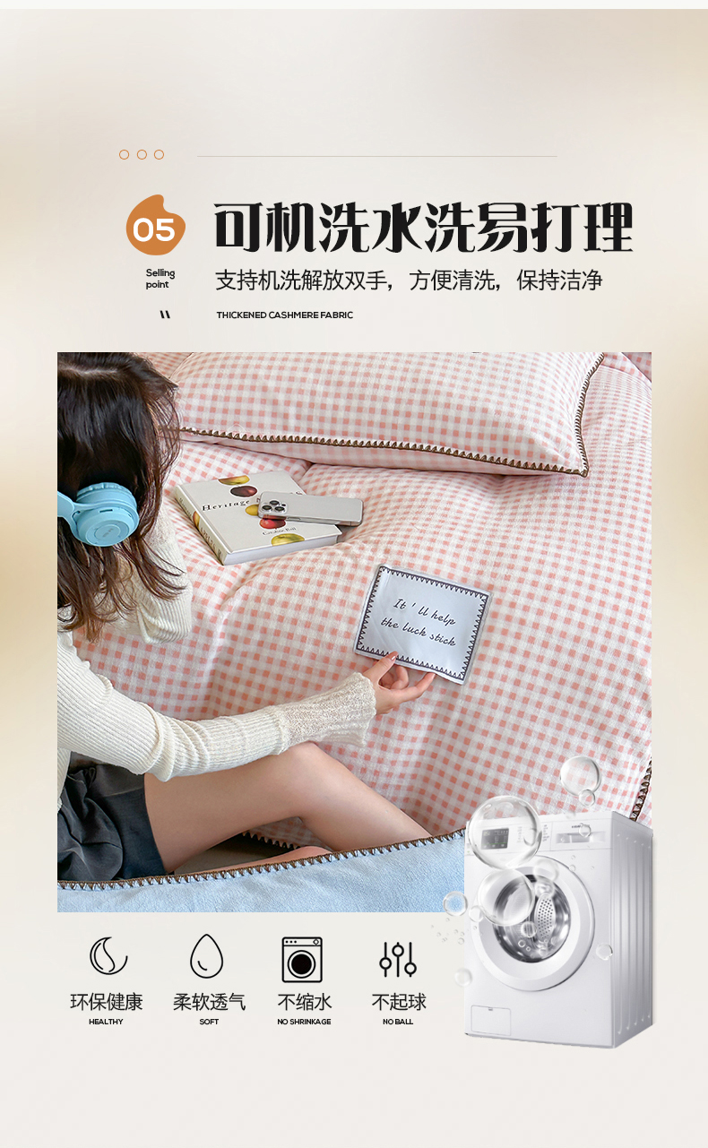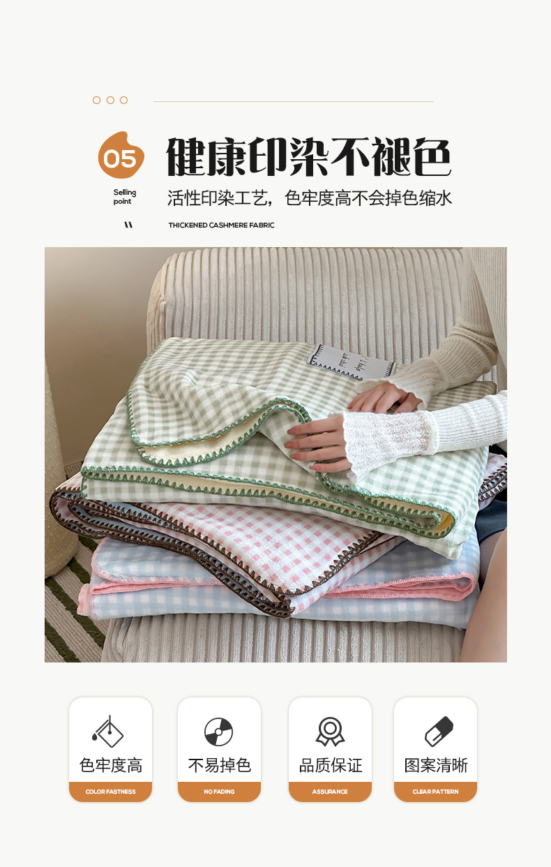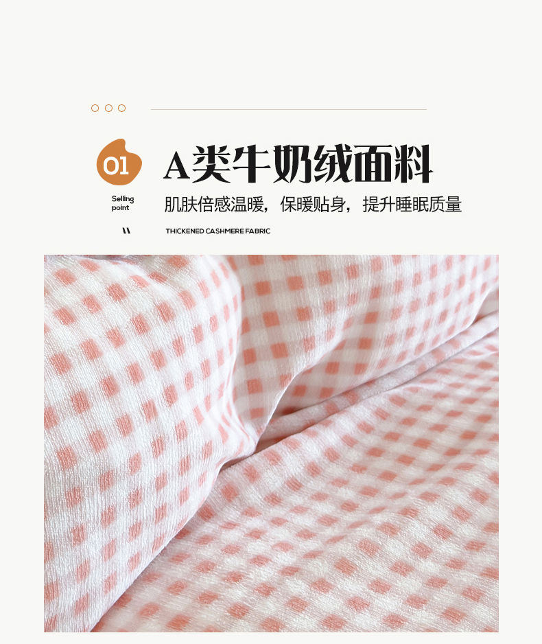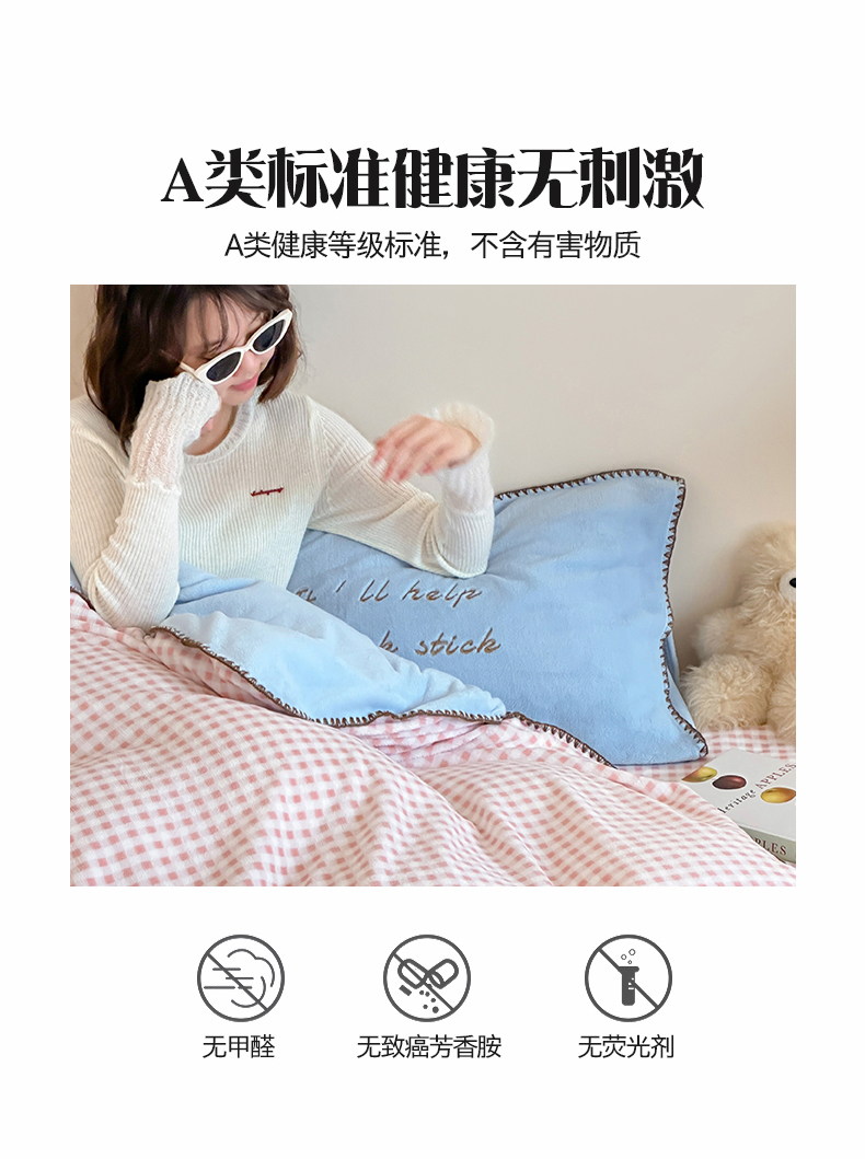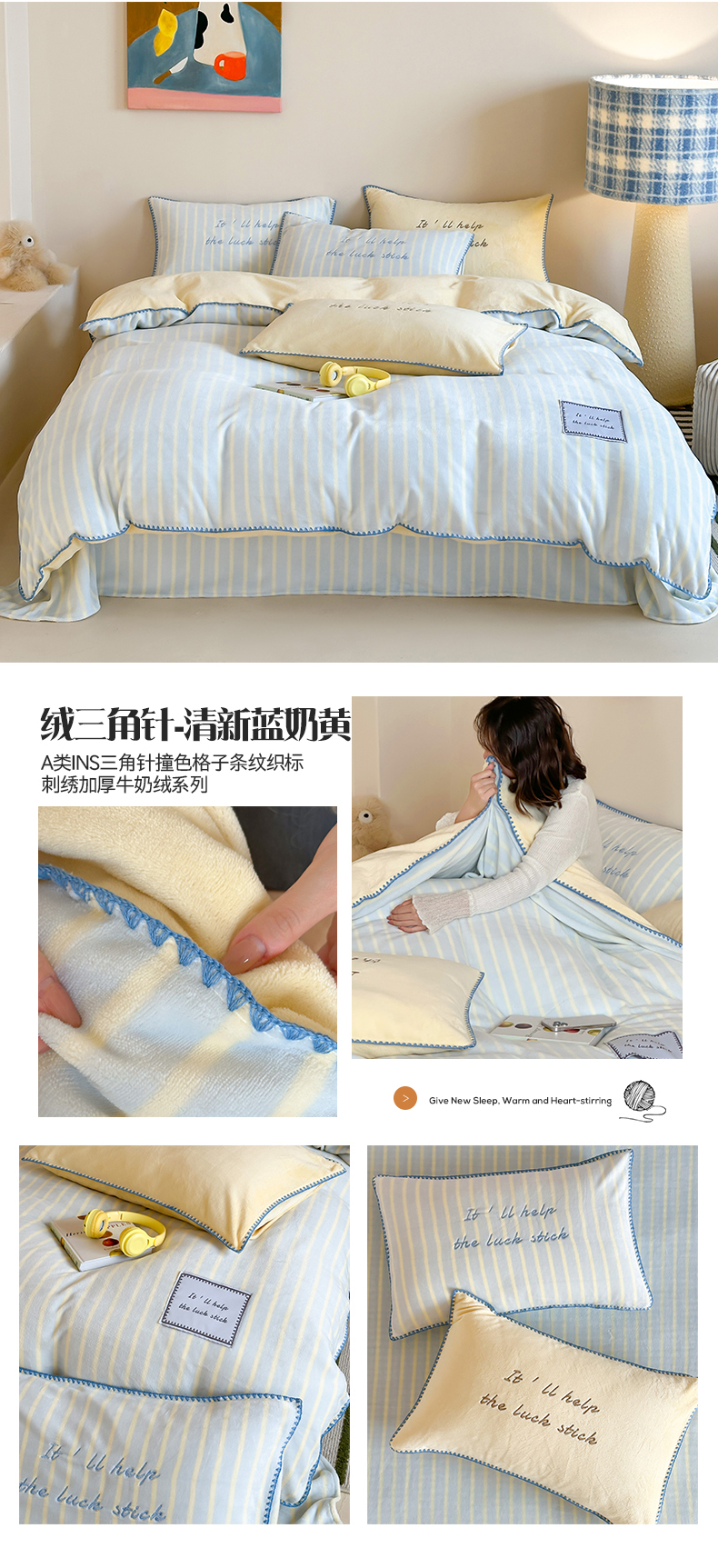 商品名称:桃子家居 2025新款A类ins三角针撞色格子条纹织标高级刺绣小清新加厚牛奶绒系列四件套 绒三角针-茉莉海盐