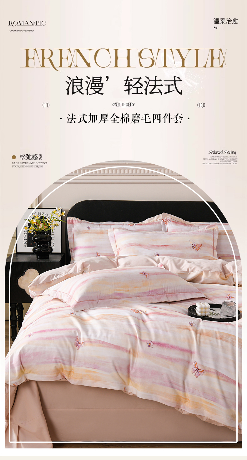 当前位置: 91家纺网 > 商品网购 > 床品套件 > 四件套 > 全棉普通四件套 > 金昱纺 2025新款法式加厚全棉纯棉磨毛四件套 星河蝶影-粉