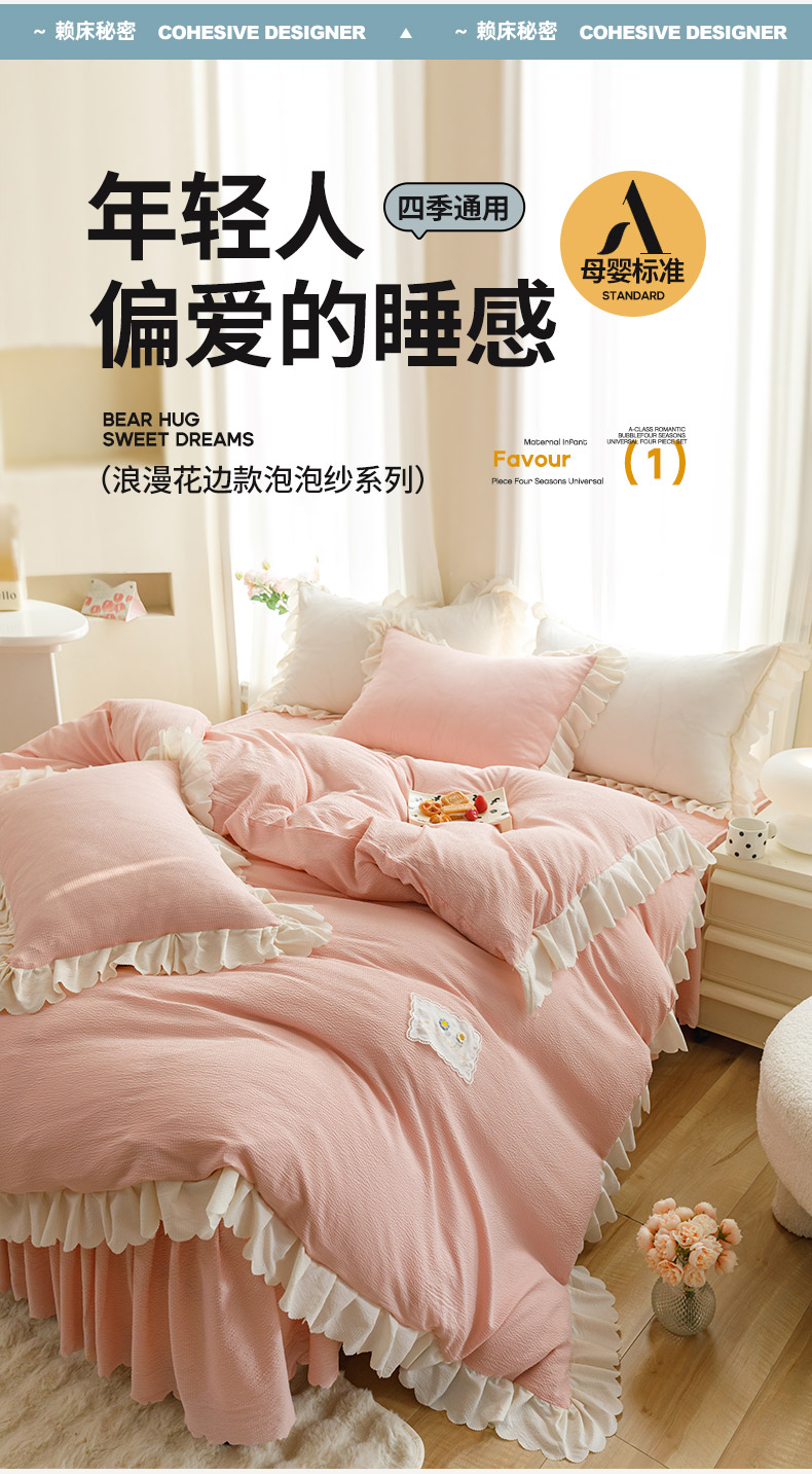 当前位置: 91家纺网 > 商品网购 > 床品套件 > 四件套 > 其它四件套 > 丝印良品 2025新款四季款夹棉泡泡纱床裙床笠被套四件套系列 玉色