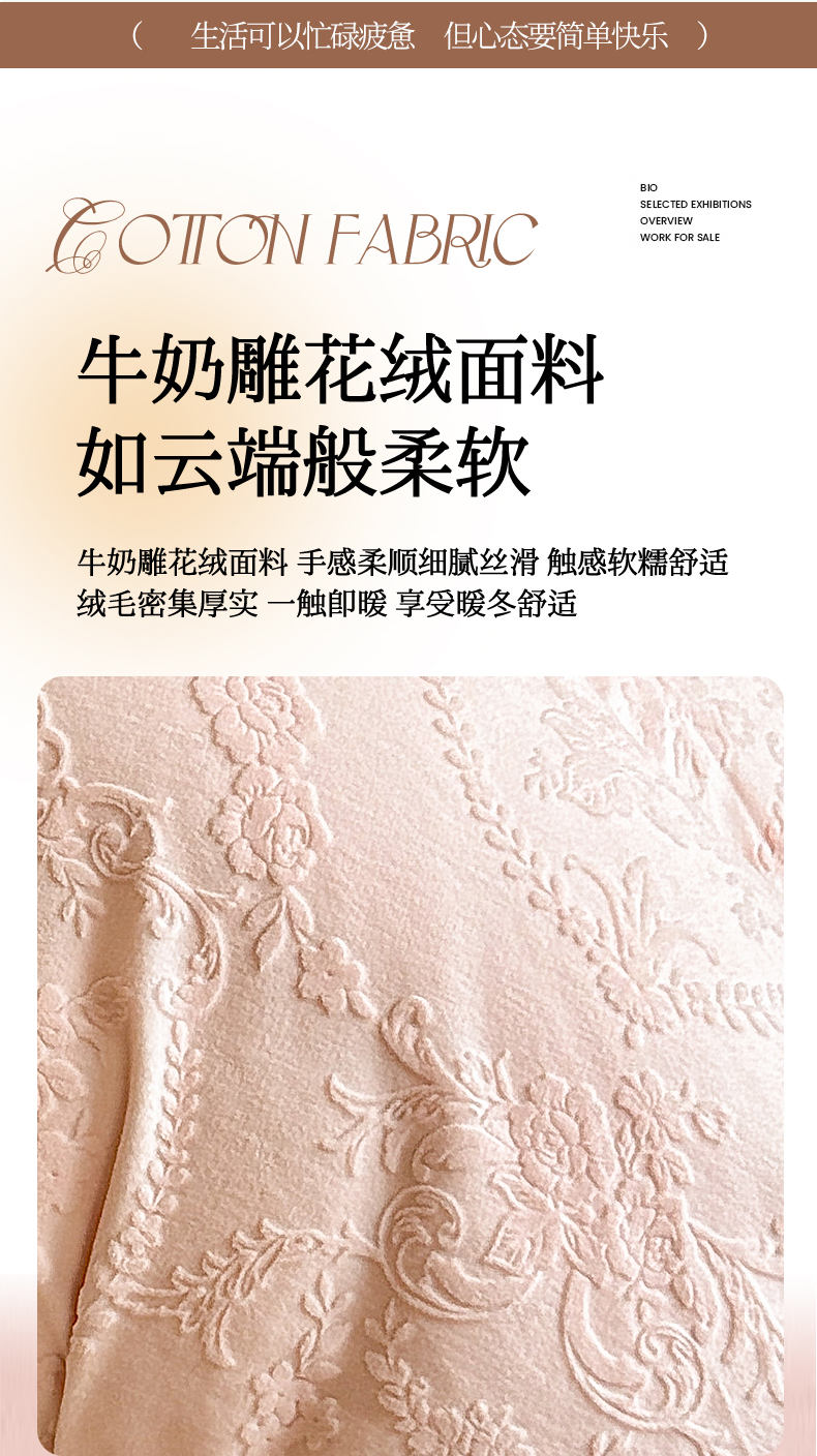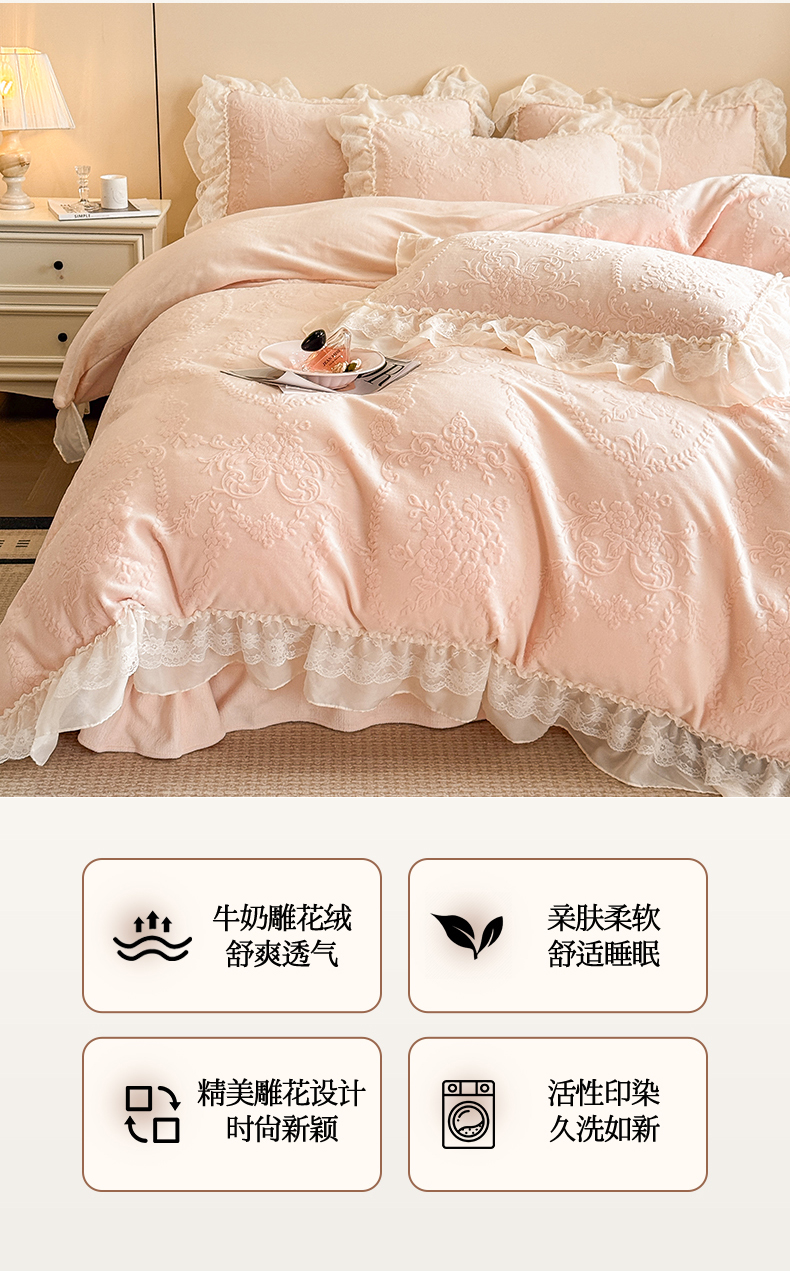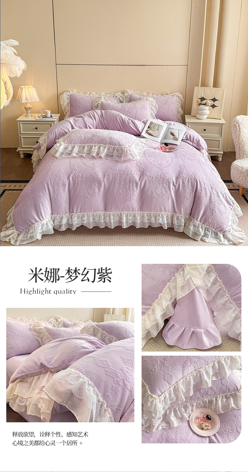 当前位置: 91家纺网 > 商品网购 > 床品套件 > 四件套 > 牛奶绒四件套 > 爱家(原缔乐家纺) 2025新款A类牛奶雕花绒四件套 米娜系列 米娜-梦幻紫