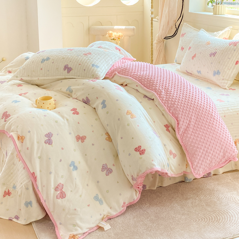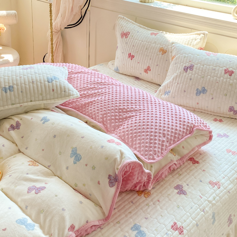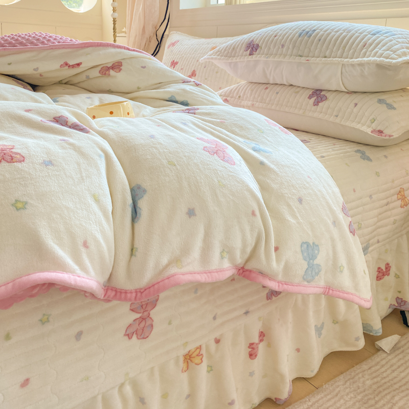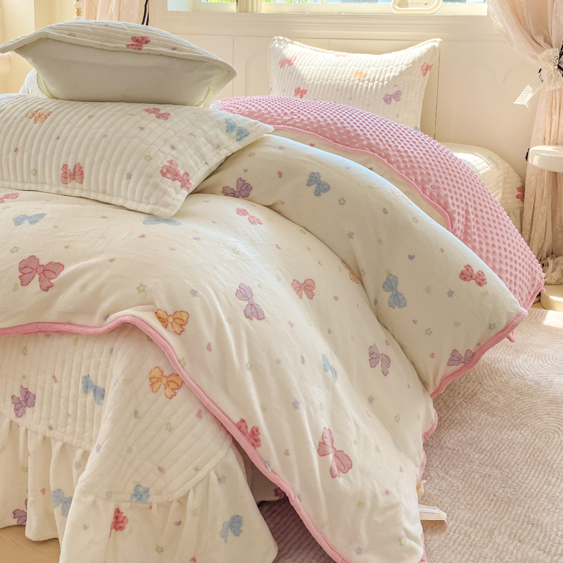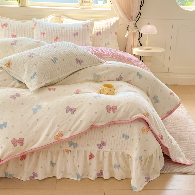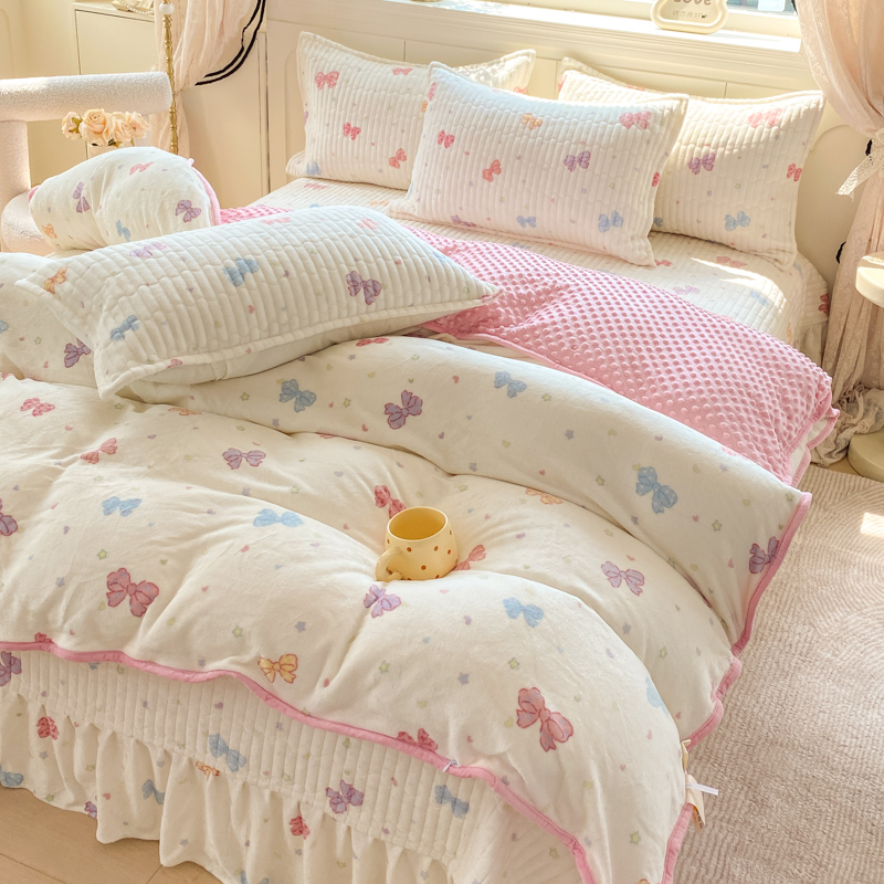 尚美 2025新款豆豆绒牛奶绒大花边床盖四件套(床盖花边随机) 彩色蝴蝶结米