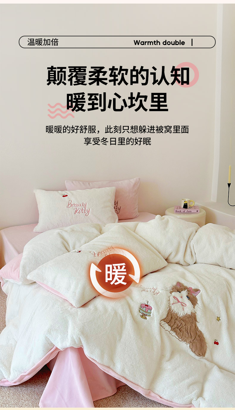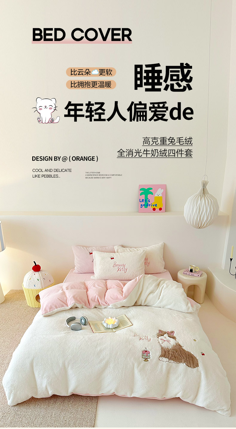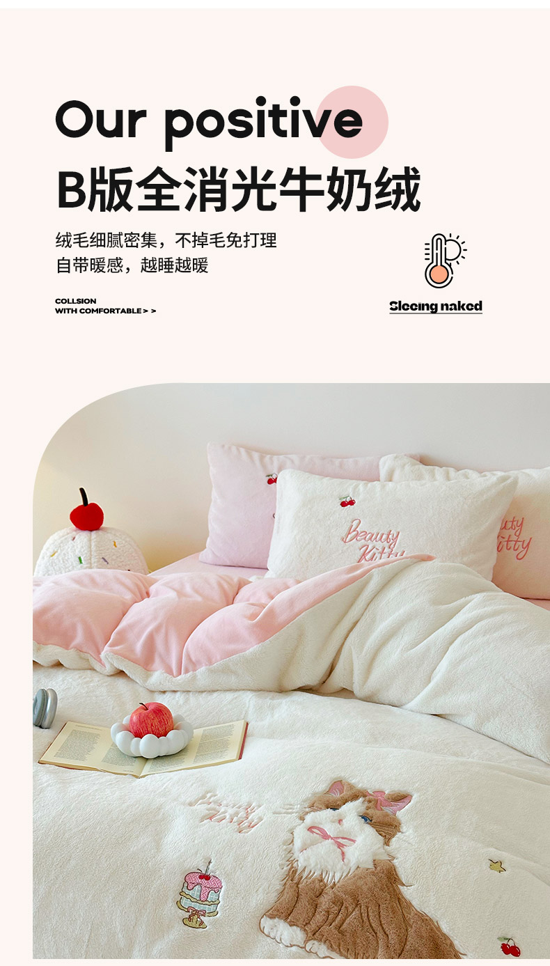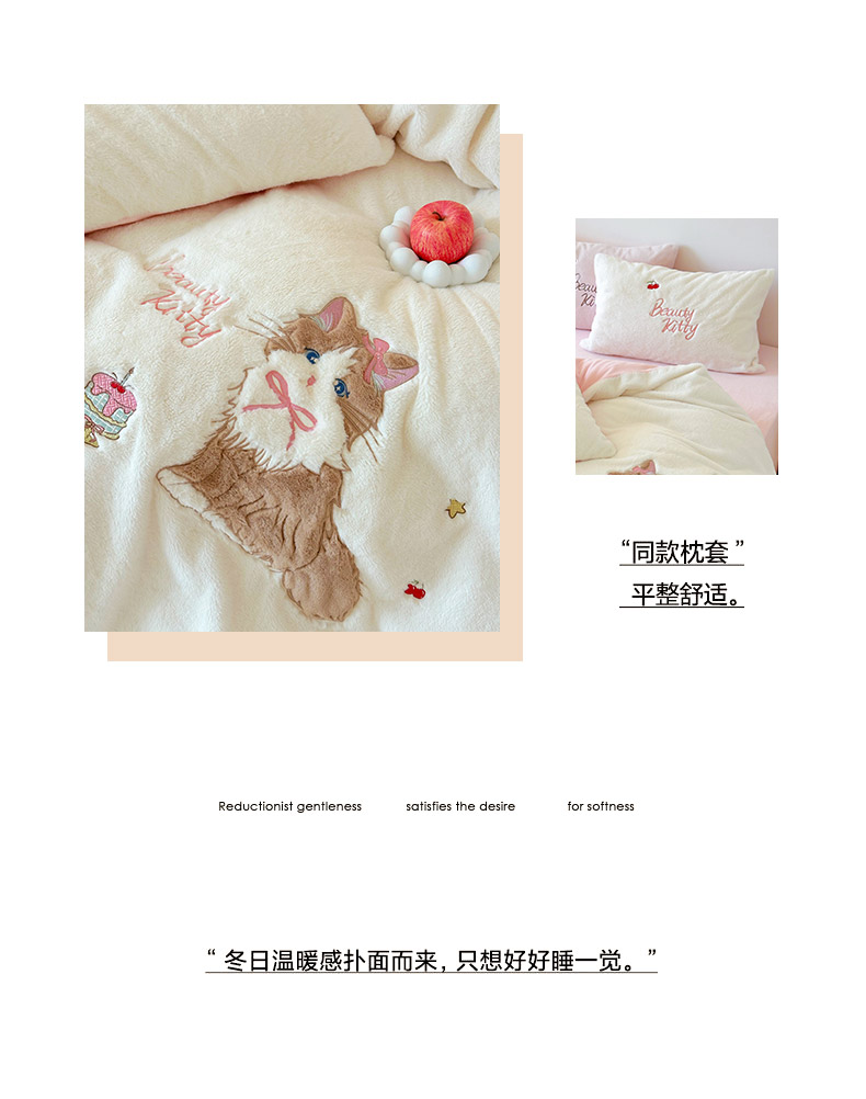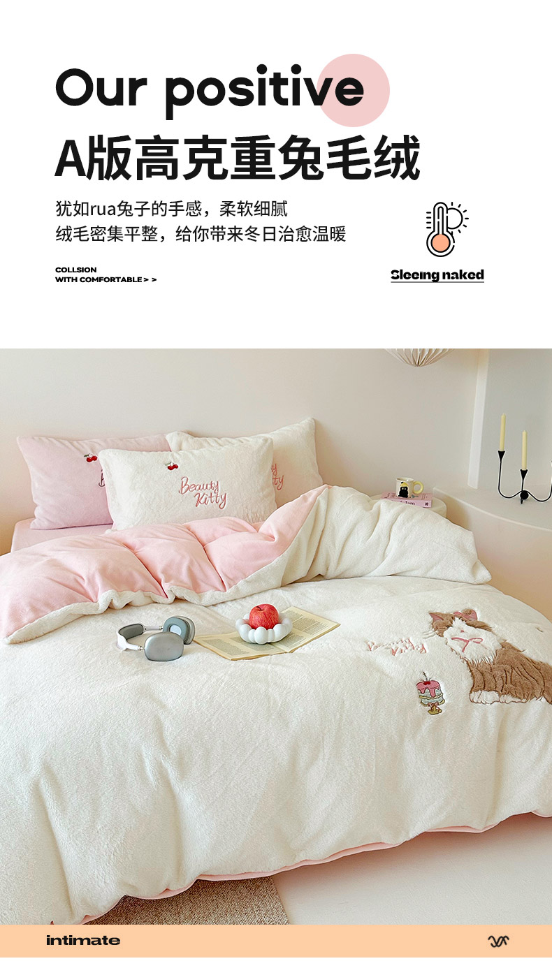 当前位置: 91家纺网 > 商品网购 > 床品套件 > 四件套 > 兔毛绒四件套 > 乐坊 2025新款300g高克重兔绒卡通贴布绣牛奶绒四件套冬季加厚保暖 萌宠猫咪白粉