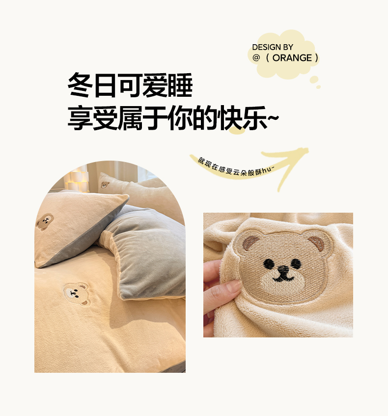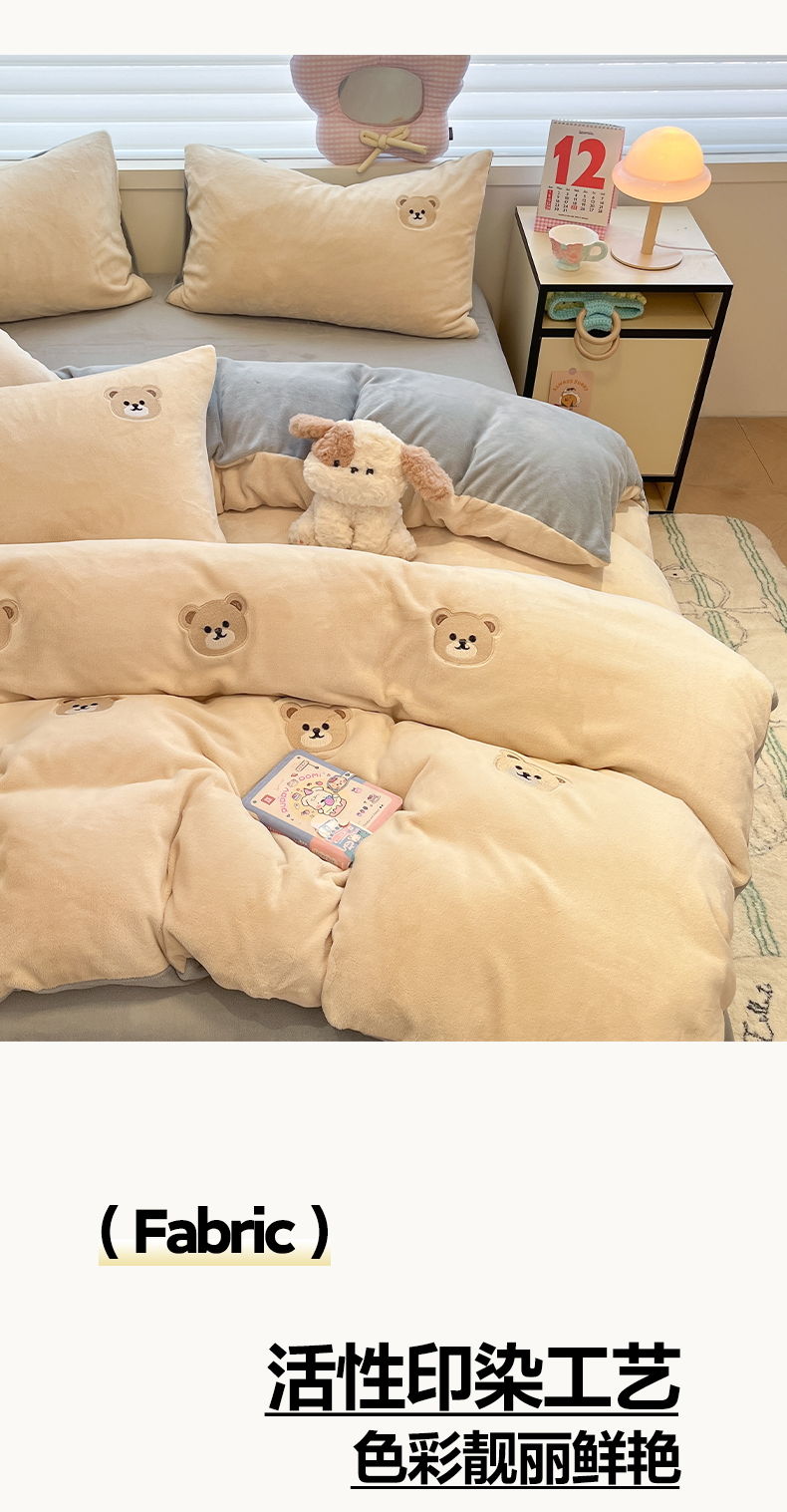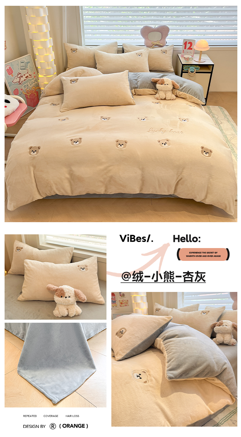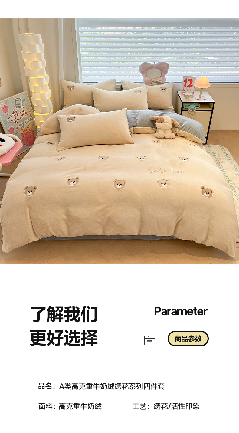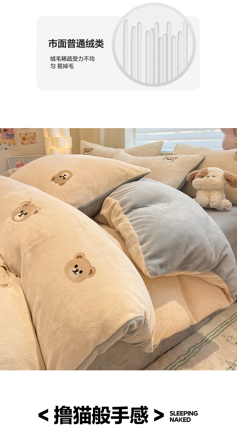商品名称:如一 2025新款200克缸染高克重精绣牛奶绒四件套 绒-小熊-杏灰