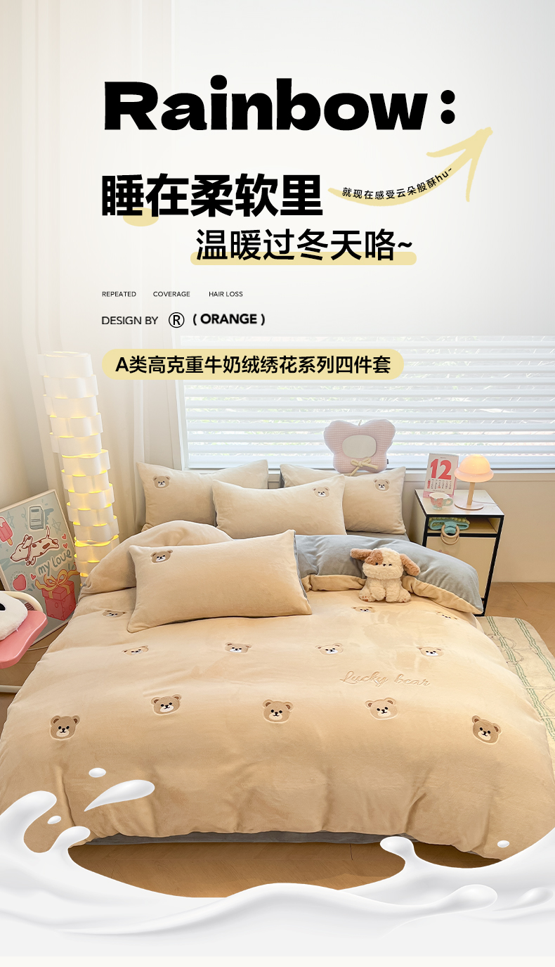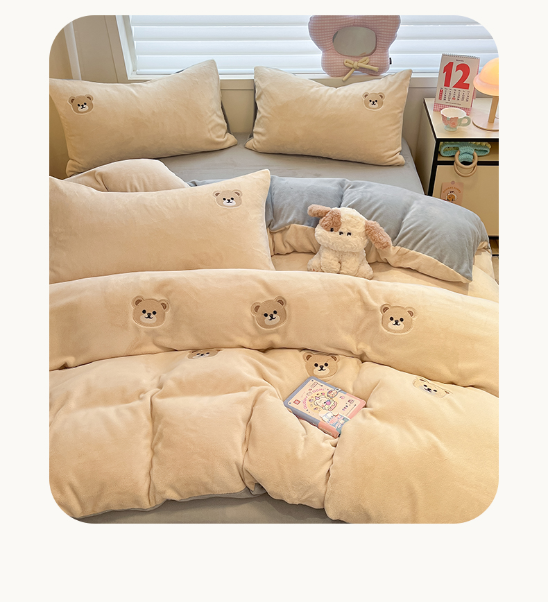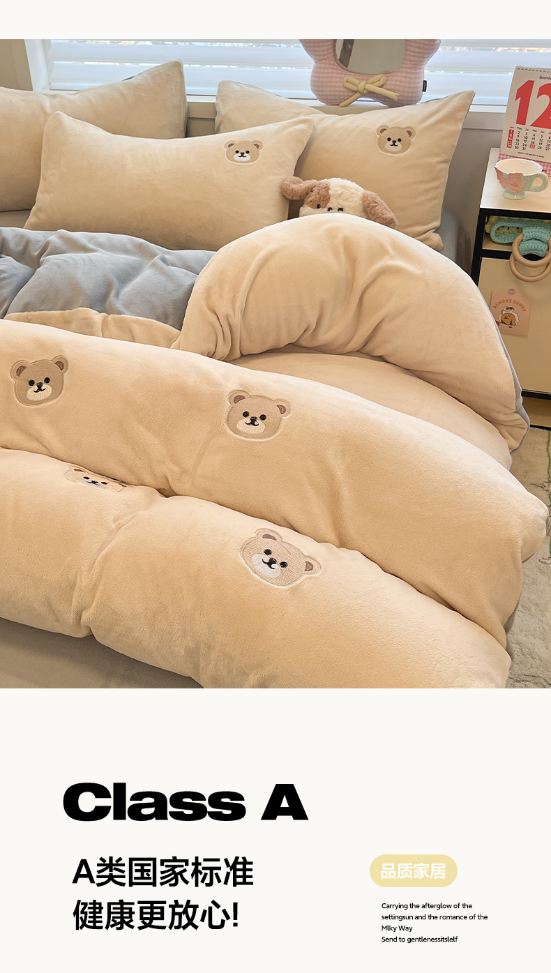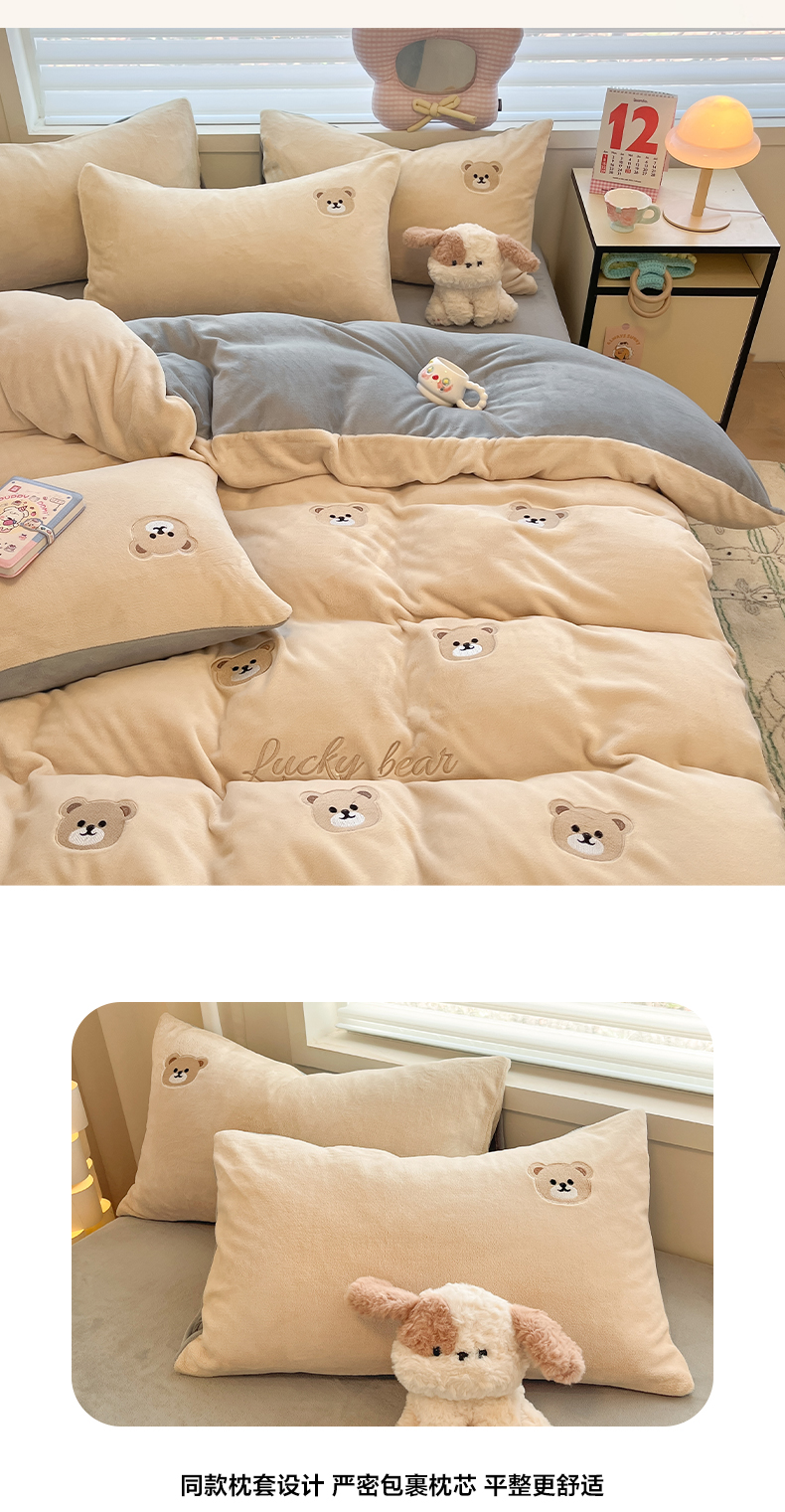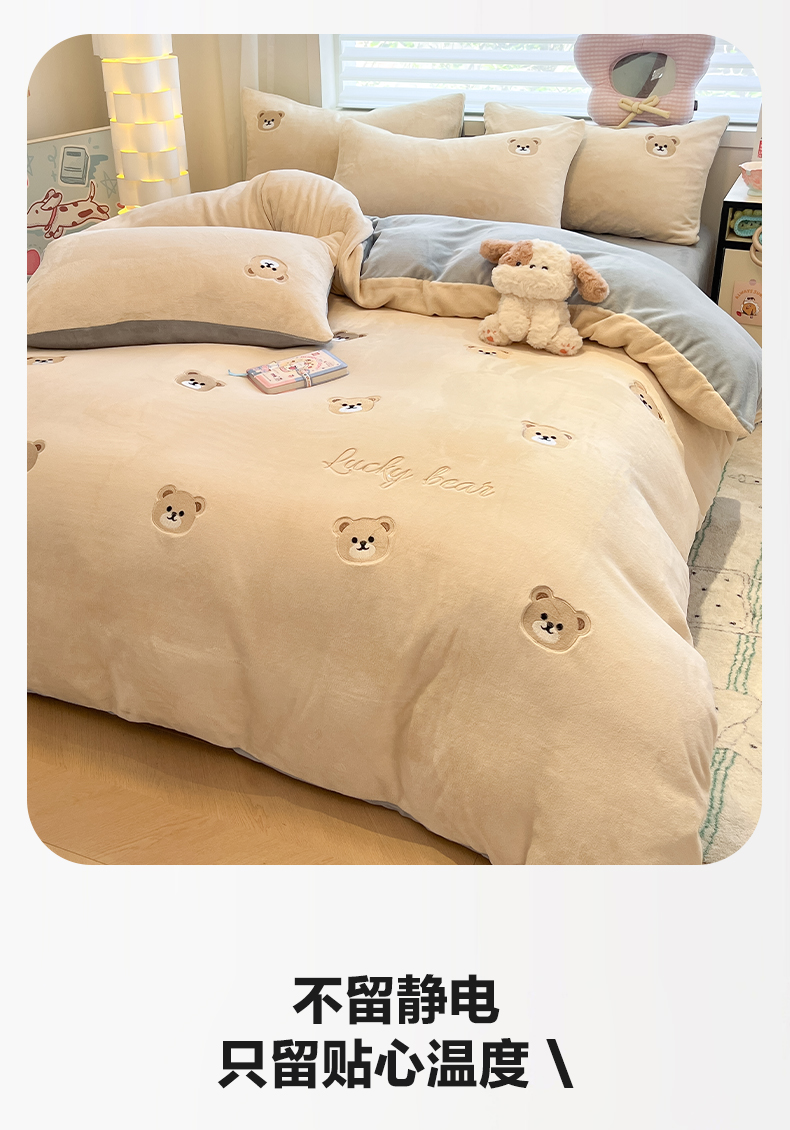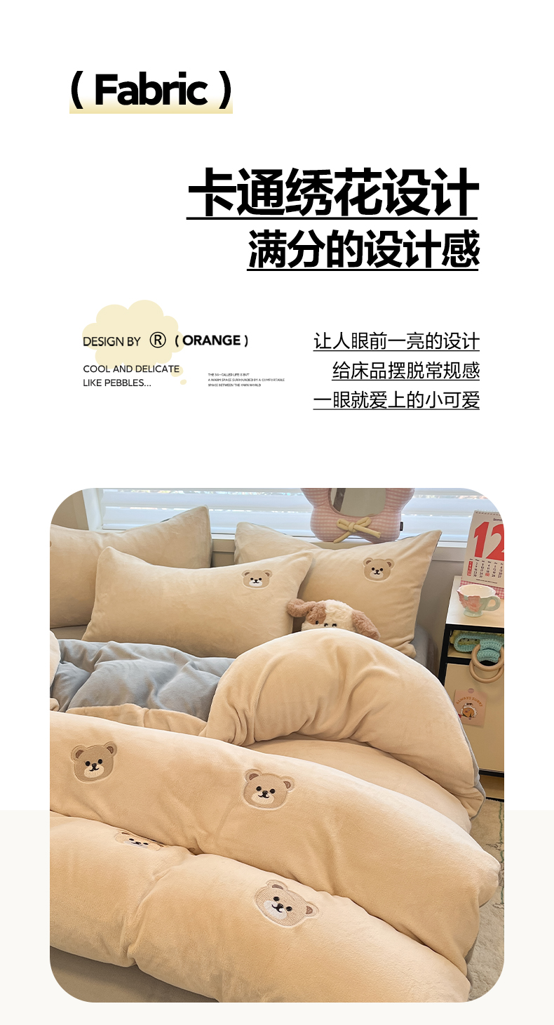 商品名称:如一 2025新款200克缸染高克重精绣牛奶绒四件套 绒-小熊-杏灰