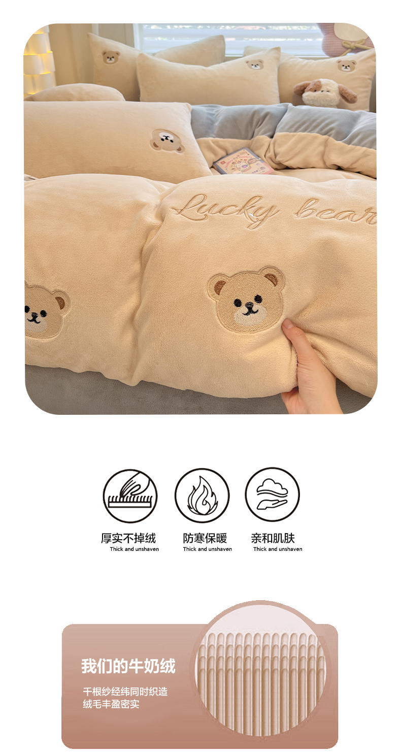 如一 2025新款200克缸染高克重精绣牛奶绒四件套 绒-小熊-杏灰