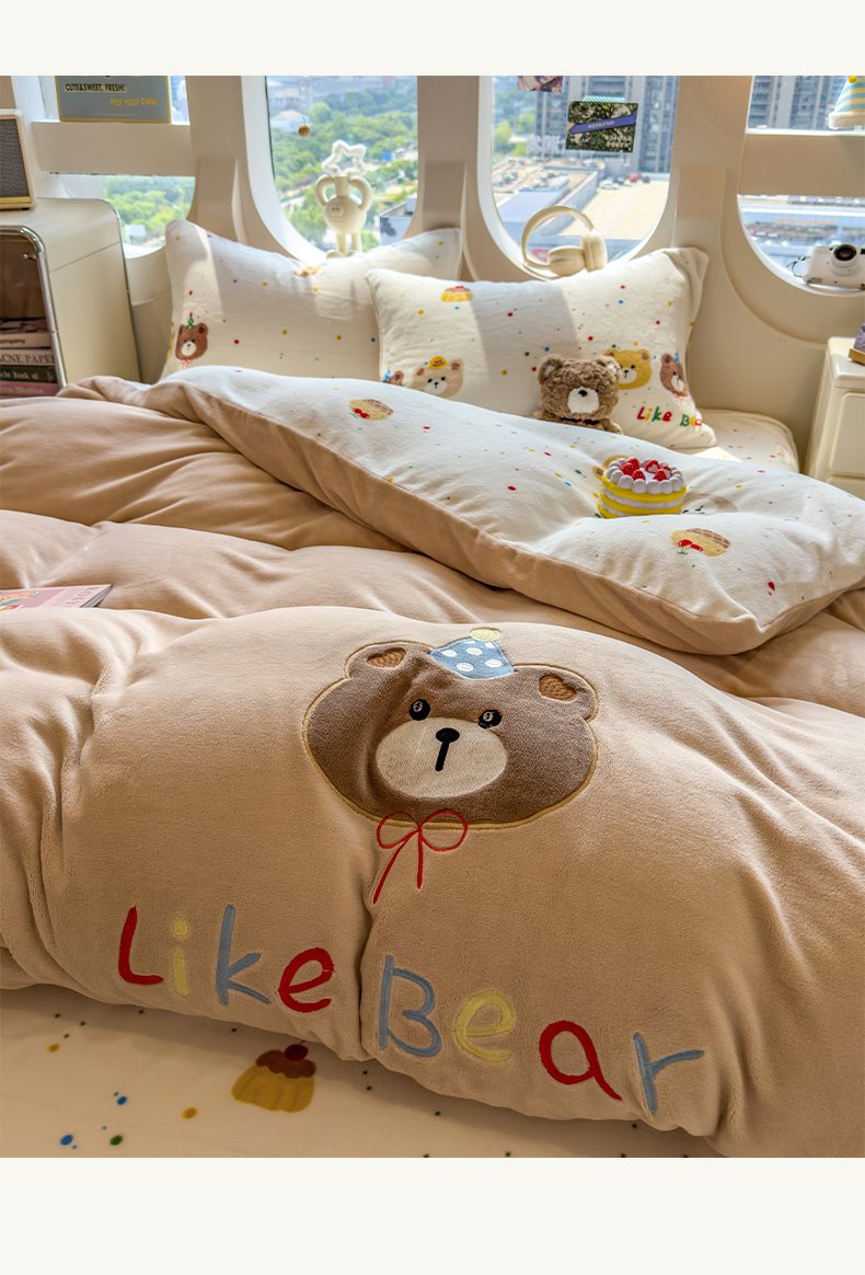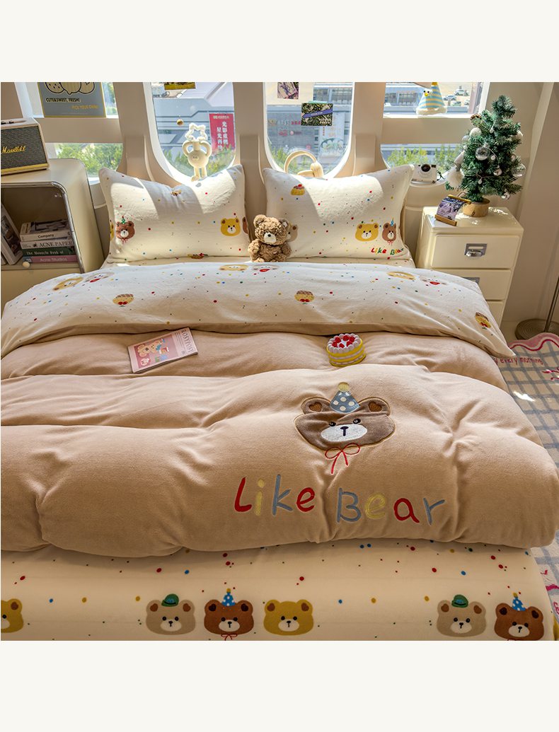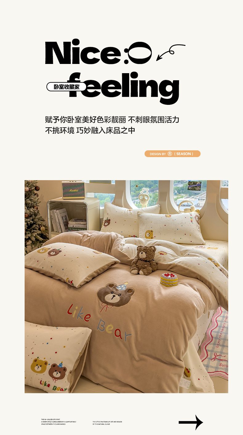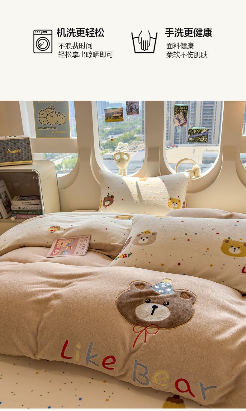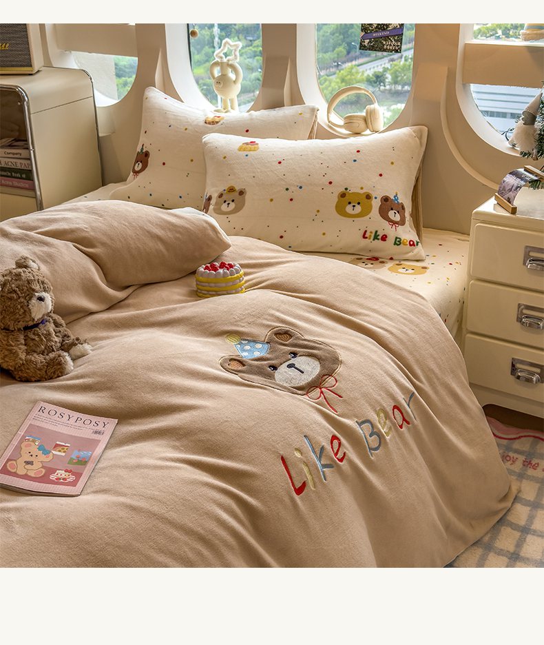 摩妮卡 2025新款卡通牛奶绒刺绣四件套系列 小熊派对日