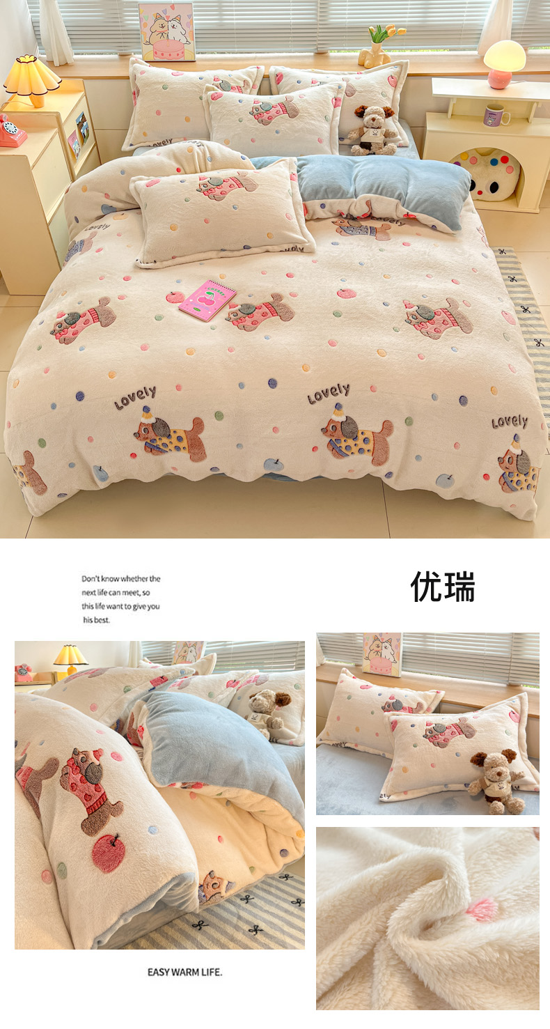 (总)慕尚家纺 2025新款豆豆绒刺绣四件套,大耳狗 白蓝,玫瑰 白粉