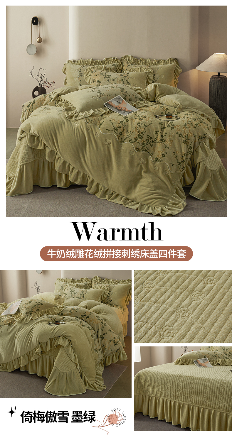 商品名称:宜凡家纺 2025新款牛奶绒雕花刺绣床盖四件套 寒梅絮语 灰