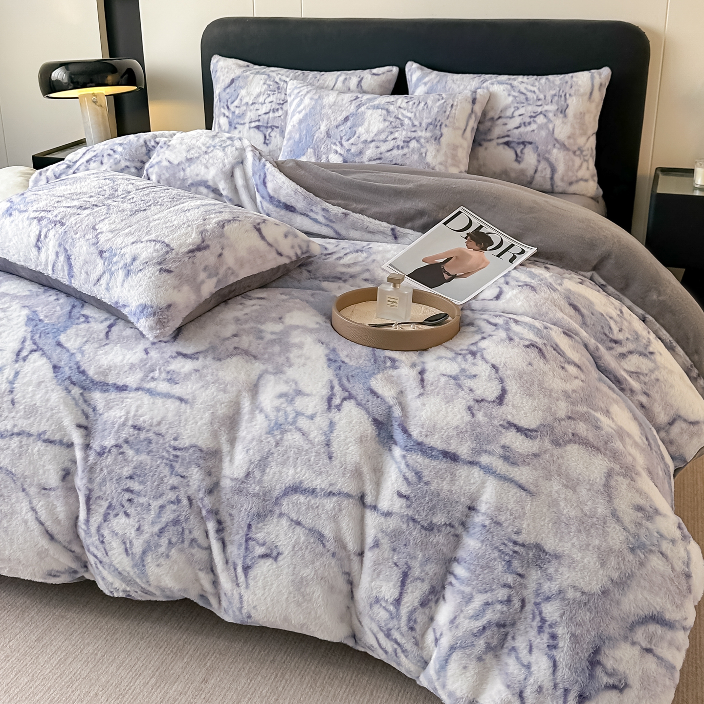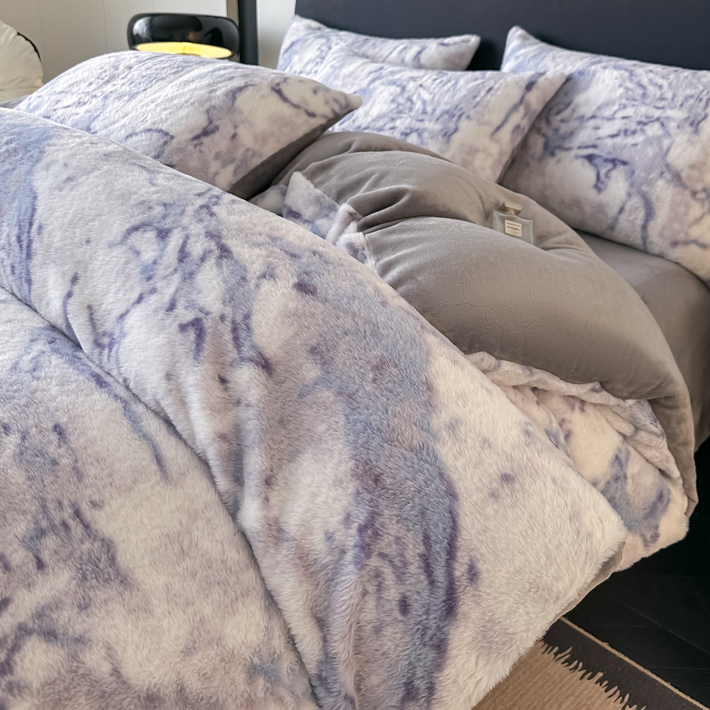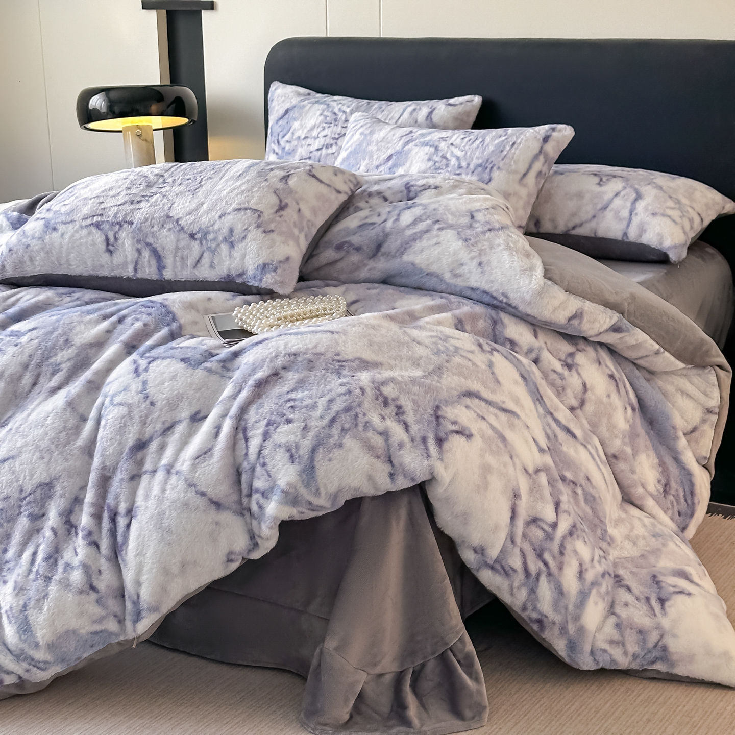鸿羽樱家纺《原伊菲晓》 2025新款美拉德复古印花抽条兔毛绒床裙款四件套 大理石紫