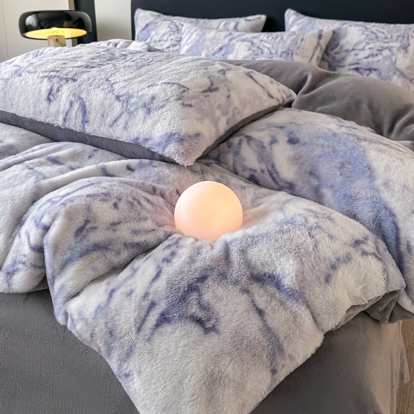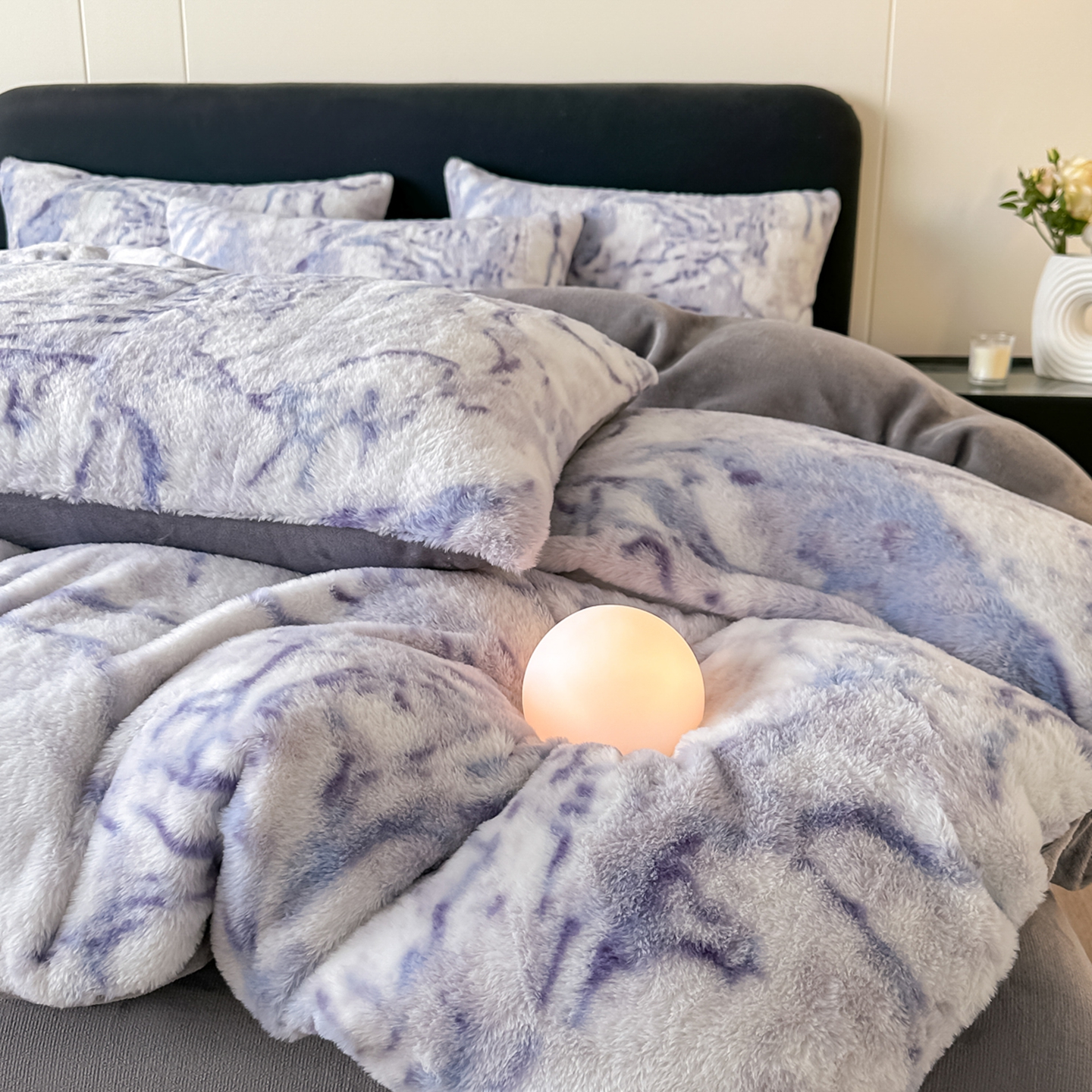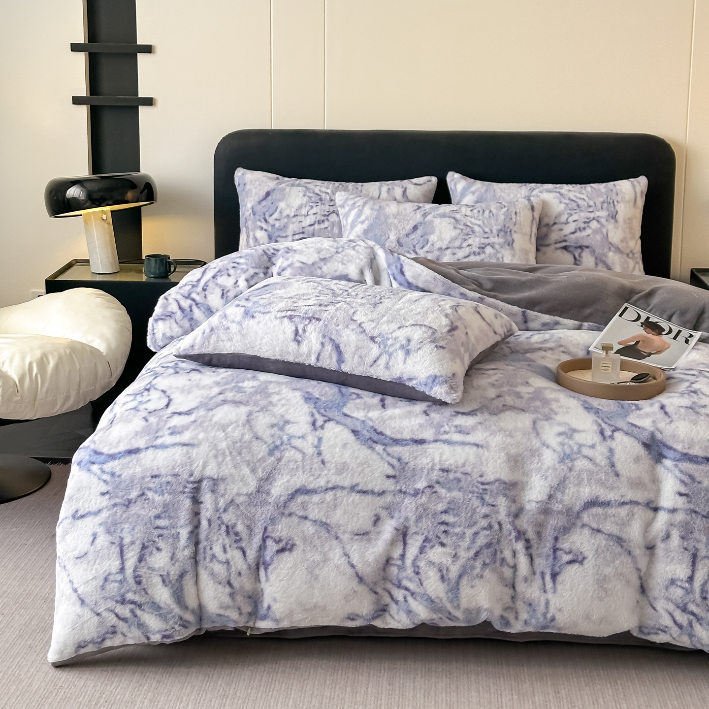 鸿羽樱家纺《原伊菲晓》 2025新款美拉德复古印花抽条兔毛绒床裙款四件套 大理石紫