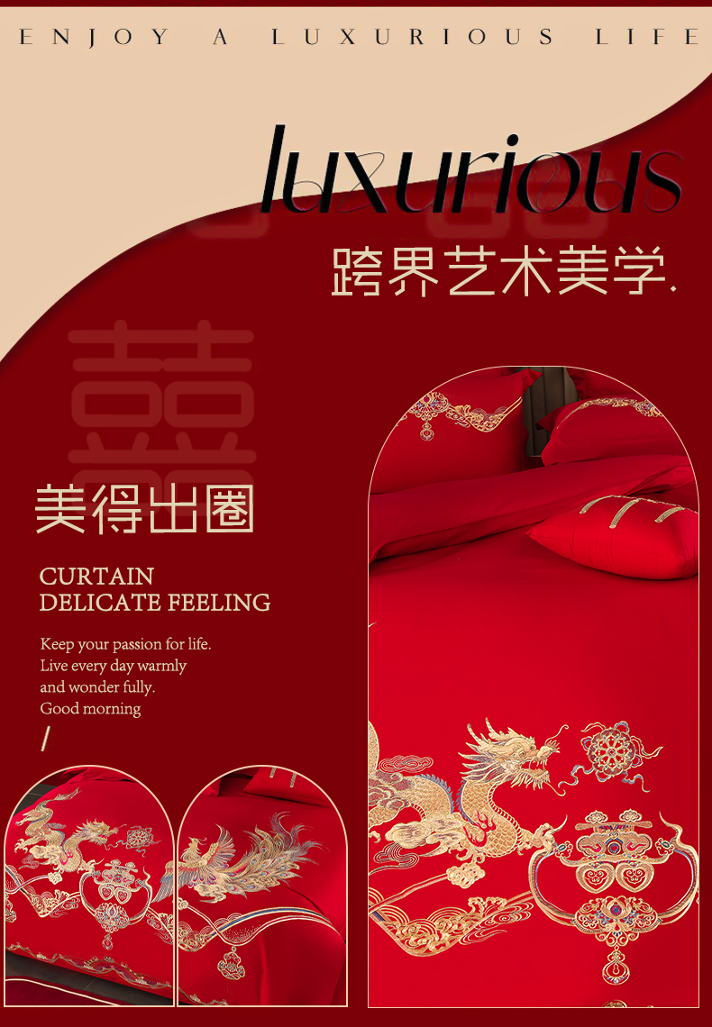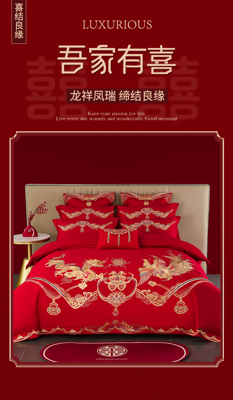 当前位置: 91家纺网 > 商品网购 > 床品套件 > 四件套 > 婚庆四件套 > 董成龙家纺 2025新款全棉中式精美绣花工艺婚庆系列四件套多件套 龙凤报喜
