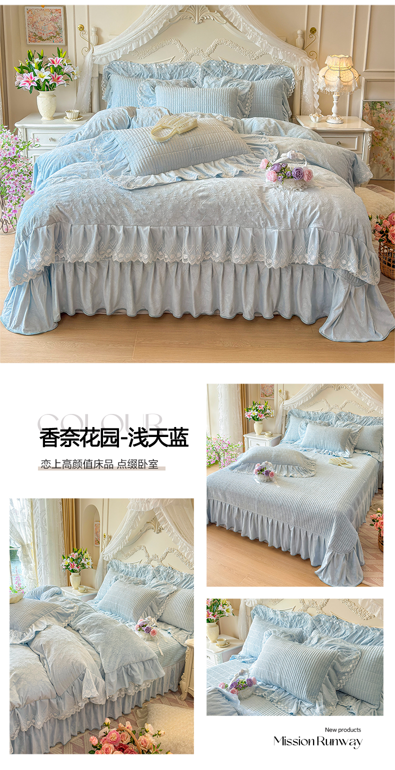 宜凡家纺 2025新款婴儿绒压花夹棉床盖四件套-香奈花园 香奈花园-浅天蓝