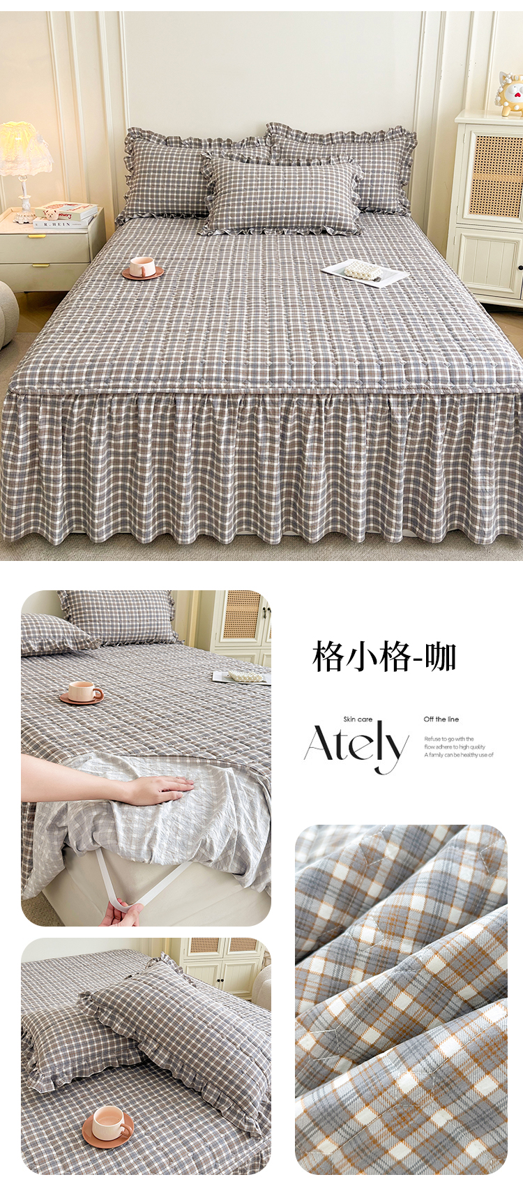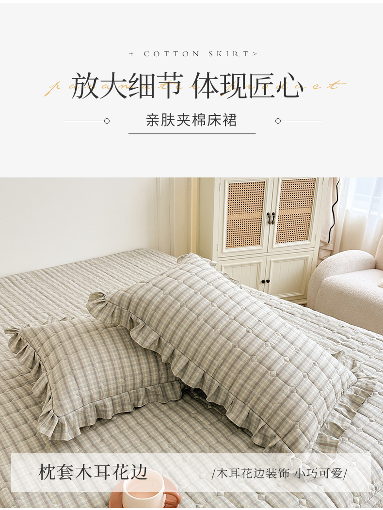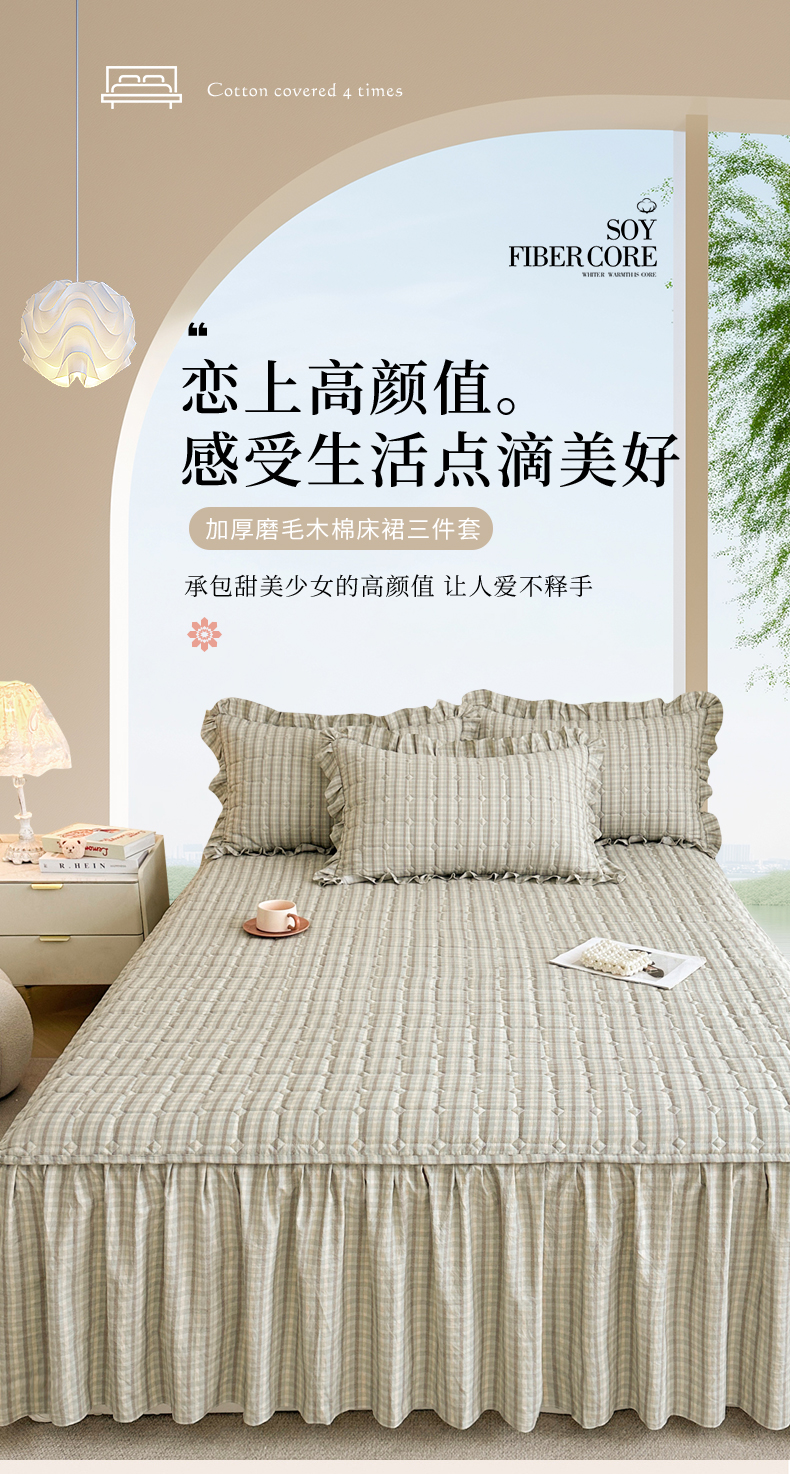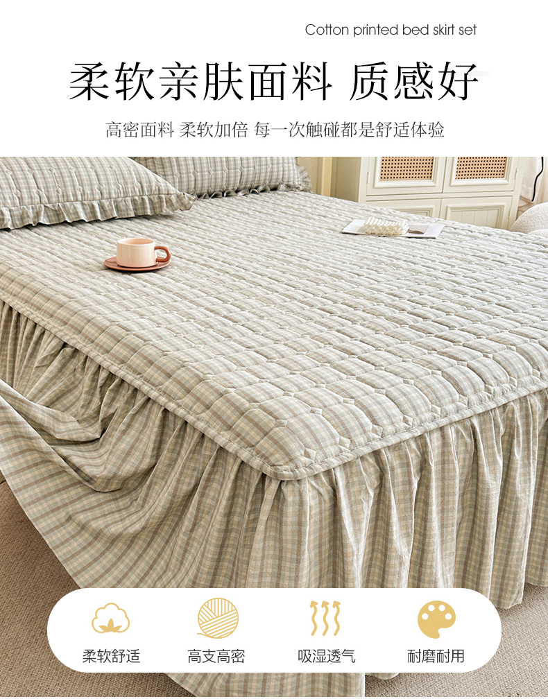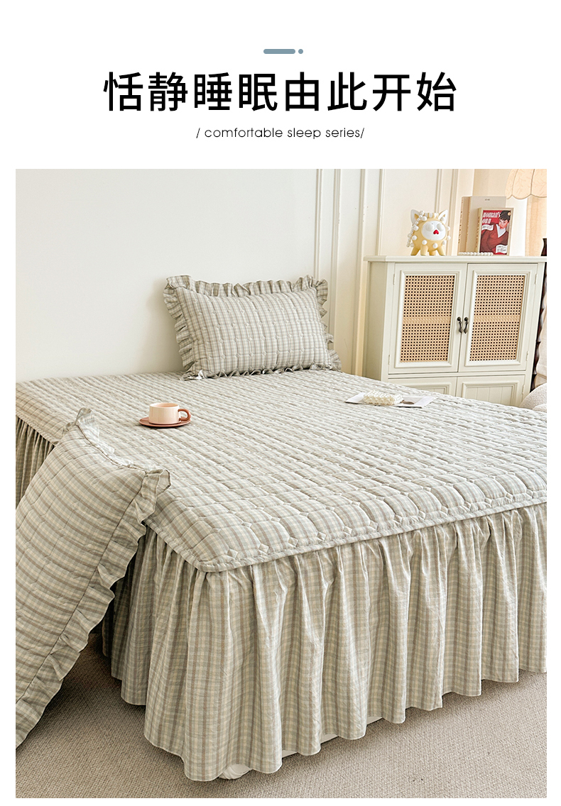 (总)十个点家纺 2025新款加厚磨毛木棉床裙三件套-格小格系列,格小格-粉,格小格-金驼,格小格-咖,格小格-兰,格小格-绿,格小格-玉