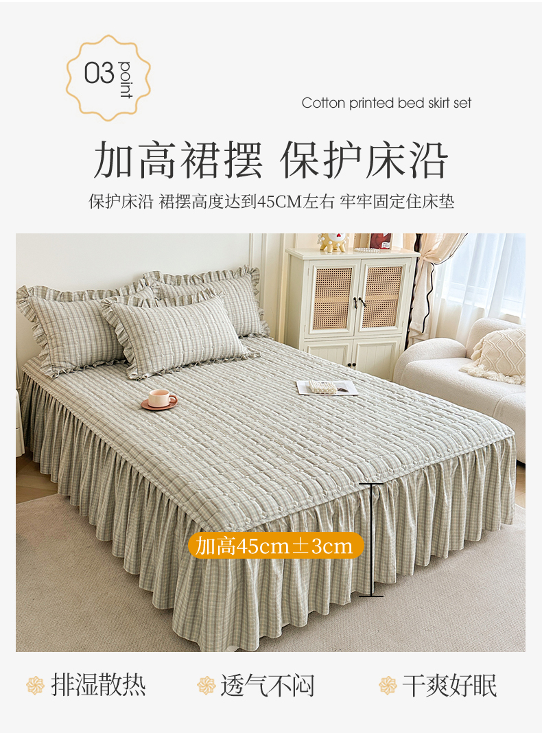 商品名称:十个点家纺 2025新款加厚磨毛木棉床裙三件套-格小格系列 格小格-绿
