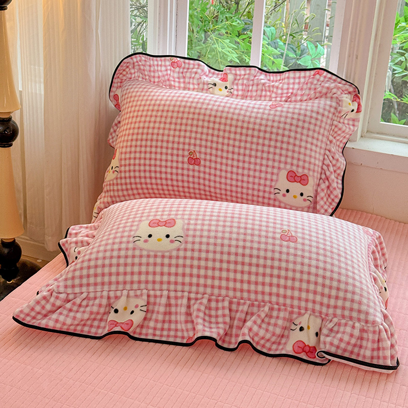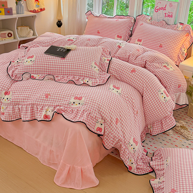 商品名称:梦莱斯 2025新款加厚保暖双面牛奶绒四件套-黑色花边款 粉色猫