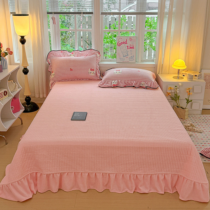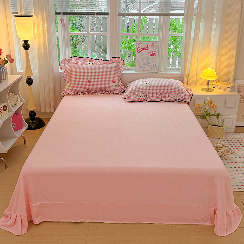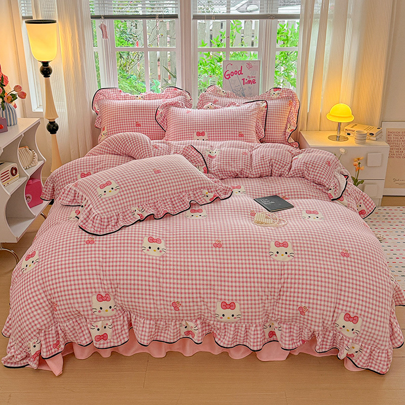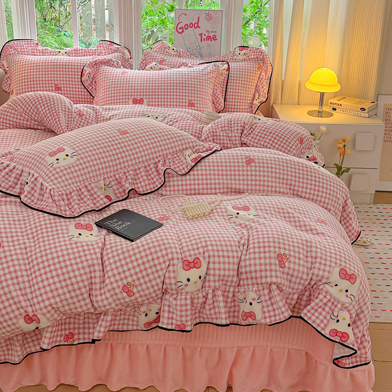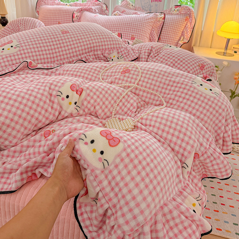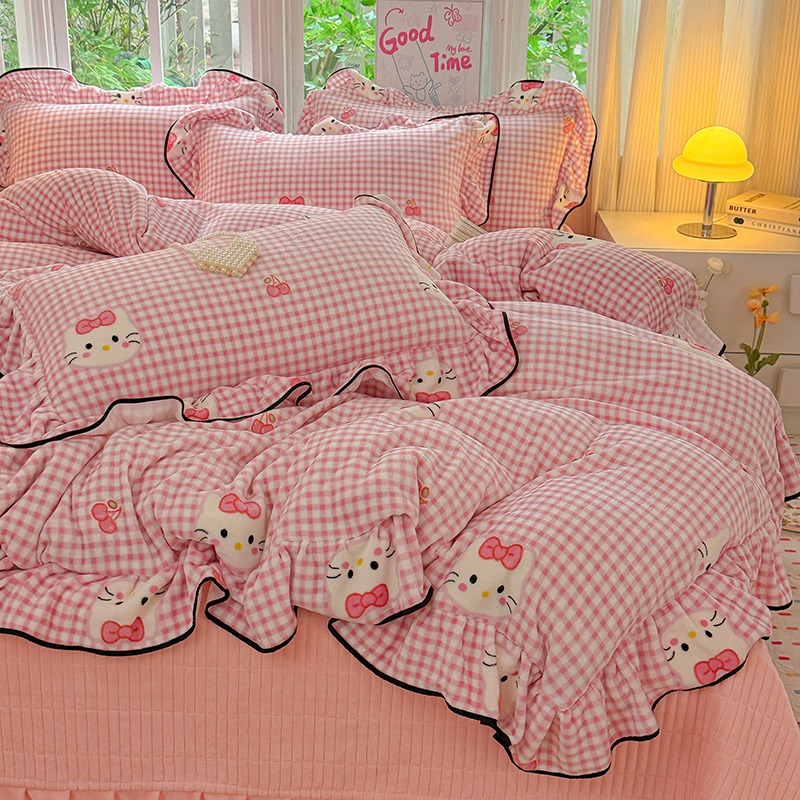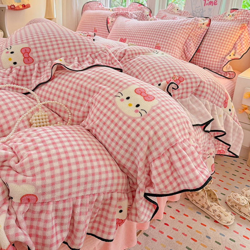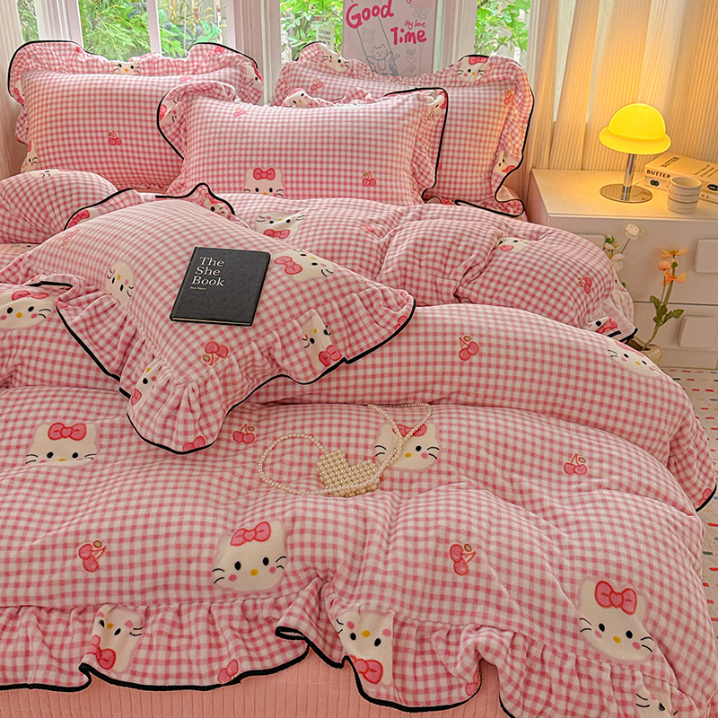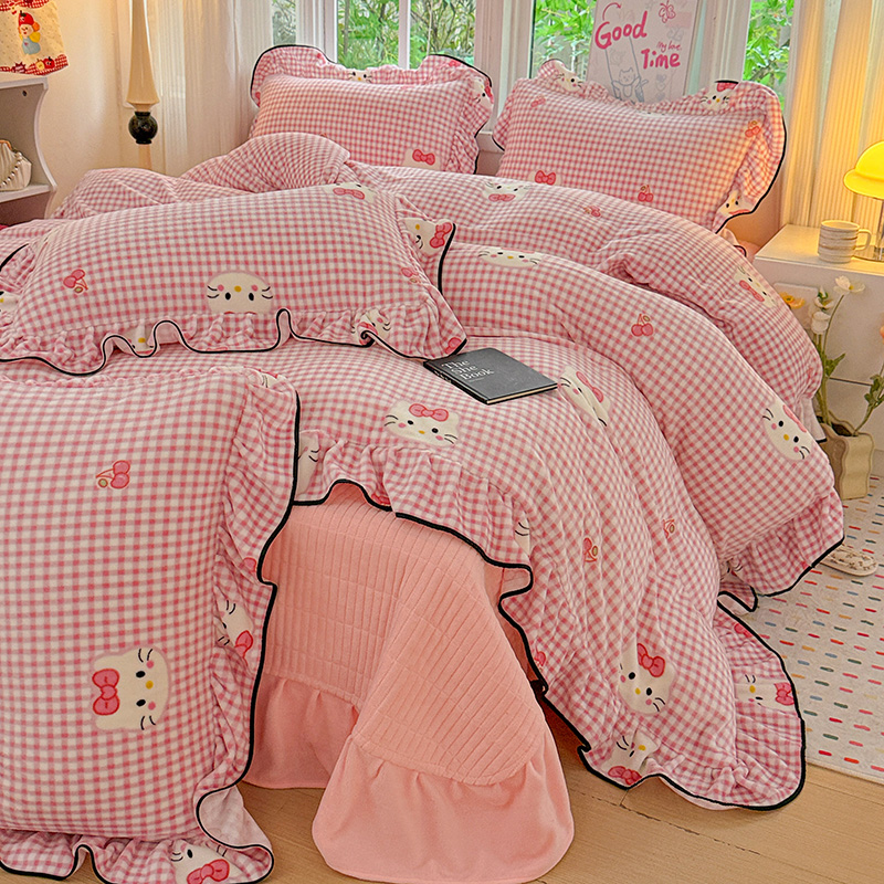 梦莱斯 2025新款加厚保暖双面牛奶绒四件套-黑色花边款 粉色猫