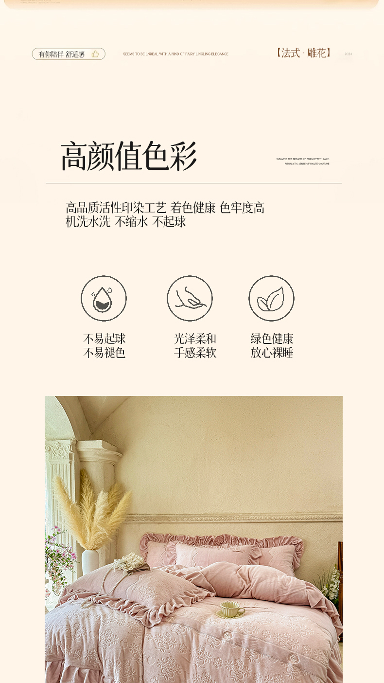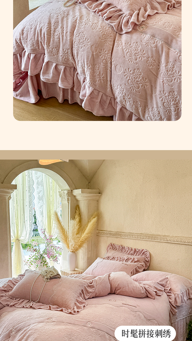 商品名称:宜凡家纺 2025新款牛奶绒雕花拼接刺绣床盖四件套 香槟漫月