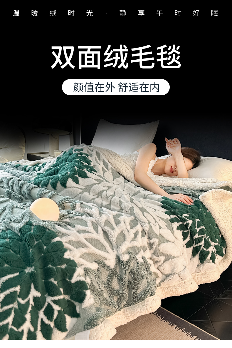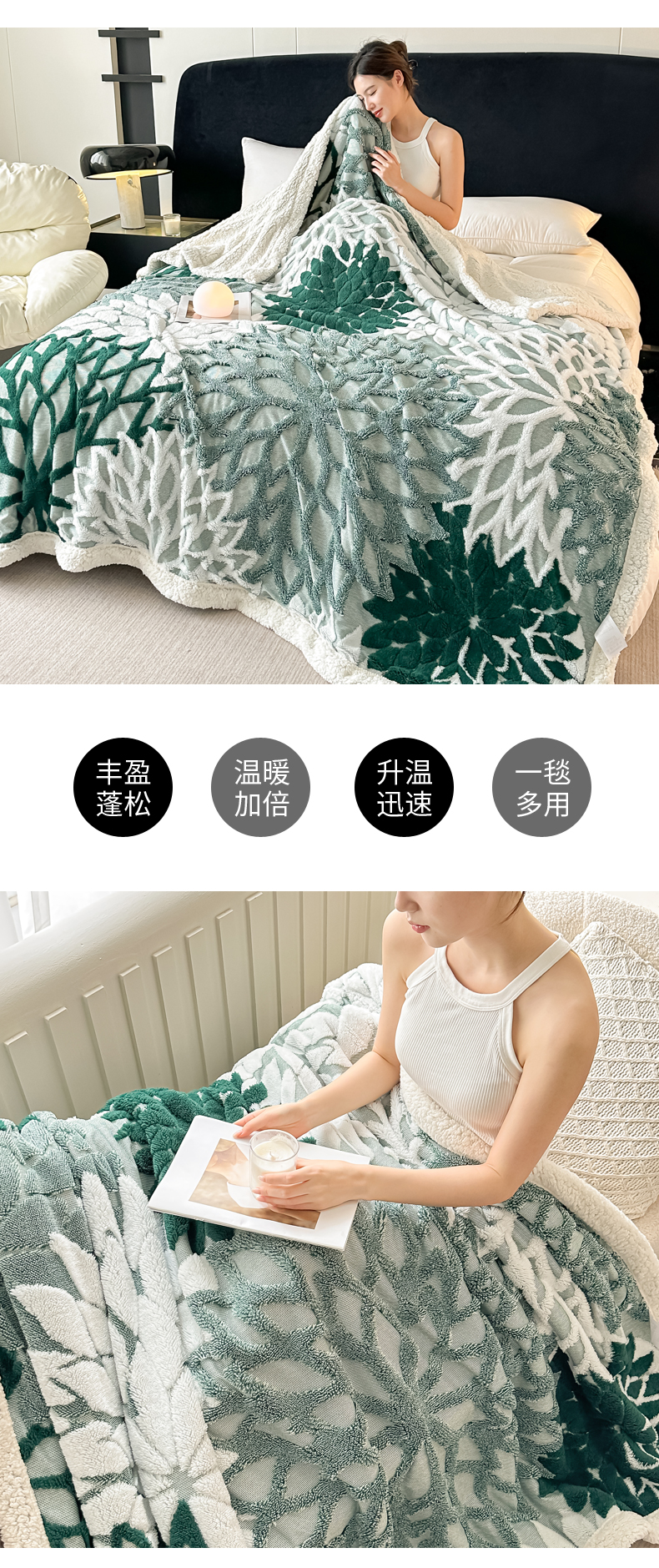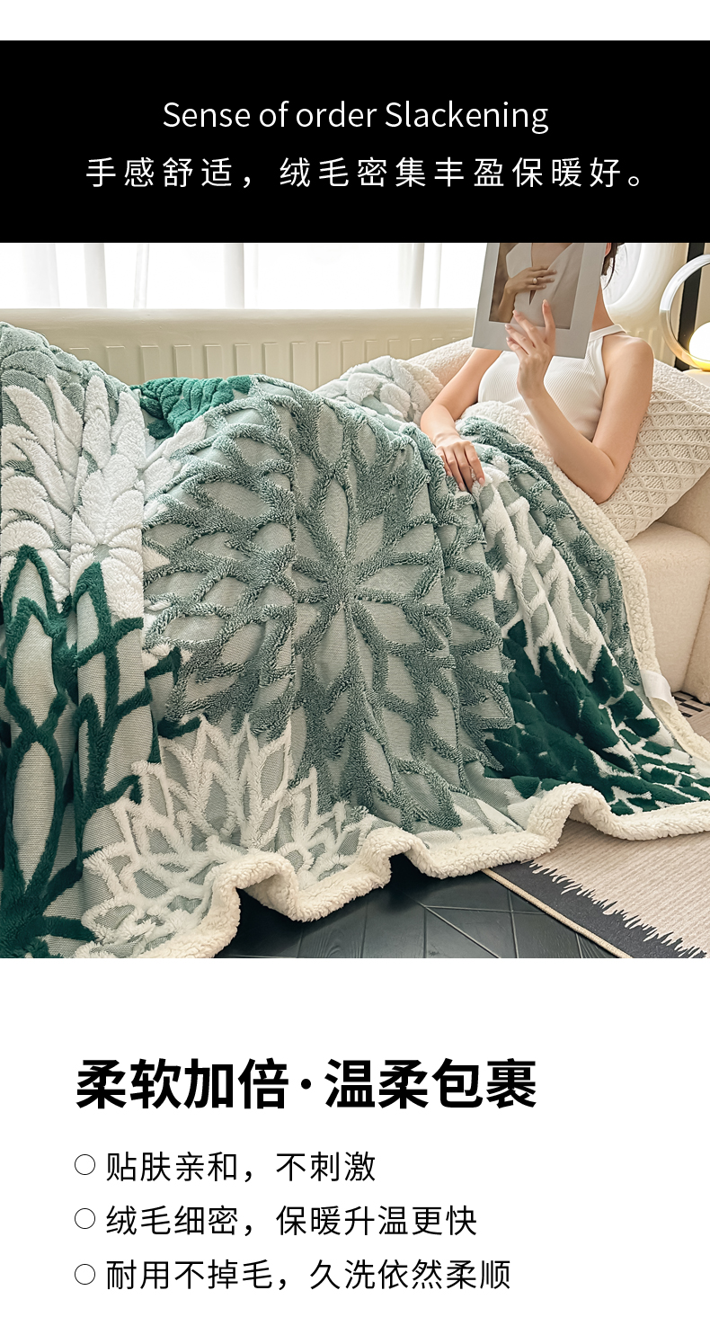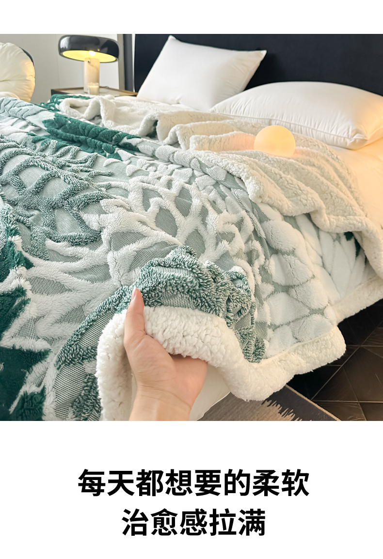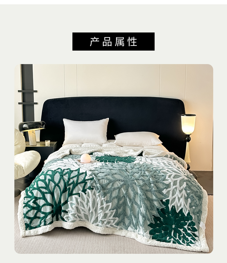 商品名称:丹本家纺 2025新款阳离子提花镂空色织多功能盖毯塔芙绒羊羔绒毛毯毯子 绽放-墨绿